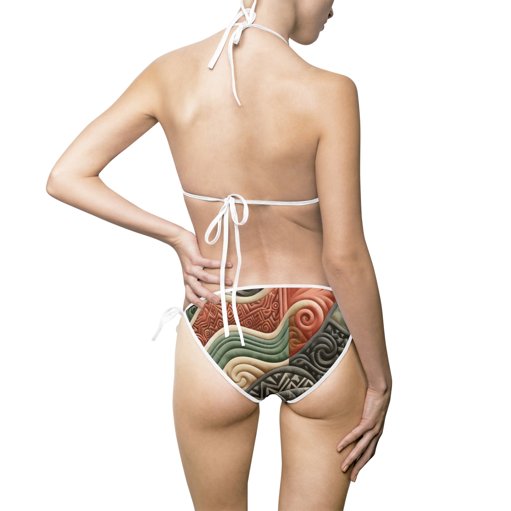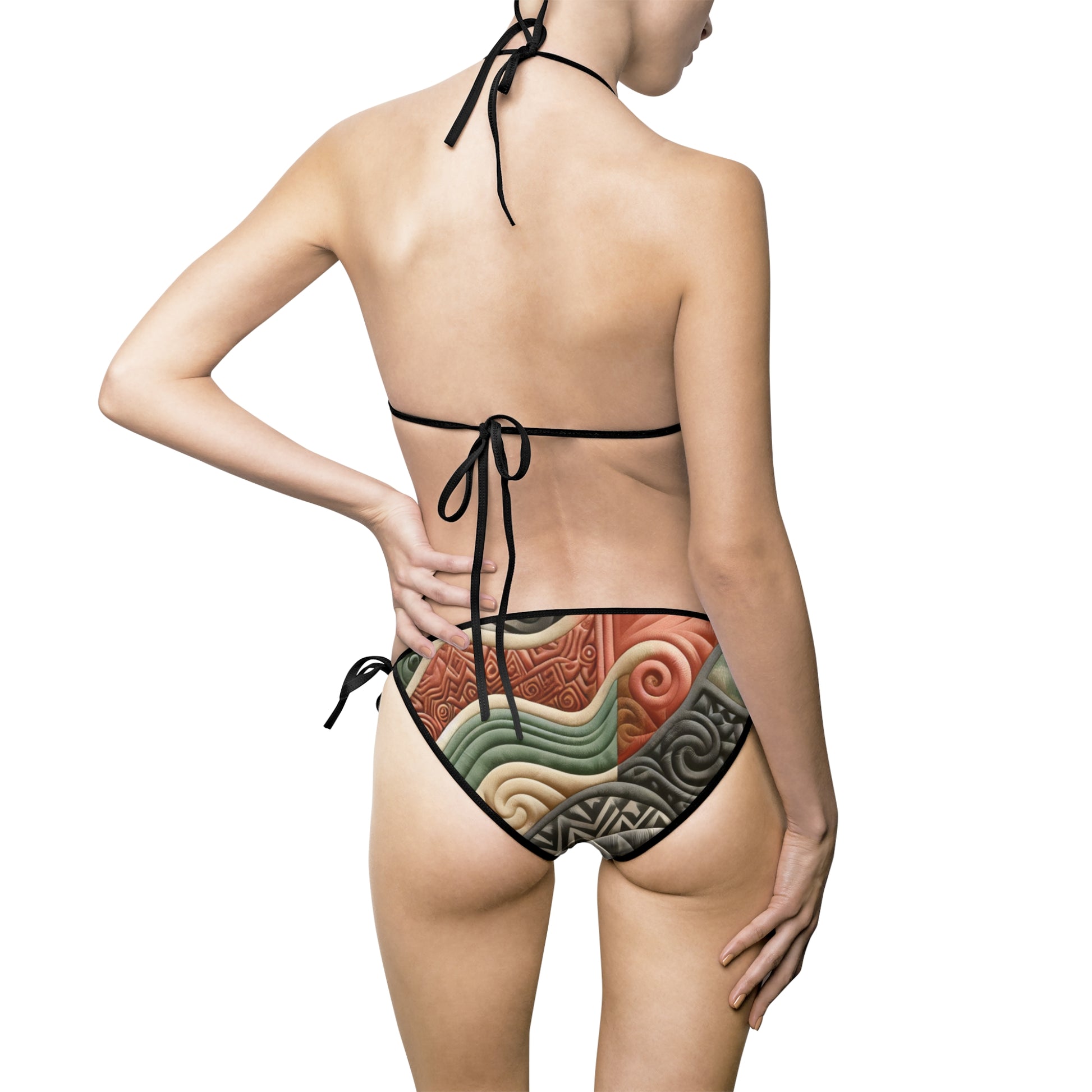 This image features a tapestry of richly textured, flowing patterns, reminiscent of topographical landscapes. Its earth-toned palette gracefully transitions between swirls, waves, and geometric motifs, creating a mesmerizing sense of movement and depth. This bikini swimsuit is designed for fashionable women, it is stylish with a personalized touch. Because of an advanced heat sublimation technique, it will not fade in water.