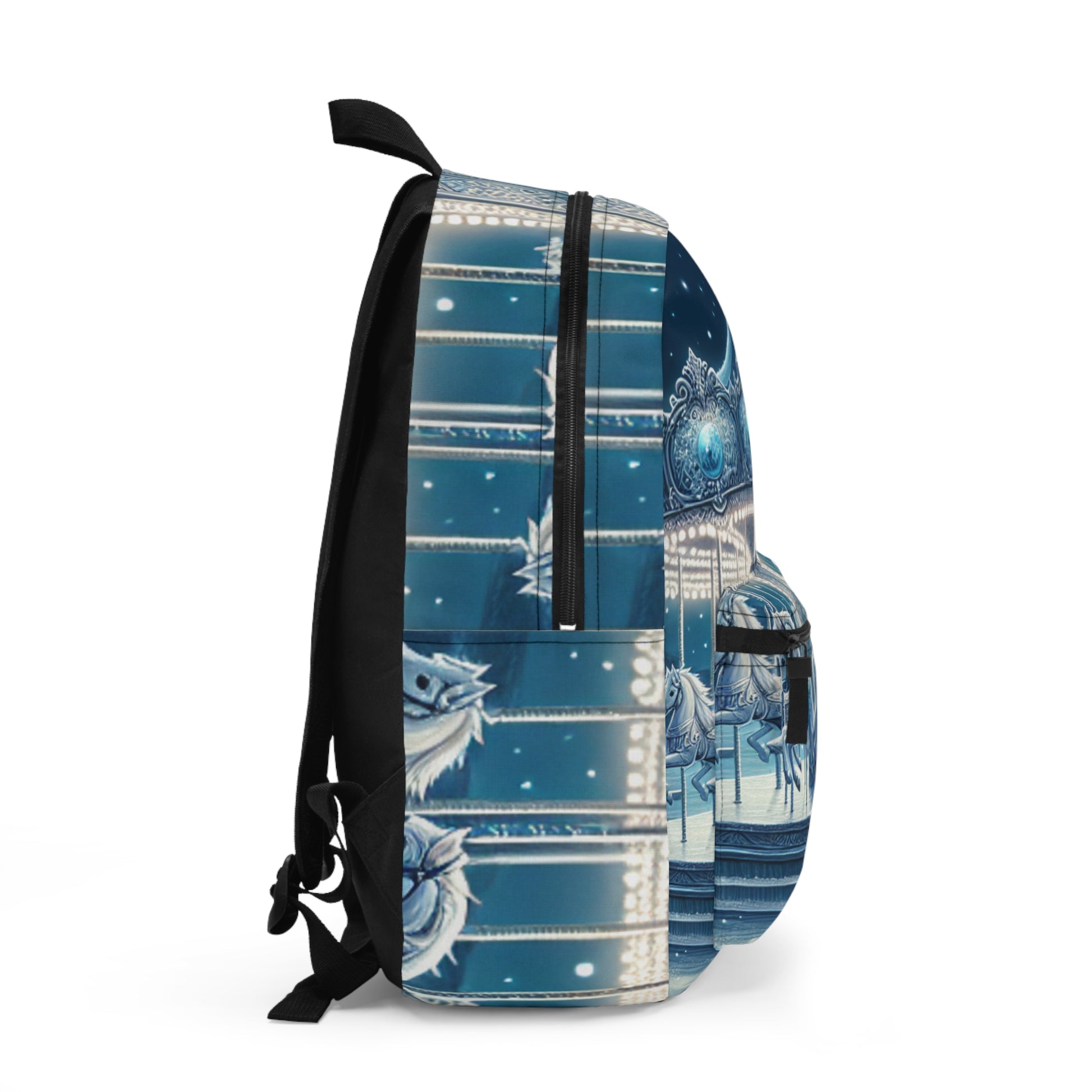 A luminous, frosty carousel glows under a starlit sky, with majestic horses poised mid-gallop. The scene blends fantasy and serenity, with intricate patterns and a radiant moon casting a magical winter aura. Introducing the ultimate backpack for fashion-forward adventurers! Our backpack boasts a striking textile design that will make a statement wherever you go. With its durable construction and spacious compartments, it is perfect for carrying all your essentials. Get ready to turn heads and stay organized with our backpack. #textiledesign #backpack #fashionforward #adventure #durable #spacious #statementpiece #organized #essentials #travel #explore