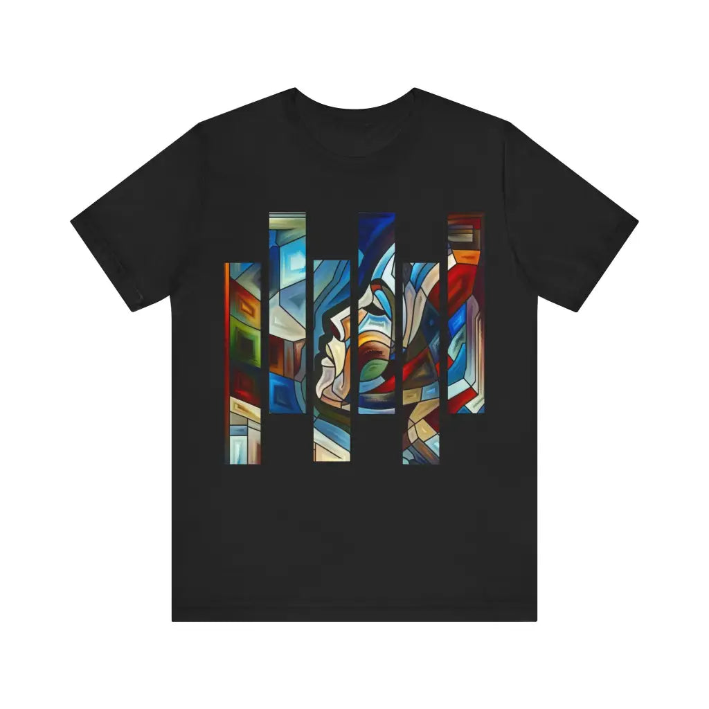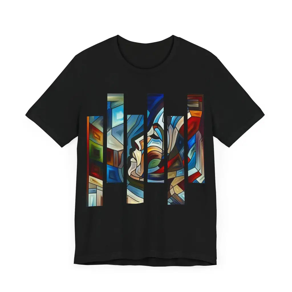 This image features a dynamic arrangement of colorful geometric fragments, forming abstract profiles. The interplay of rich blues, warm reds, and earthy tones creates a vivid, stained-glass effect, evoking a sense of movement and depth. The inventive design showcases harmony between color and form.. This classic unisex jersey short sleeve tee fits like a well-loved favorite. Soft cotton and quality print make users fall in love with it over and over again. These t-shirts have-ribbed knit collars to bolster shaping. The shoulders are tapered for a better fit over time. Dual side seams hold the garment's shape for longer.