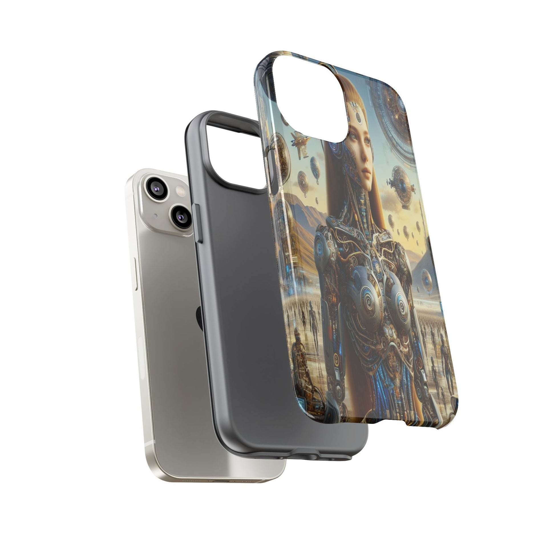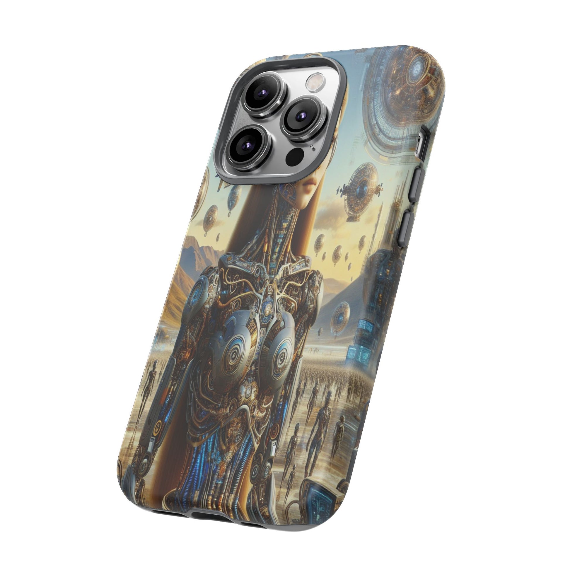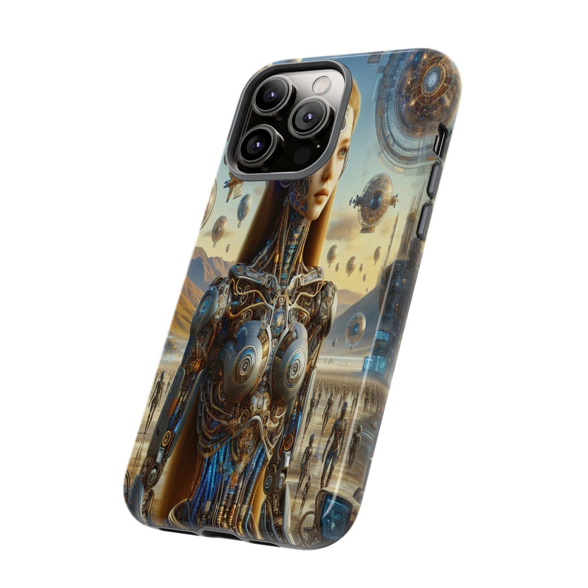 A futuristic masterpiece, featuring a cyborg with intricate mechanical designs amidst a surreal cityscape of floating orbs and shimmering towers, blending organic beauty with high-tech innovation. iPhone, Samsung Galaxy, and Google Pixel devices with premium-quality custom protective phone cases. Every case has double layers for extra durability and protection while the clear, open ports stay out of your way when it comes to charging. The outer polycarbonate shell will resist daily impacts. Choose between matte or glossy finish and enjoy adding a unique touch to your phone with our custom protective phone cases sourced from Korea.