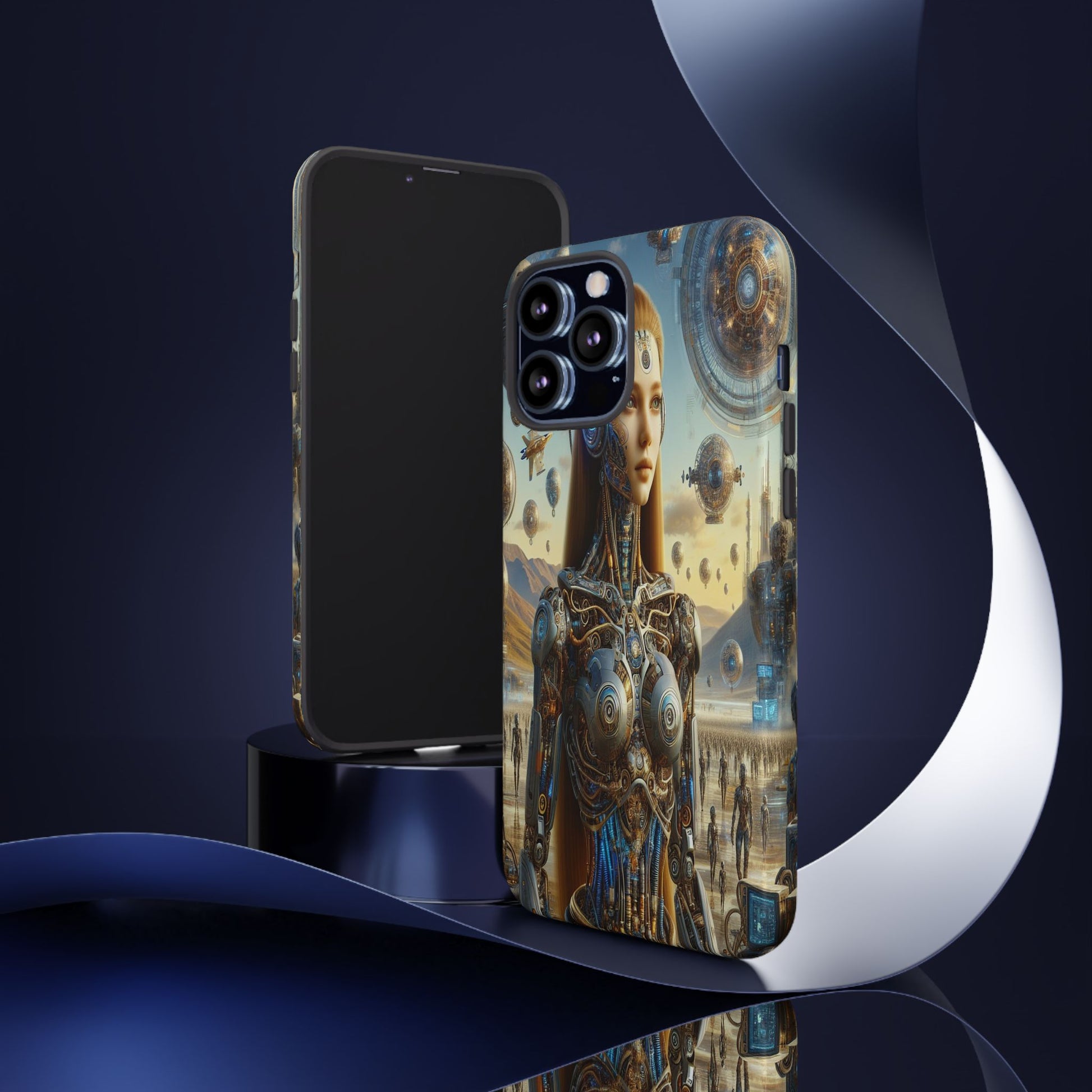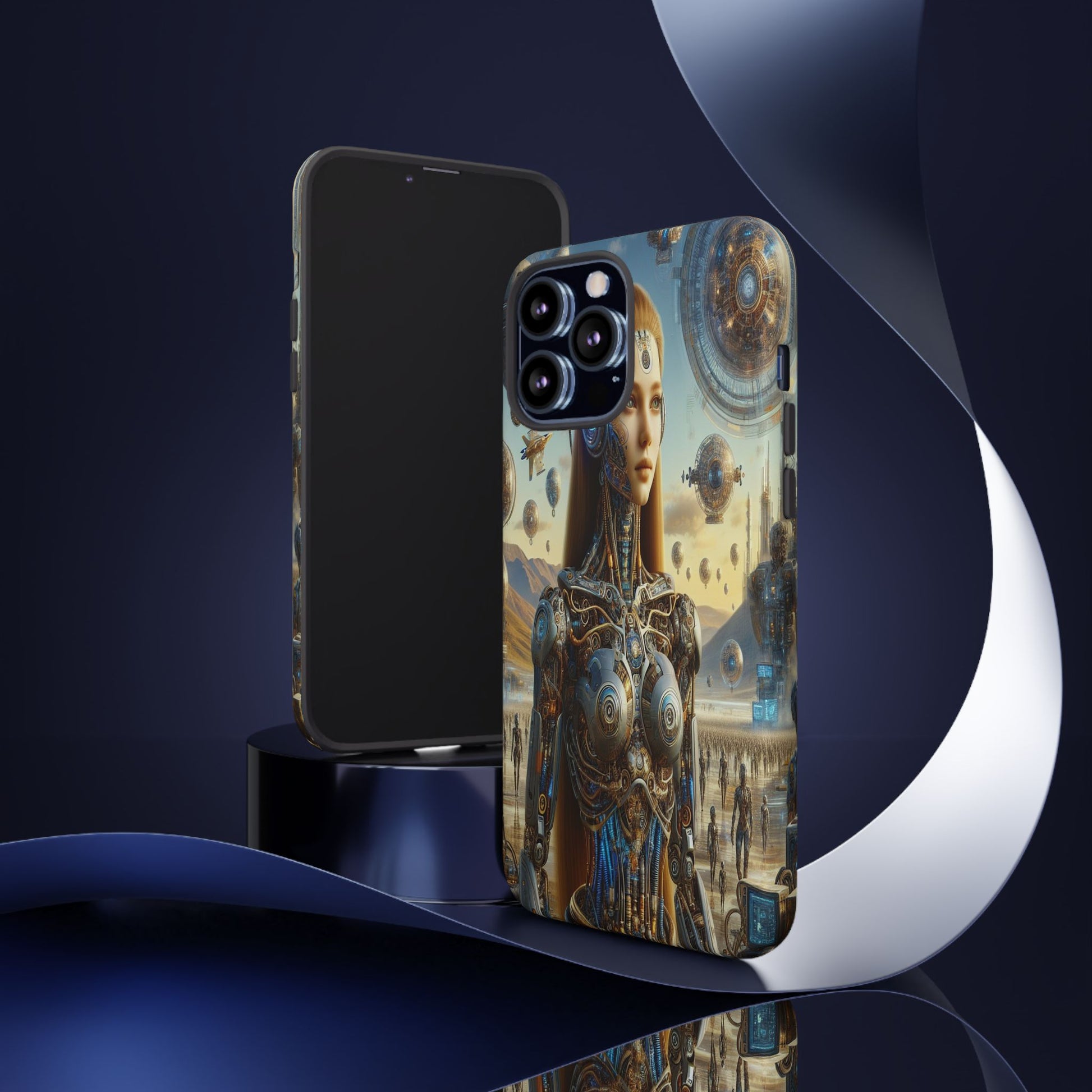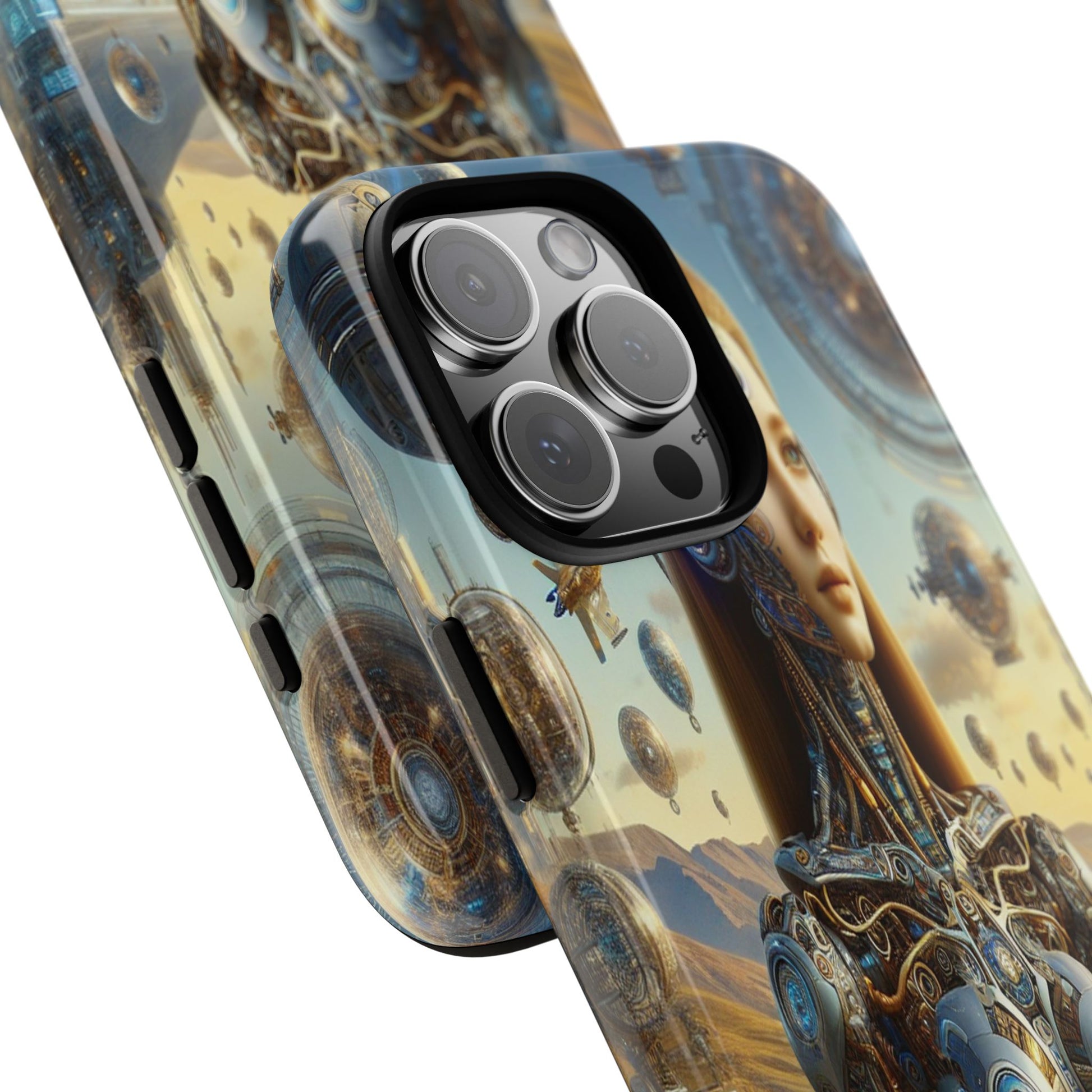 A futuristic masterpiece, featuring a cyborg with intricate mechanical designs amidst a surreal cityscape of floating orbs and shimmering towers, blending organic beauty with high-tech innovation. iPhone, Samsung Galaxy, and Google Pixel devices with premium-quality custom protective phone cases. Every case has double layers for extra durability and protection while the clear, open ports stay out of your way when it comes to charging. The outer polycarbonate shell will resist daily impacts. Choose between matte or glossy finish and enjoy adding a unique touch to your phone with our custom protective phone cases sourced from Korea.
