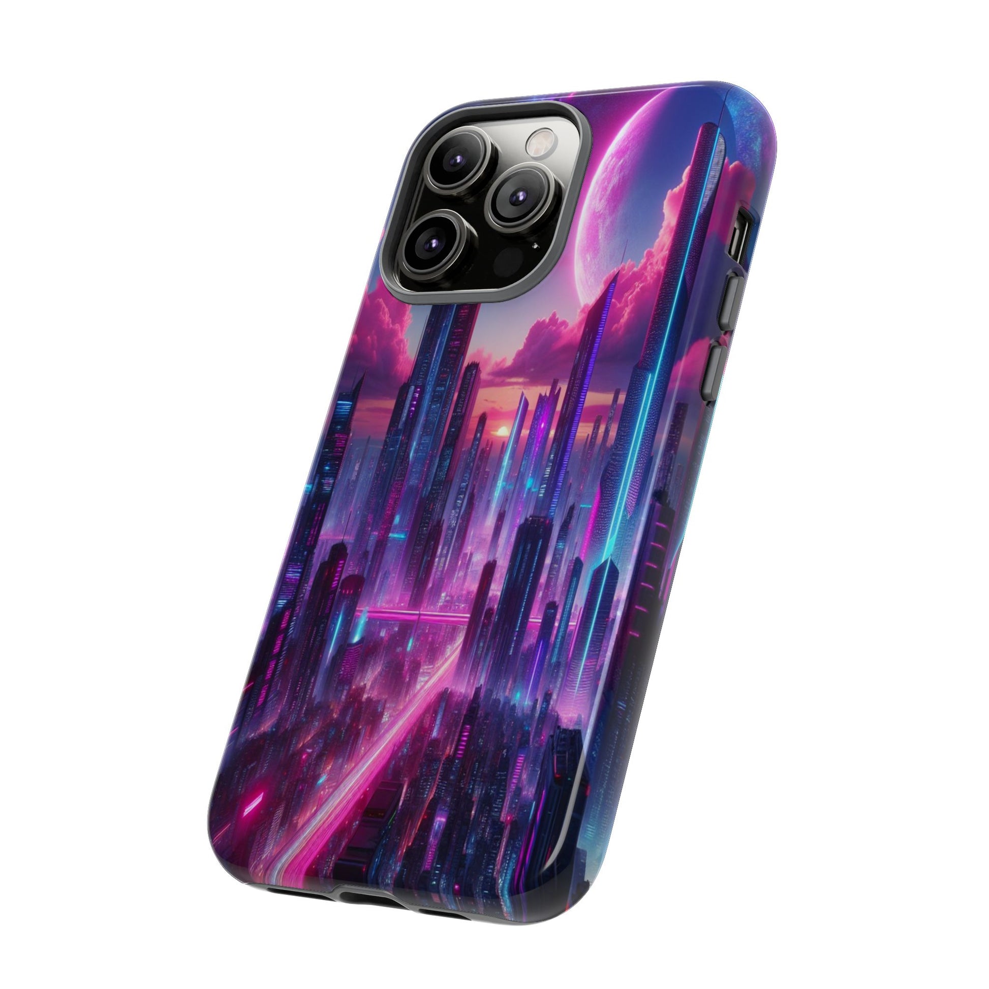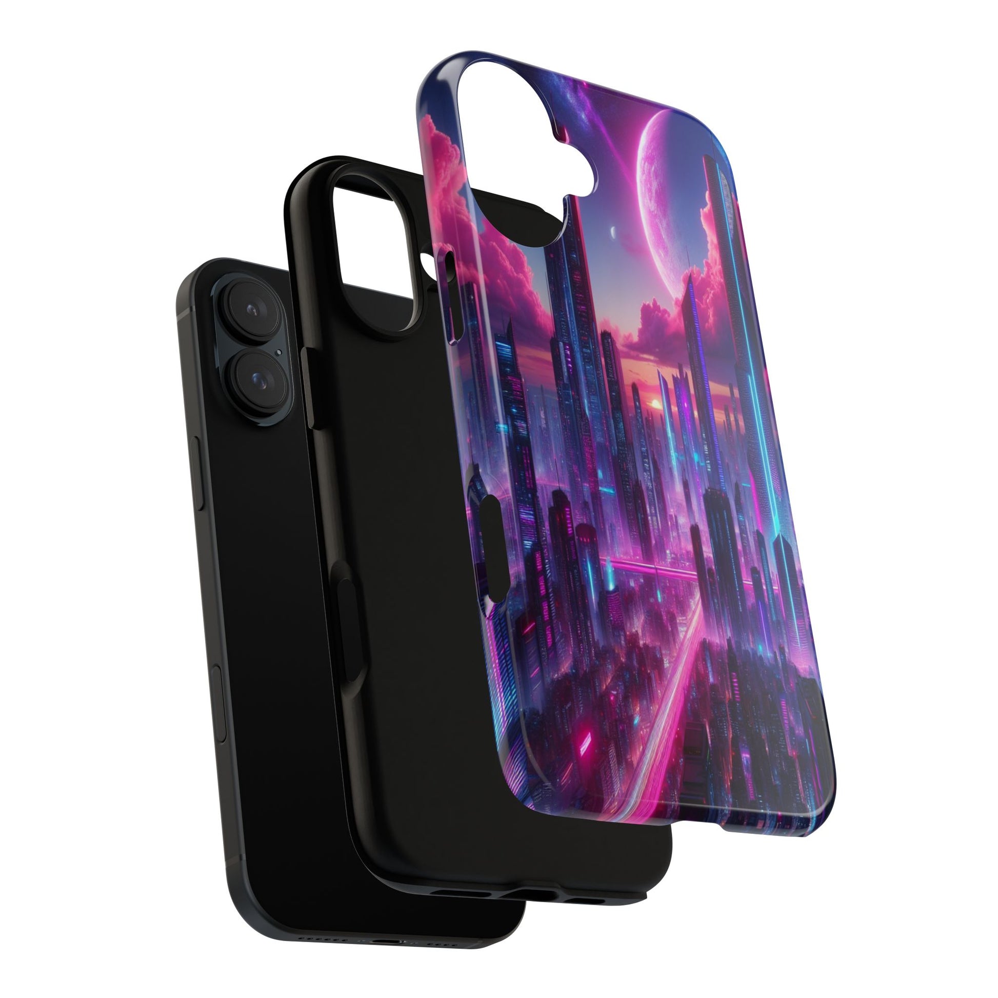 A dazzling neon cityscape emerges under a cosmic, pink-tinted sky. Towering skyscrapers glow with electric blues and vibrant purples, creating a futuristic wonderland where the ethereal meets the urban. iPhone, Samsung Galaxy, and Google Pixel devices with premium-quality custom protective phone cases. Every case has double layers for extra durability and protection while the clear, open ports stay out of your way when it comes to charging. The outer polycarbonate shell will resist daily impacts. Choose between matte or glossy finish and enjoy adding a unique touch to your phone with our custom protective phone cases sourced from Korea.