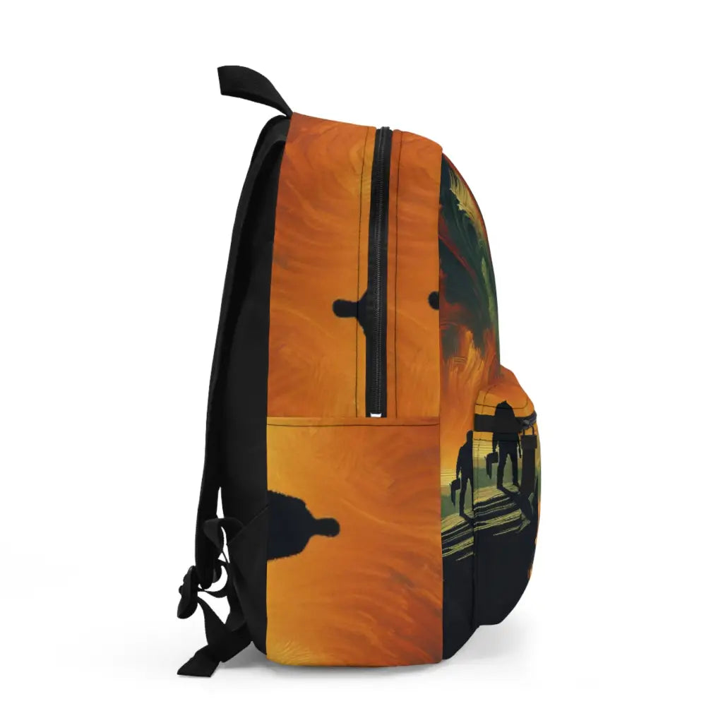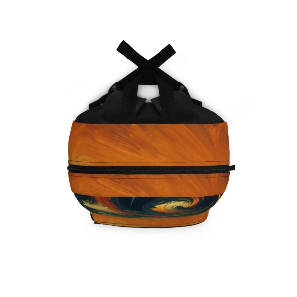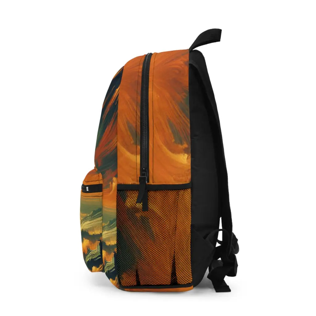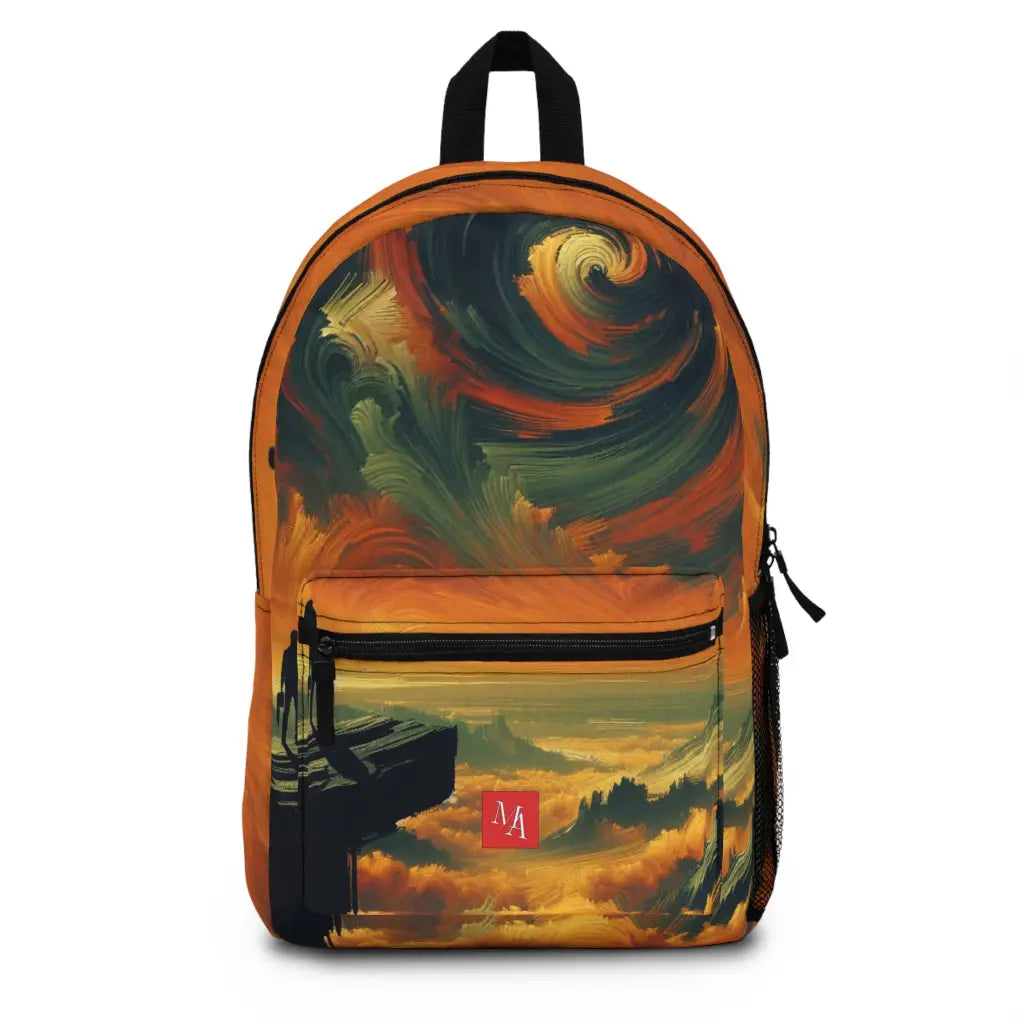 A solitary figure stands on a cliff against a vibrant, swirling sky of fiery orange and subtle green hues. The scene evokes a sense of adventure and introspection, blending elements of dreamscapes with bold color contrasts, capturing a moment of serene contemplation. Introducing the ultimate backpack for fashion-forward adventurers! Our backpack boasts a striking textile design that will make a statement wherever you go. With its durable construction and spacious compartments, it is perfect for carrying all your essentials. Get ready to turn heads and stay organized with our backpack. #textiledesign #backpack #fashionforward #adventure #durable #spacious #statementpiece #organized #essentials #travel #explore