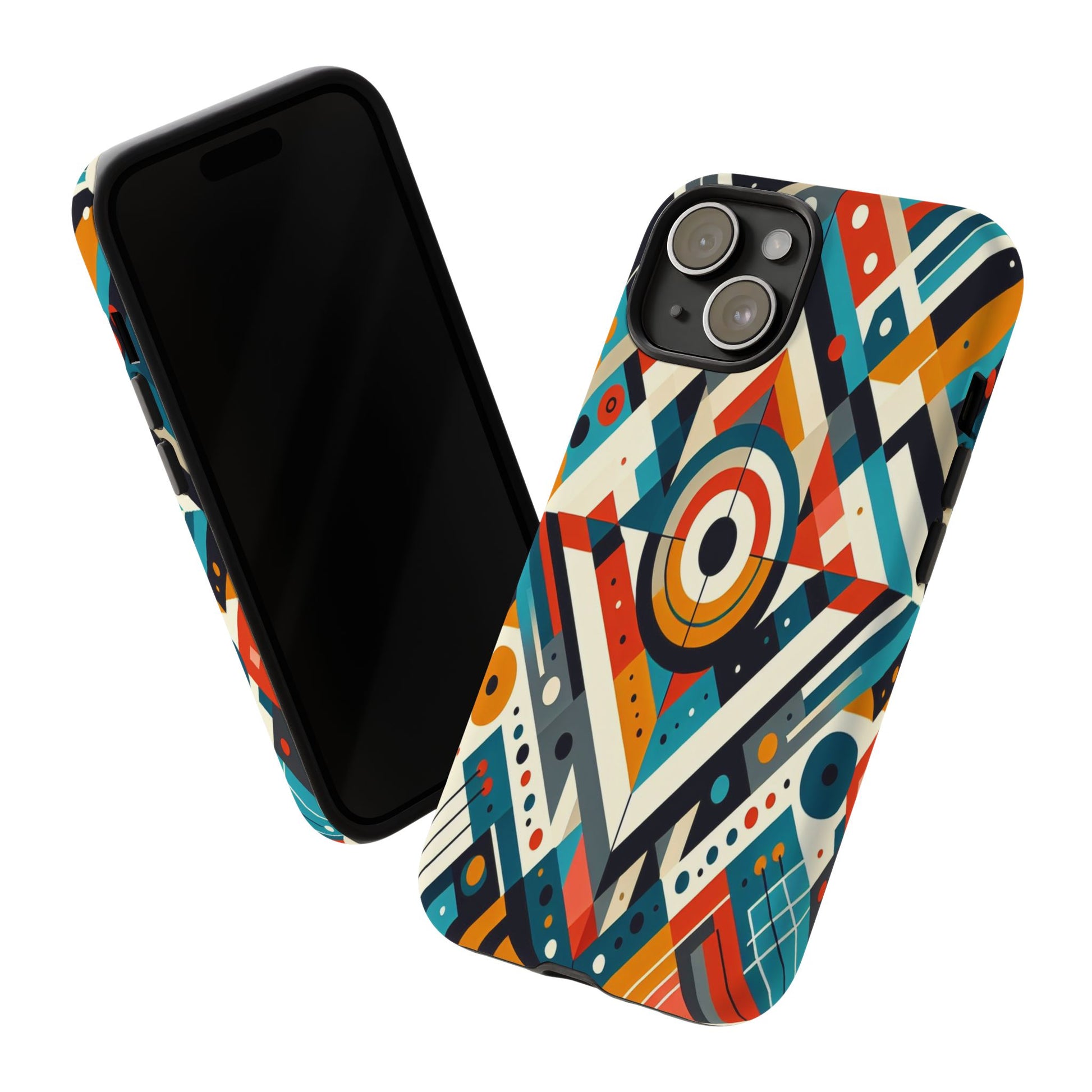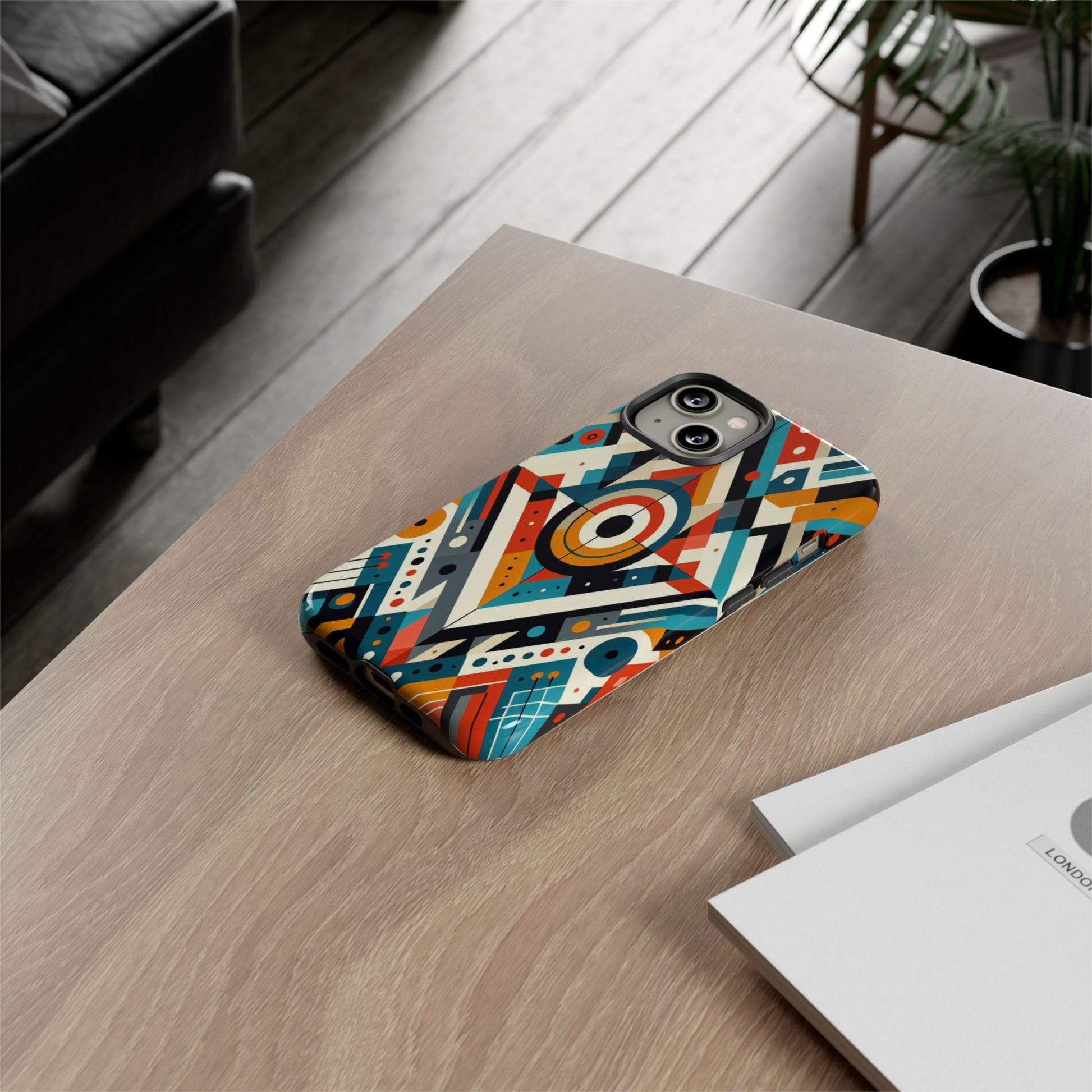A dynamic geometric tapestry, bursting with vibrant colors and intricate patterns, creating a harmonious balance of circles, lines, and angles. The design evokes a sense of movement and rhythm, blending symmetry with a playful modern aesthetic. iPhone, Samsung Galaxy, and Google Pixel devices with premium-quality custom protective phone cases. Every case has double layers for extra durability and protection while the clear, open ports stay out of your way when it comes to charging. The outer polycarbonate shell will resist daily impacts. Choose between matte or glossy finish and enjoy adding a unique touch to your phone with our custom protective phone cases sourced from Korea.