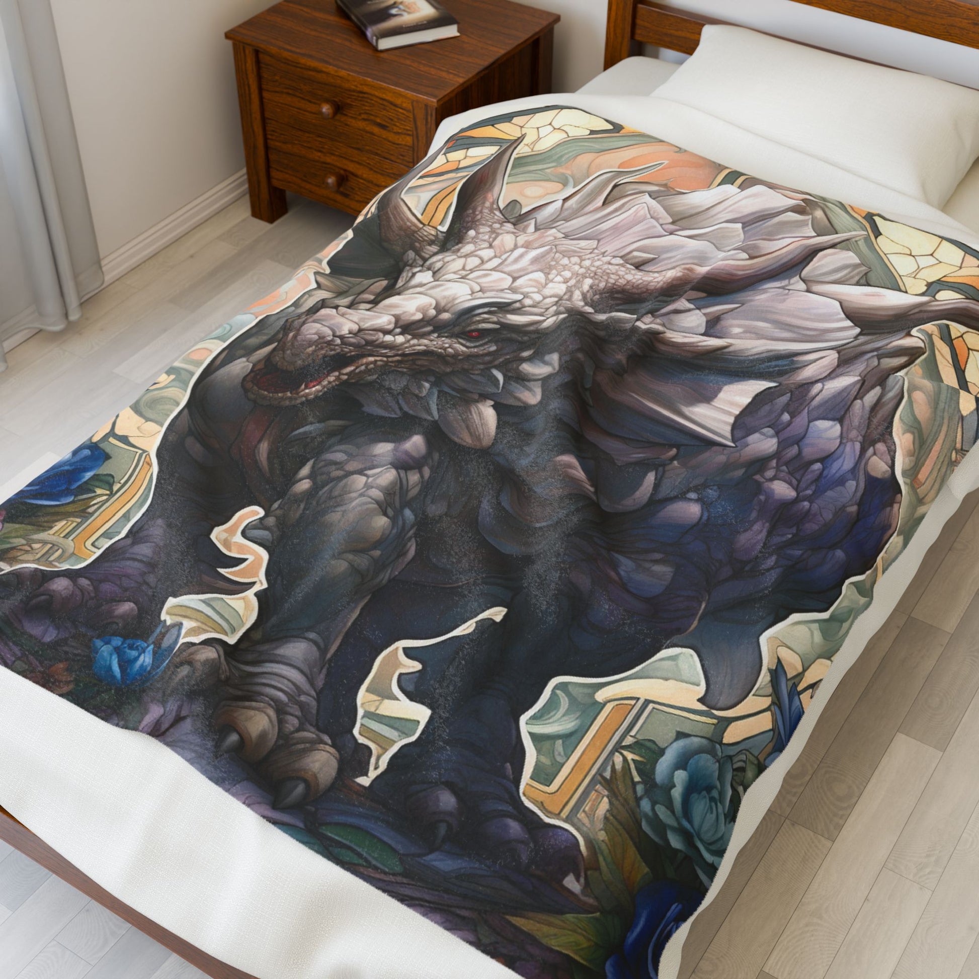 An intricately detailed dragon is framed by an Art Nouveau inspired border, harmonizing mythical grandeur with delicate floral motifs. The juxtaposition of the dragon's imposing form against the stylized elegance of the backdrop offers a unique, visually captivating synergy. Create a cozy and warm atmosphere at home with this plush velveteen blanket. It is soft to touch and perfect for any home. Customize with a one-sided print to add your personal touch or create a gift for your friends and family. Available in three sizes: 30x40", 50x60", 60x80".