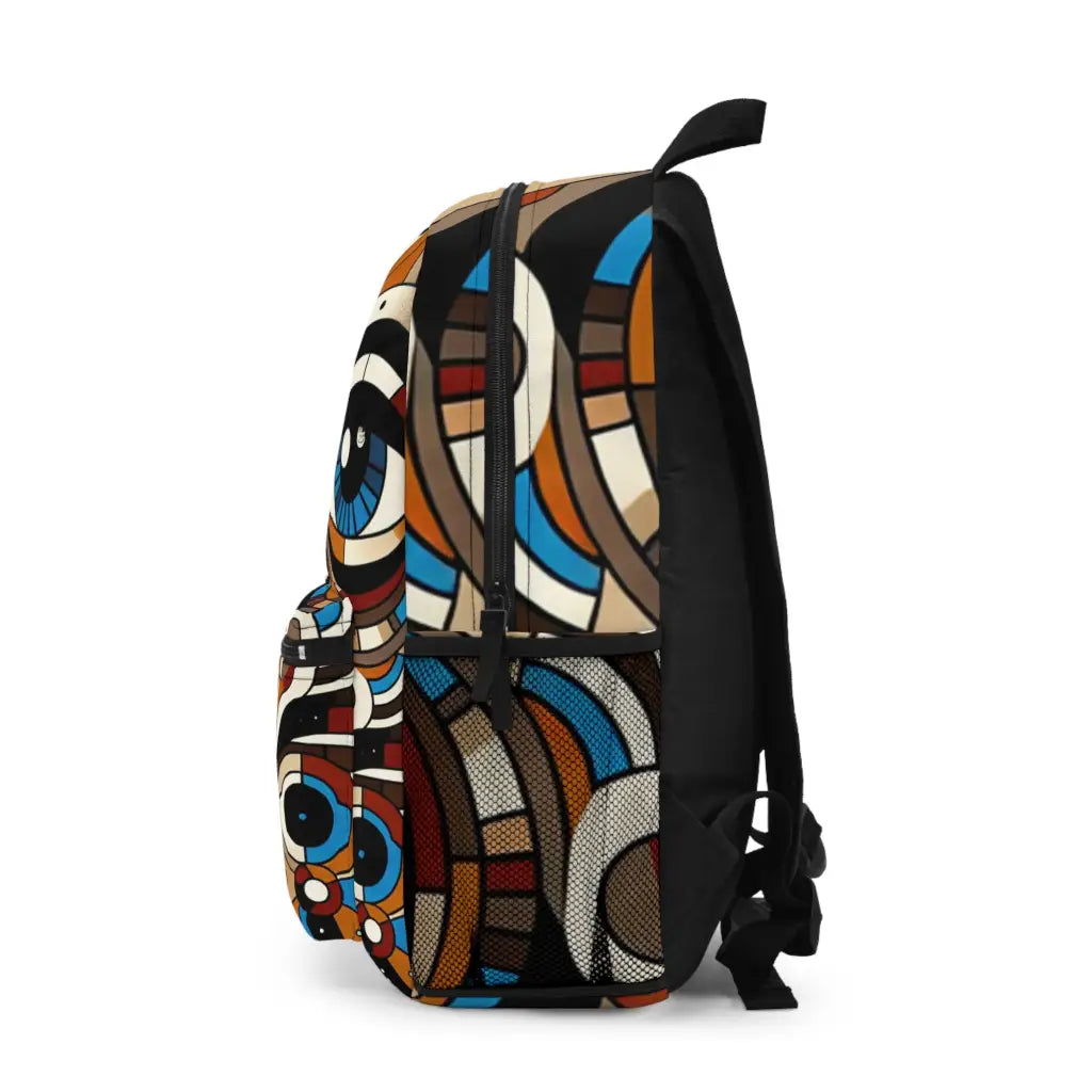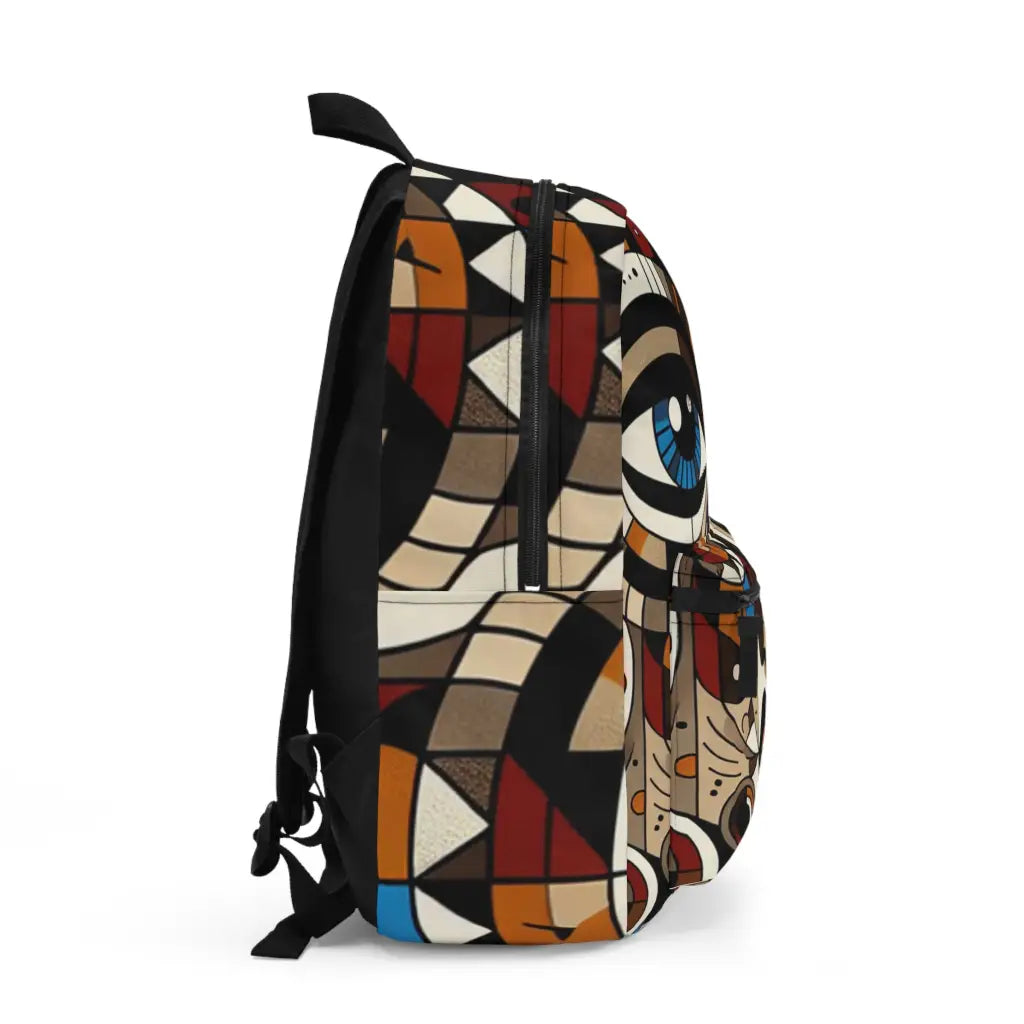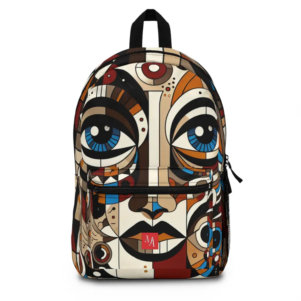 The image showcases a vibrant, abstract portrait featuring geometric patterns and bold, earthy colors. Circular and rectangular shapes intertwine rhythmically around a stylized human face, blending tradition with modernity. The dynamic composition exudes a warm, tribal essence through its intricate, harmonious design. Introducing the ultimate backpack for fashion-forward adventurers! Our backpack boasts a striking textile design that will make a statement wherever you go. With its durable construction and spacious compartments, it is perfect for carrying all your essentials. Get ready to turn heads and stay organized with our backpack. #textiledesign #backpack #fashionforward #adventure #durable #spacious #statementpiece #organized #essentials #travel #explore