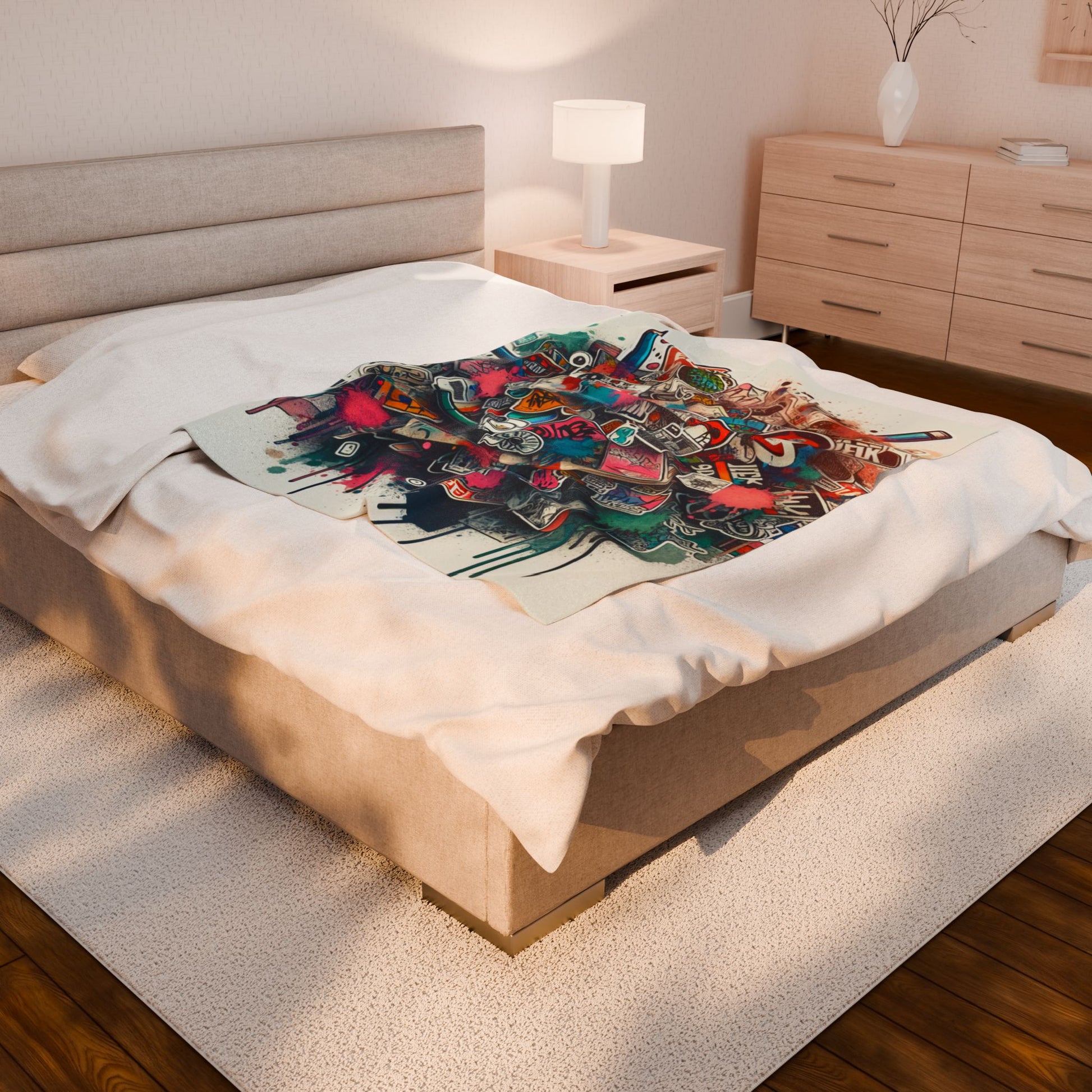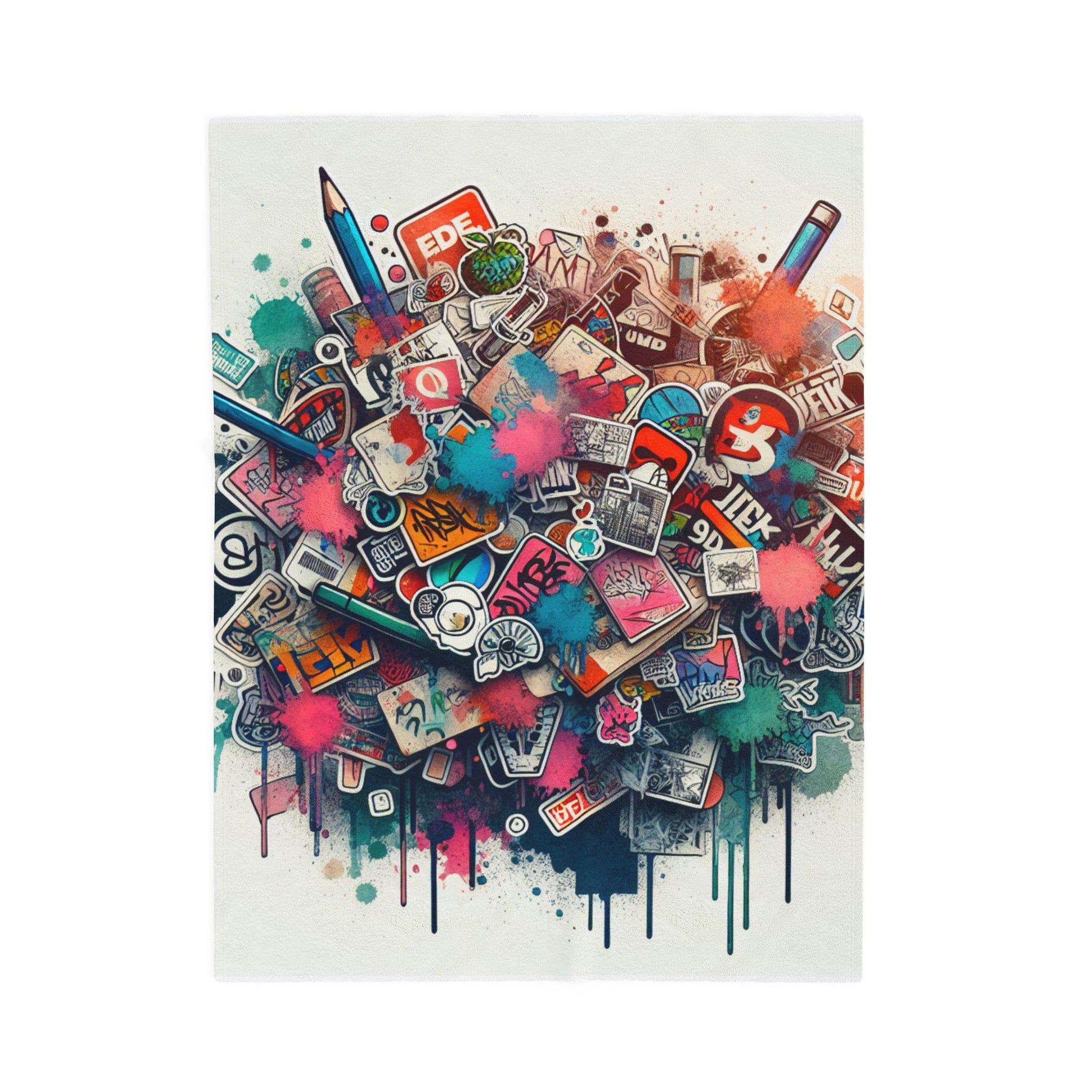 A vibrant explosion of street art, blending graffiti, stickers, and sketches, bursts with energy. Colorful paint splashes and intricate doodles swirl around pencils, evoking dynamic creativity and urban expression. Create a cozy and warm atmosphere at home with this plush velveteen blanket. It is soft to touch and perfect for any home. Customize with a one-sided print to add your personal touch or create a gift for your friends and family. Available in three sizes: 30x40", 50x60", 60x80".