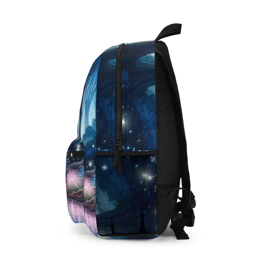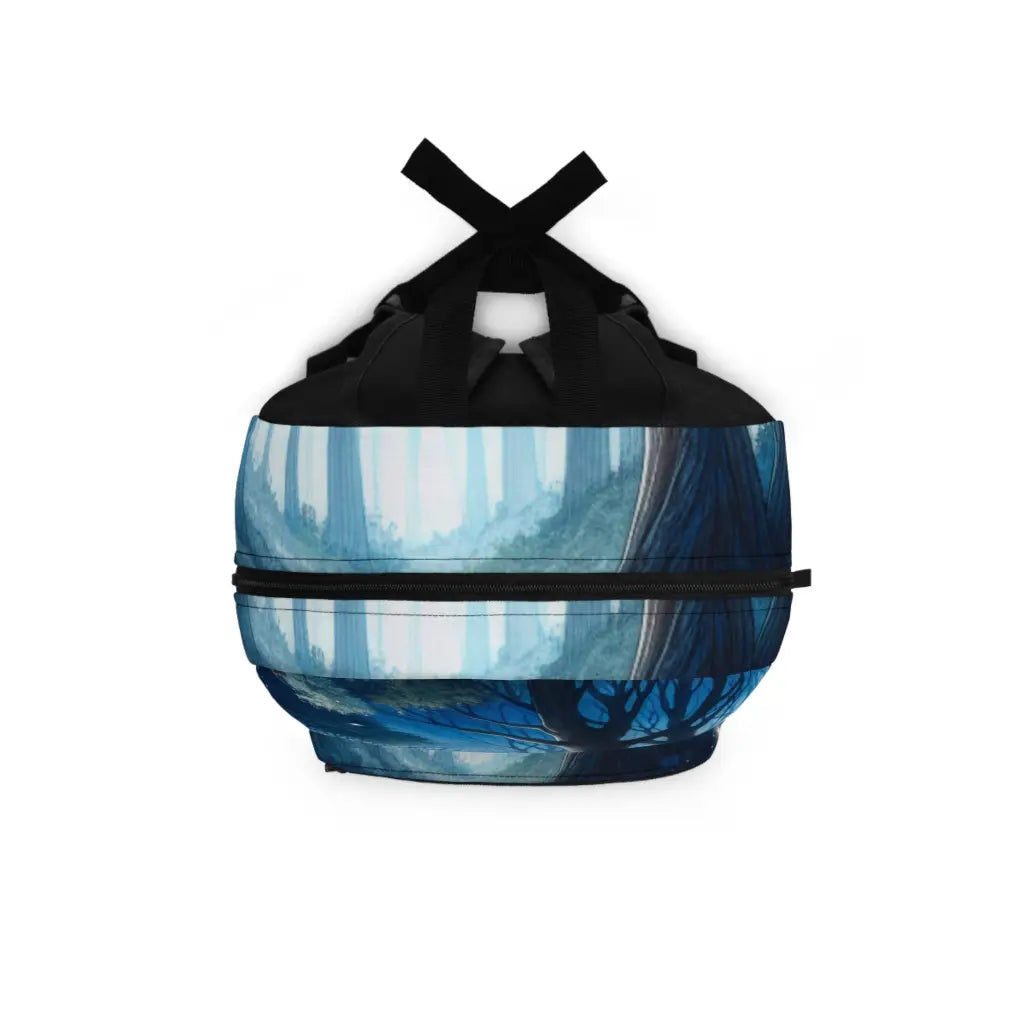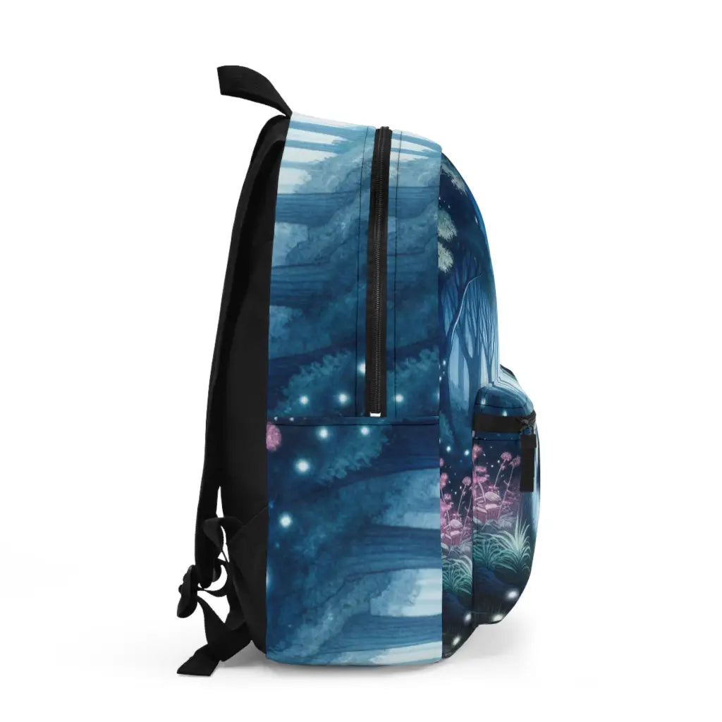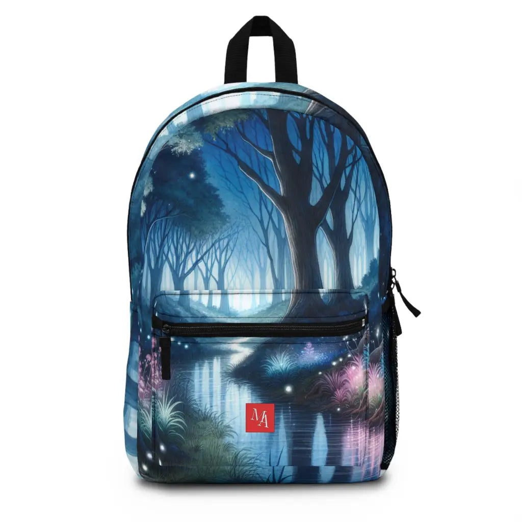 A luminous, mystical forest scene glows with ethereal blue light, creating a dreamlike ambiance. A crystal-clear stream reflects the enchanted forest, while vivid, luminescent flowers dot the landscape, enhancing the magical atmosphere. The interplay of light and shadow crafts a serene, otherworldly sanctuary. Introducing the ultimate backpack for fashion-forward adventurers! Our backpack boasts a striking textile design that will make a statement wherever you go. With its durable construction and spacious compartments, it is perfect for carrying all your essentials. Get ready to turn heads and stay organized with our backpack. #textiledesign #backpack #fashionforward #adventure #durable #spacious #statementpiece #organized #essentials #travel #explore