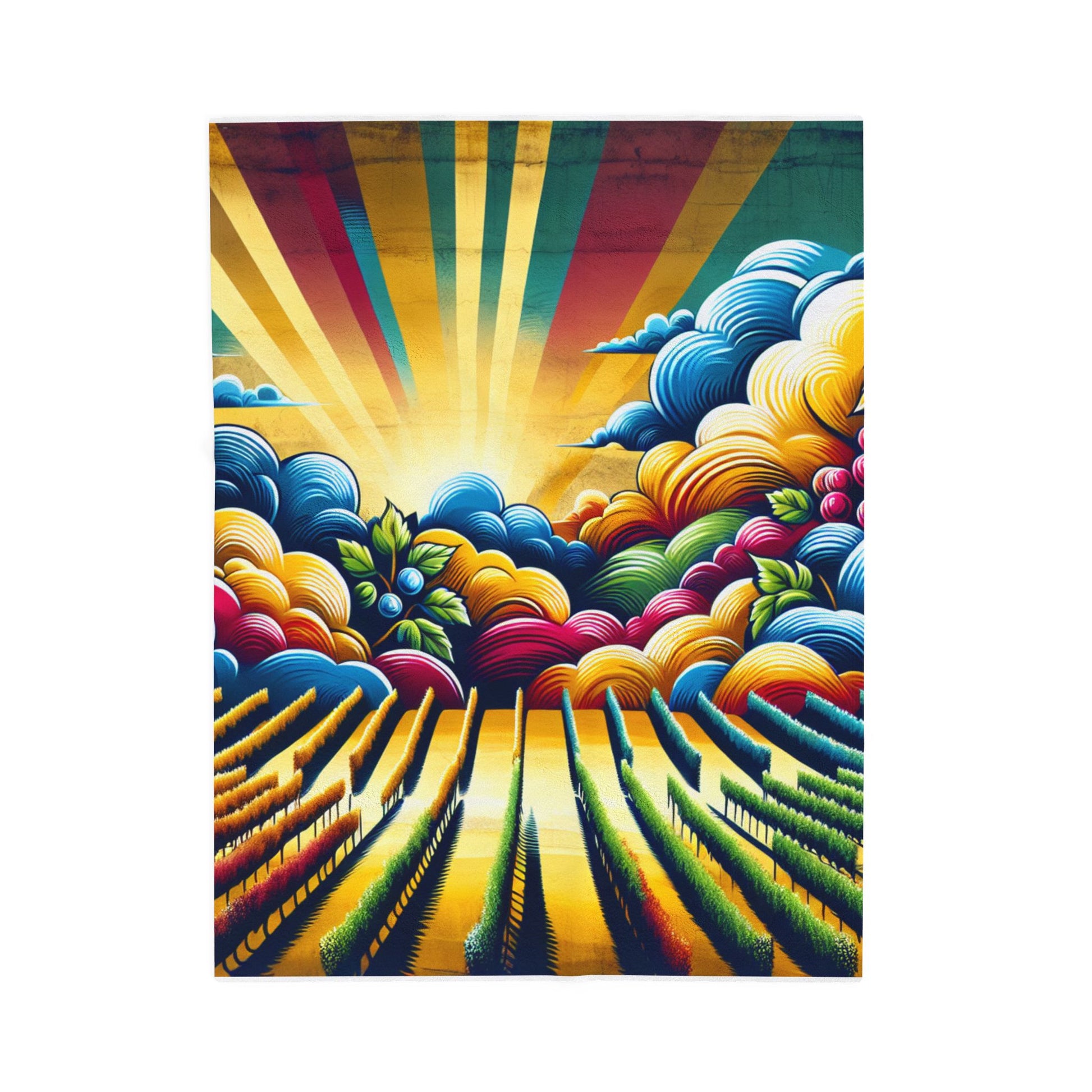 Vibrant surreal landscape with bold, swirling clouds in rich hues of blue, yellow, and red. Radiant sunbeams illuminate stylized vineyards below, creating a dreamlike fusion of nature and art. Create a cozy and warm atmosphere at home with this plush velveteen blanket. It is soft to touch and perfect for any home. Customize with a one-sided print to add your personal touch or create a gift for your friends and family. Available in three sizes: 30x40", 50x60", 60x80".