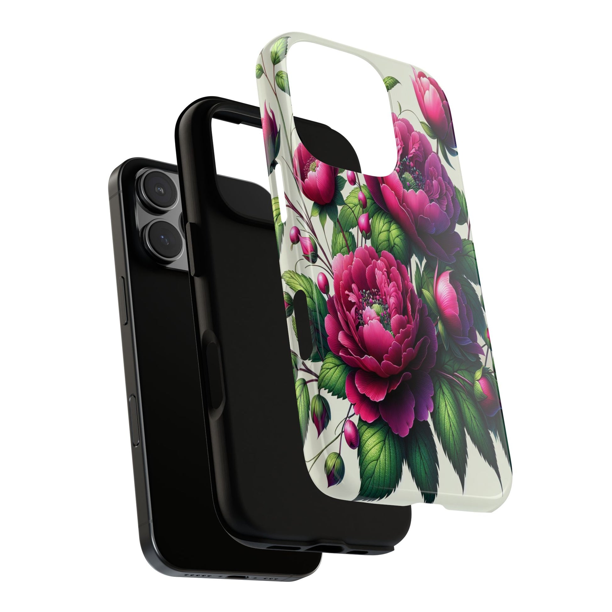Vibrant peonies burst with rich magenta hues, intricately detailed petals, and lush green leaves. The harmony of swirling lines and gradients creates a lively and dynamic floral composition, blending elegance with nature's exuberance. iPhone, Samsung Galaxy, and Google Pixel devices with premium-quality custom protective phone cases. Every case has double layers for extra durability and protection while the clear, open ports stay out of your way when it comes to charging. The outer polycarbonate shell will resist daily impacts. Choose between matte or glossy finish and enjoy adding a unique touch to your phone with our custom protective phone cases sourced from Korea.