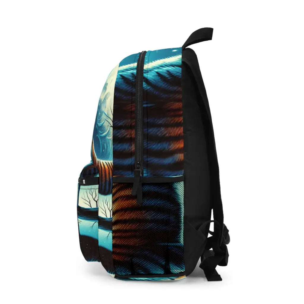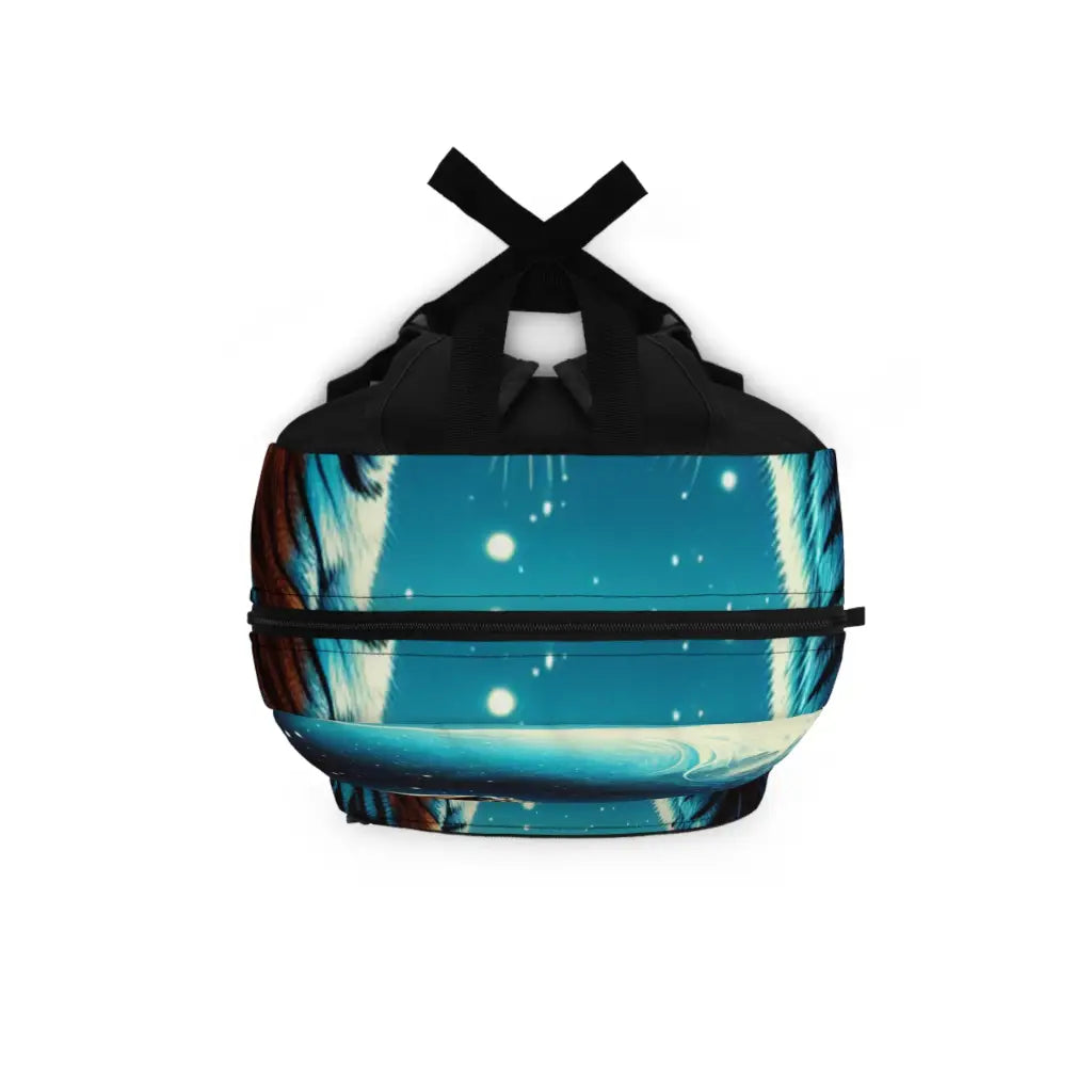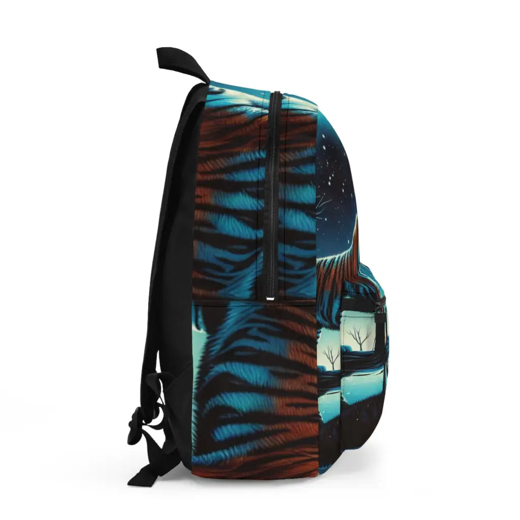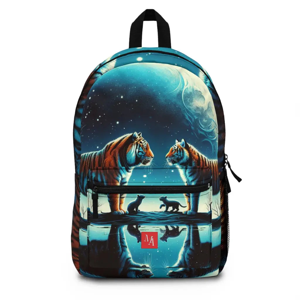 Two tigers stand face-to-face in a mystical, moonlit landscape. Silhouetted cubs play against a shimmering, starry sky. The scene blends vivid color with shadows, creating a whimsical, dreamlike atmosphere under a crescent moon. Introducing the ultimate backpack for fashion-forward adventurers! Our backpack boasts a striking textile design that will make a statement wherever you go. With its durable construction and spacious compartments, it is perfect for carrying all your essentials. Get ready to turn heads and stay organized with our backpack. #textiledesign #backpack #fashionforward #adventure #durable #spacious #statementpiece #organized #essentials #travel #explore