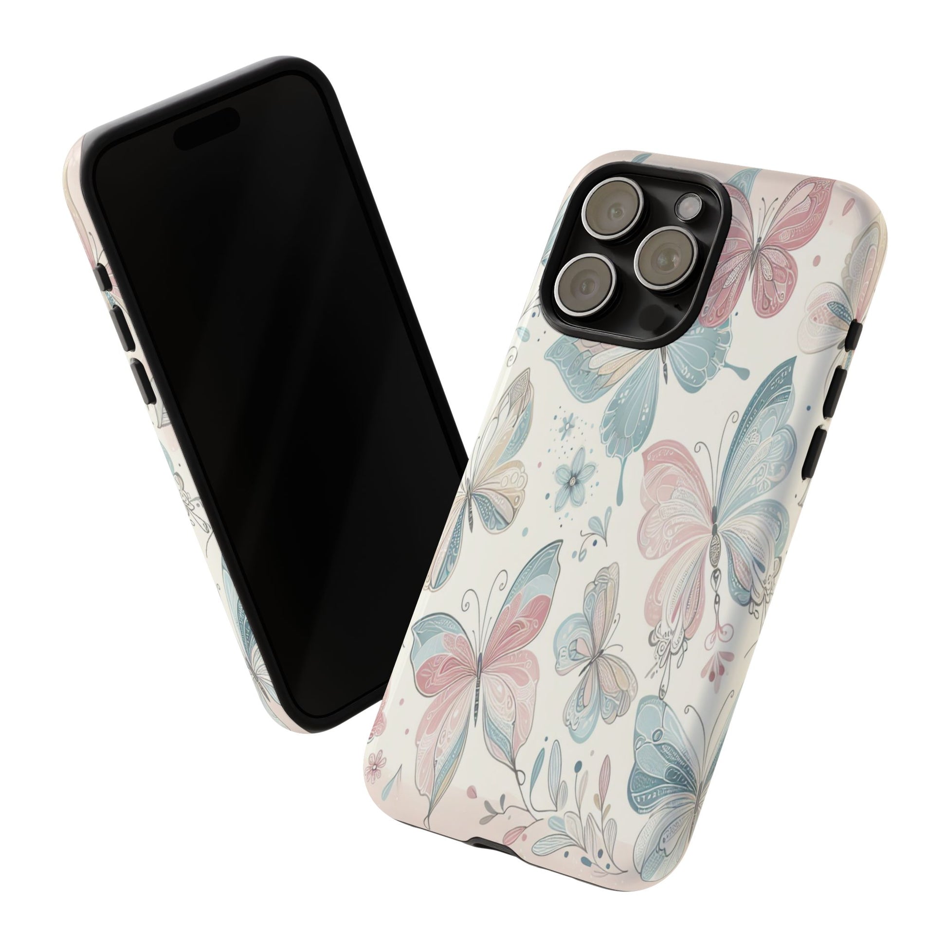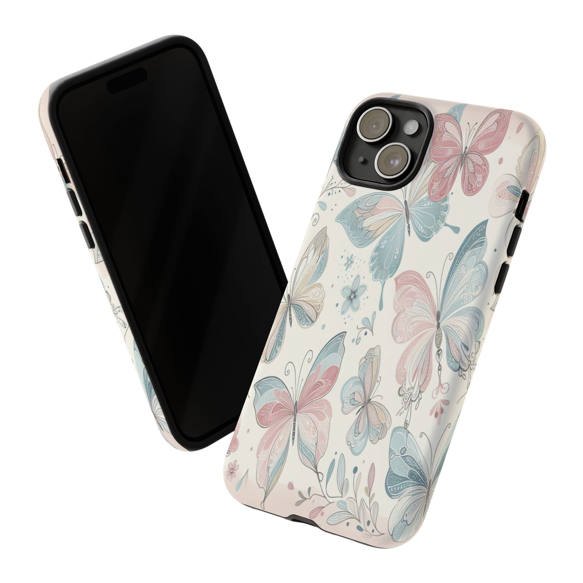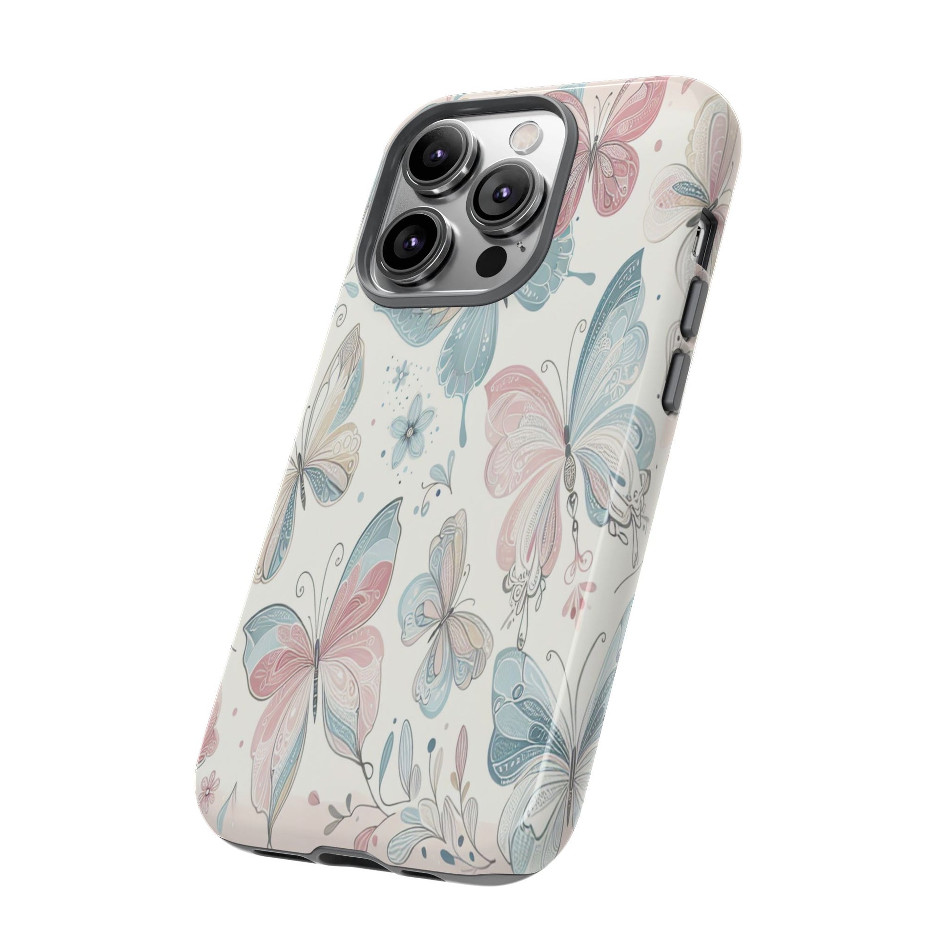 Delicate pastel butterflies dance gracefully, adorned with intricate patterns and flourishes. Soft hues of pink and blue create an ethereal, dreamy atmosphere, while whimsical floral and leaf motifs accentuate the enchanting scene. iPhone, Samsung Galaxy, and Google Pixel devices with premium-quality custom protective phone cases. Every case has double layers for extra durability and protection while the clear, open ports stay out of your way when it comes to charging. The outer polycarbonate shell will resist daily impacts. Choose between matte or glossy finish and enjoy adding a unique touch to your phone with our custom protective phone cases sourced from Korea.