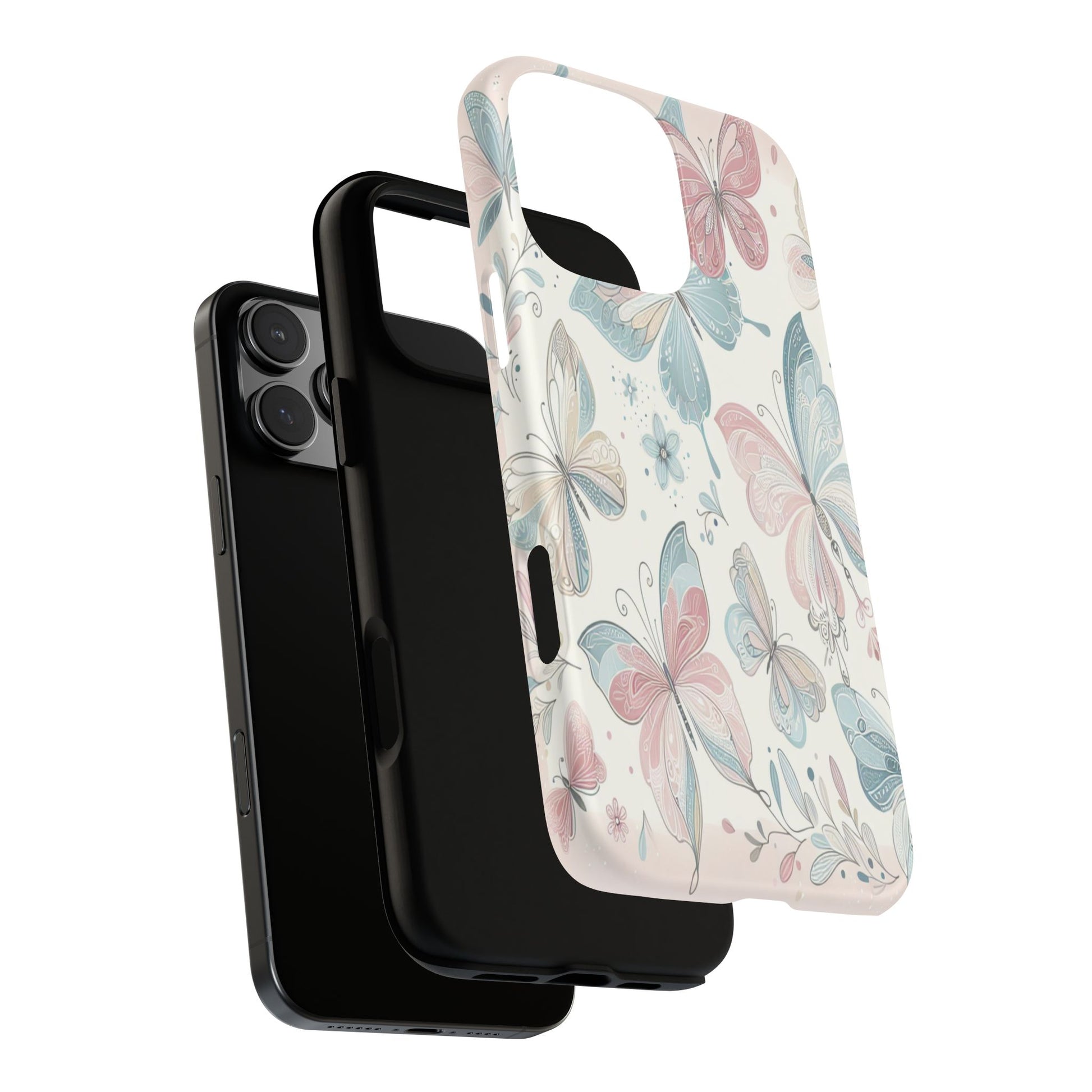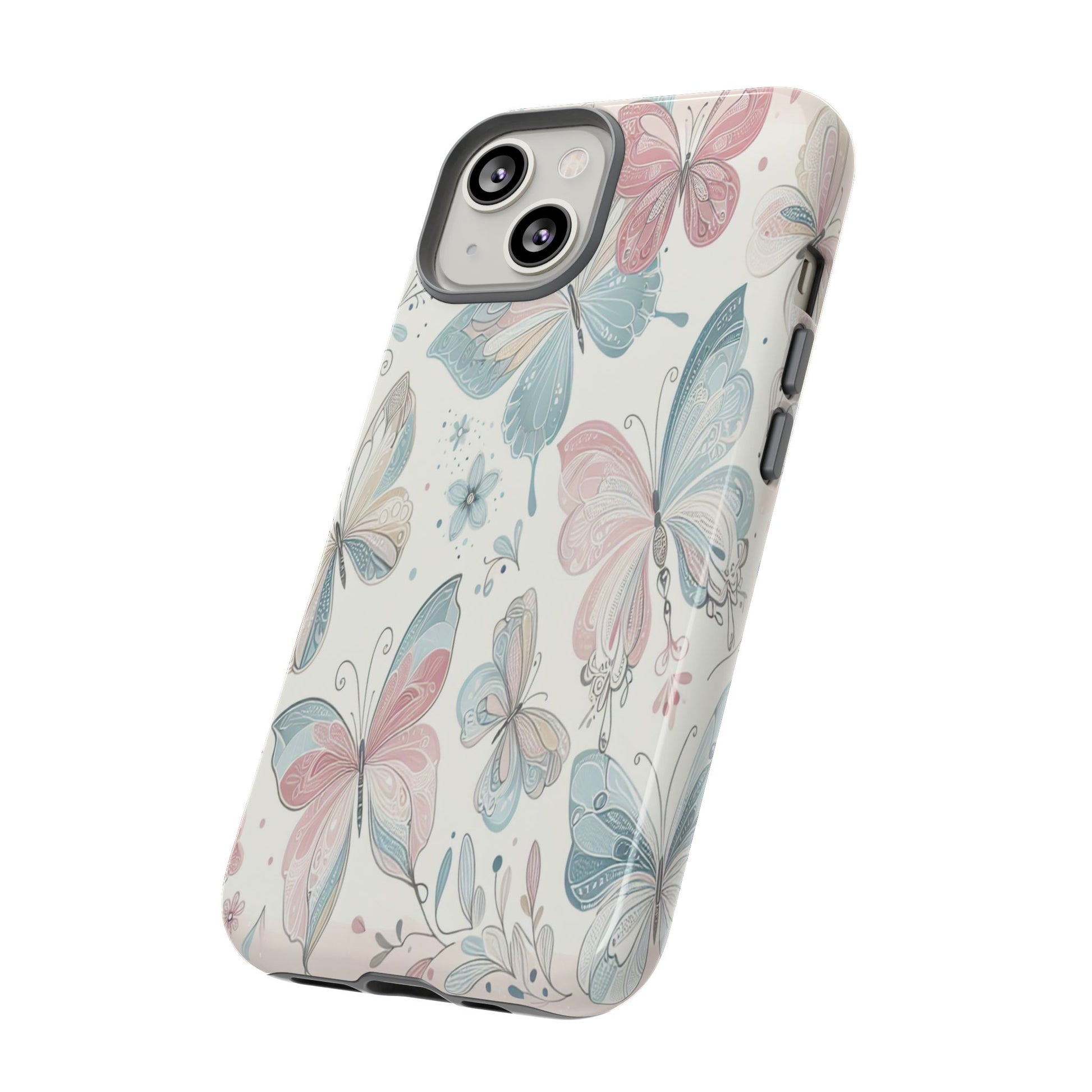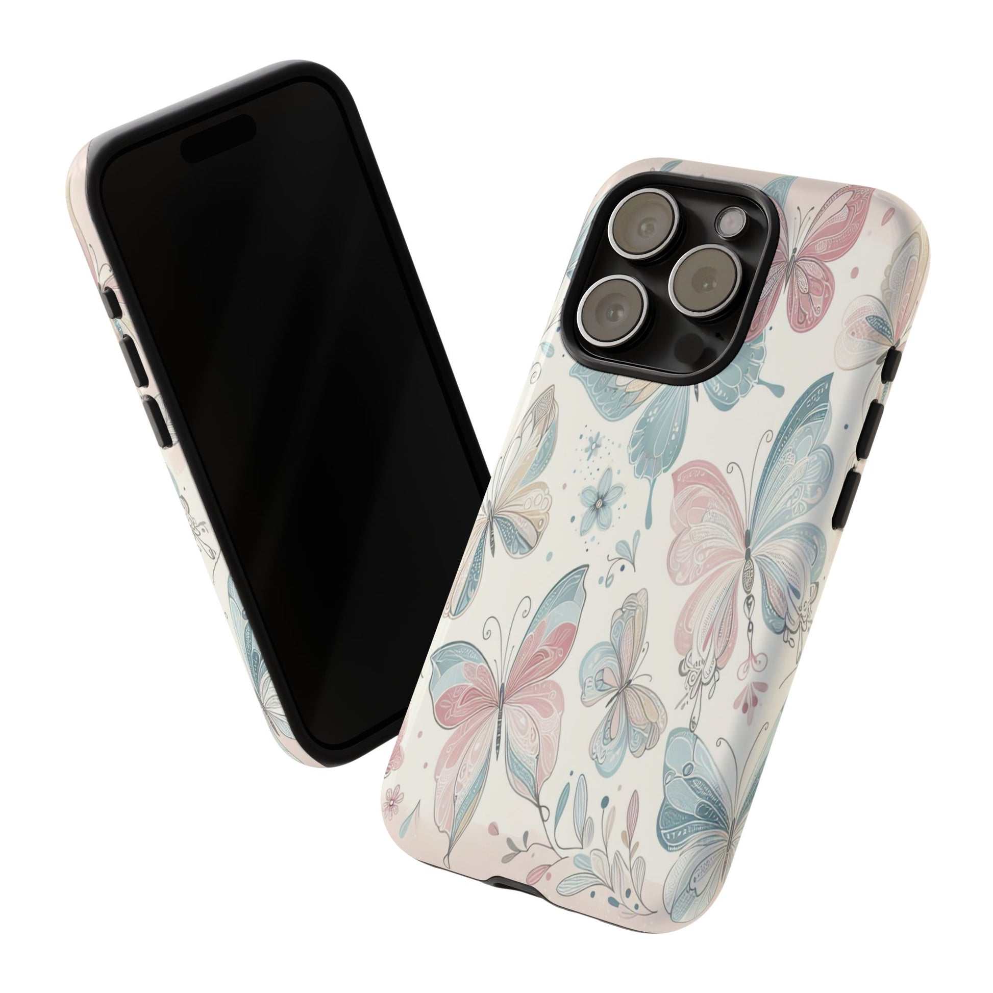Delicate pastel butterflies dance gracefully, adorned with intricate patterns and flourishes. Soft hues of pink and blue create an ethereal, dreamy atmosphere, while whimsical floral and leaf motifs accentuate the enchanting scene. iPhone, Samsung Galaxy, and Google Pixel devices with premium-quality custom protective phone cases. Every case has double layers for extra durability and protection while the clear, open ports stay out of your way when it comes to charging. The outer polycarbonate shell will resist daily impacts. Choose between matte or glossy finish and enjoy adding a unique touch to your phone with our custom protective phone cases sourced from Korea.