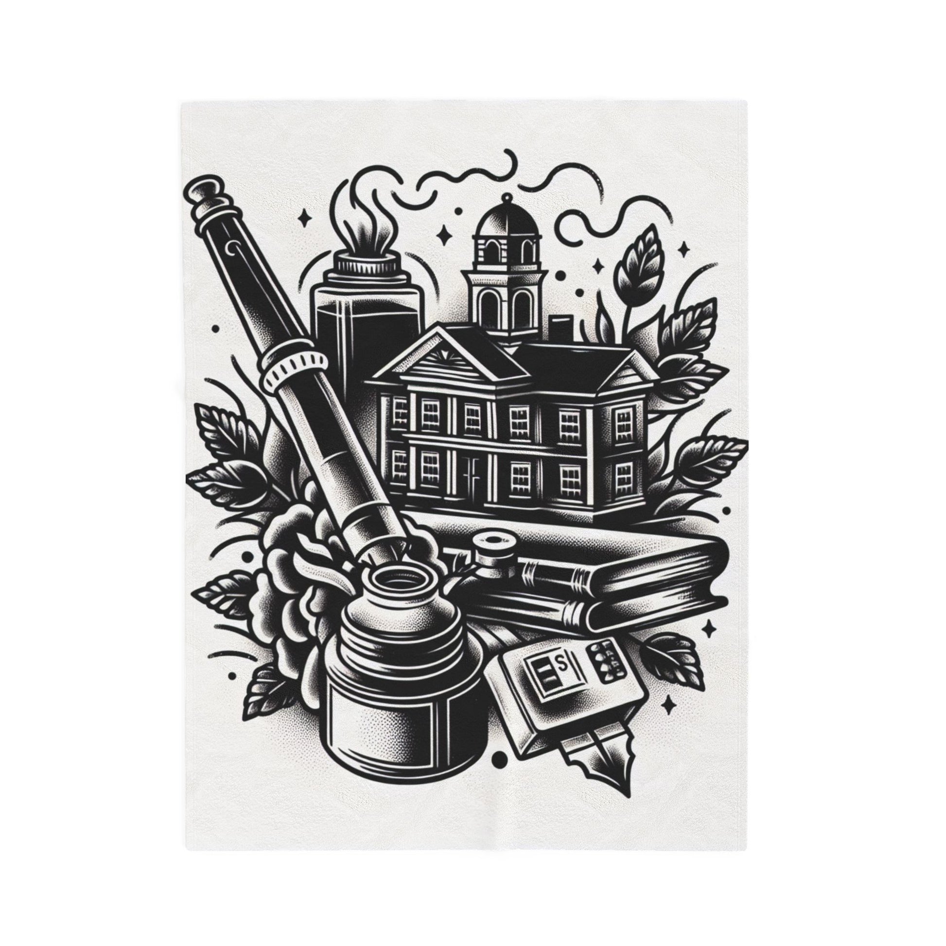 This monochrome illustration presents an iconic homage to academia, featuring a central traditional institution framed by an inkwell, a quill, rolled diplomas, books, and blossoming florals, all outlined by a bold, classic shading technique that adds depth and dimensionality. Create a cozy and warm atmosphere at home with this plush velveteen blanket. It is soft to touch and perfect for any home. Customize with a one-sided print to add your personal touch or create a gift for your friends and family. Available in three sizes: 30x40", 50x60", 60x80".