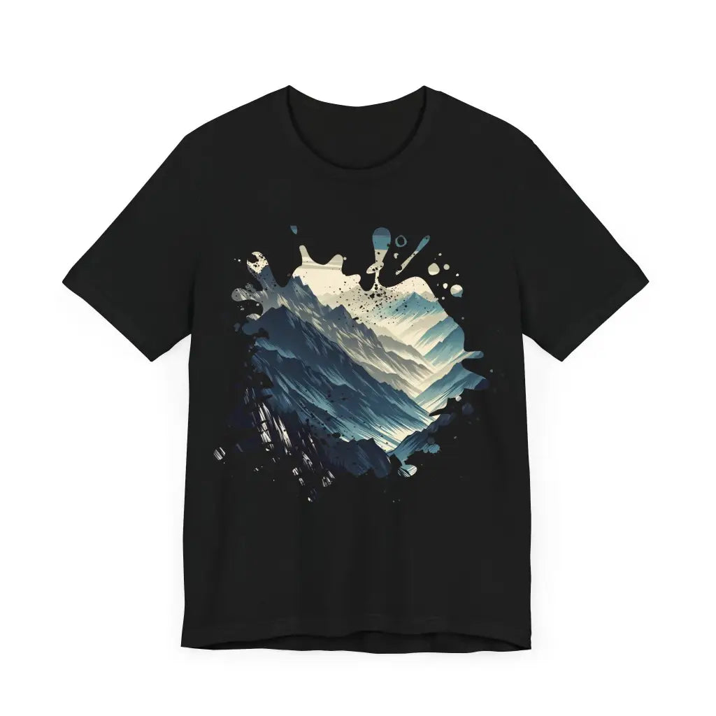 A striking, stylized mountain landscape unfolds in sharp, cascading layers, evoking a sense of adventure. The interplay of shadow and light creates a vivid depth, while the figure of a lone explorer emphasizes the vast, rugged beauty of the scene.. This classic unisex jersey short sleeve tee fits like a well-loved favorite. Soft cotton and quality print make users fall in love with it over and over again. These t-shirts have-ribbed knit collars to bolster shaping. The shoulders are tapered for a better fit over time. Dual side seams hold the garment's shape for longer.