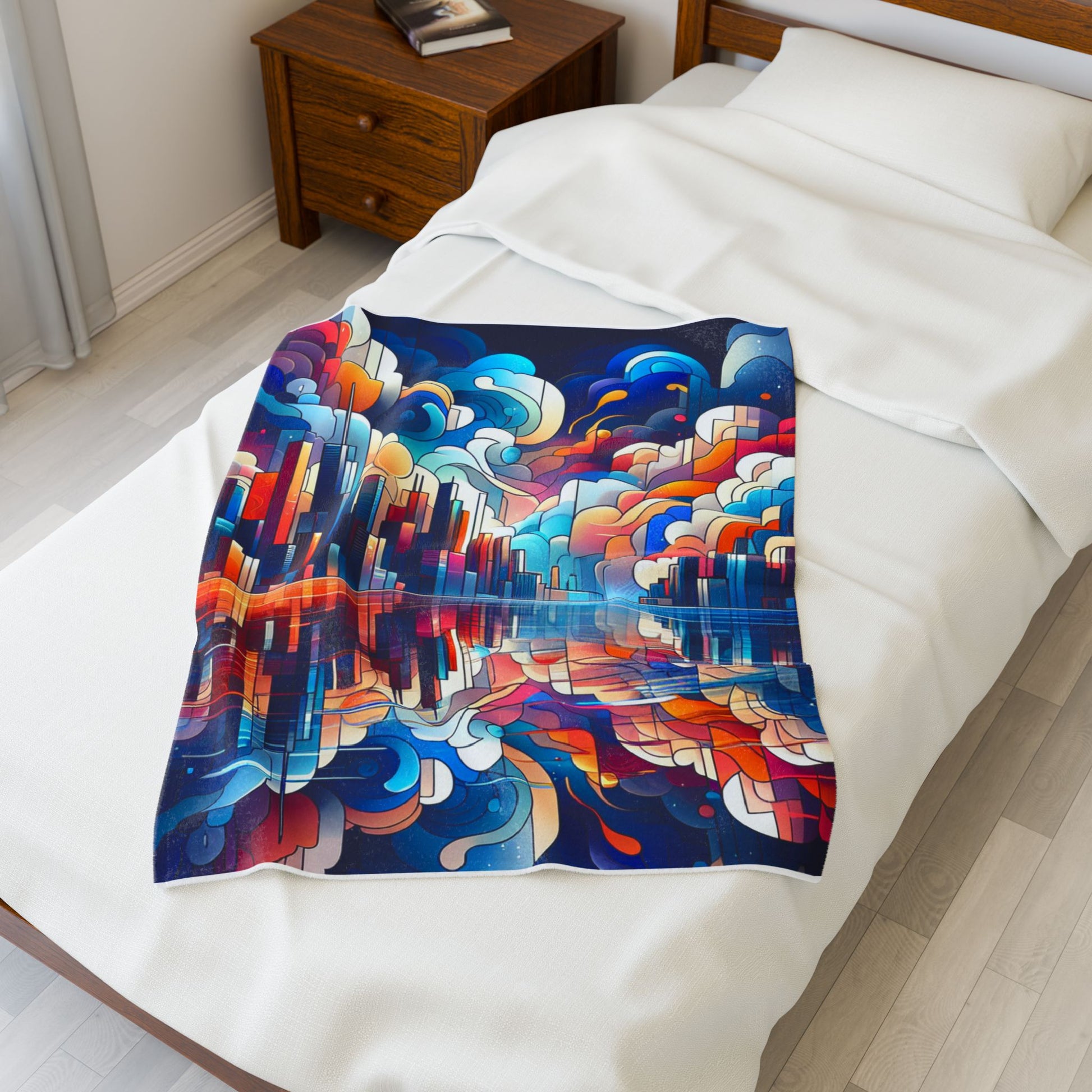 A vibrant, abstract cityscape mirrored over tranquil waters, blending bold geometric buildings with swirling, multicolored clouds against a dark sky. The image creatively juxtaposes urban and natural elements, creating a dynamic, dreamlike atmosphere. Create a cozy and warm atmosphere at home with this plush velveteen blanket. It is soft to touch and perfect for any home. Customize with a one-sided print to add your personal touch or create a gift for your friends and family. Available in three sizes: 30x40", 50x60", 60x80".