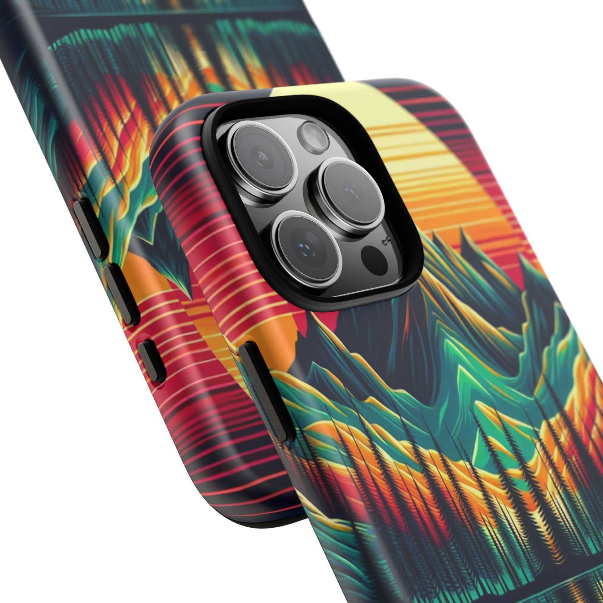 A vibrant, symmetrical mountain landscape radiates with bold colors, reflecting a surreal, mirrored scene. The stylized sun bathes jagged peaks and dense forests in warm, layered gradients. Bold lines create a dynamic, almost psychedelic, depth, evoking both serenity and energy. Protect your phone in style with our premium-quality custom protective phone cases, designed to fit iPhones from the latest iPhone 16 to older models like iPhone 7 and 8. Each case features double-layer protection with a durable polycarbonate outer shell and a soft TPU lining for extra impact resistance, making it ideal for daily use.
