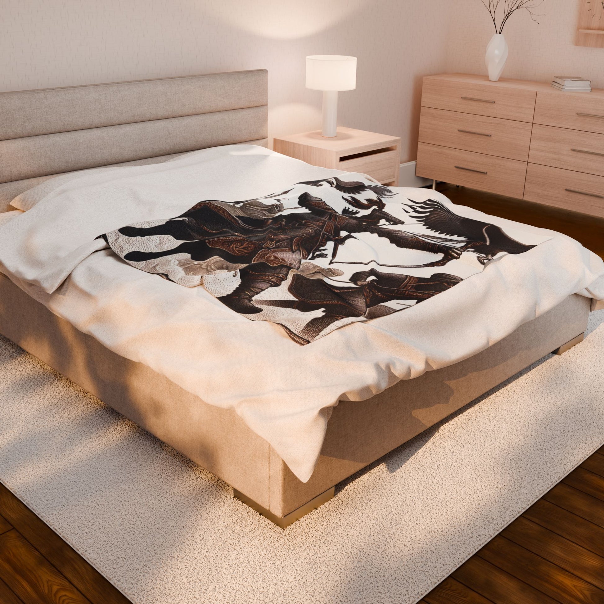 Dynamic warriors stride with intricate, detailed armor, vividly capturing historic valor. Majestic eagles, poised mid-flight, add a regal, mythical allure. The intricate linework crafts a vibrant tapestry of movement, blending human and avian forms in a striking depiction of unity and strength. Create a cozy and warm atmosphere at home with this plush velveteen blanket. It is soft to touch and perfect for any home. Customize with a one-sided print to add your personal touch or create a gift for your friends and family. Available in three sizes: 30x40", 50x60", 60x80".