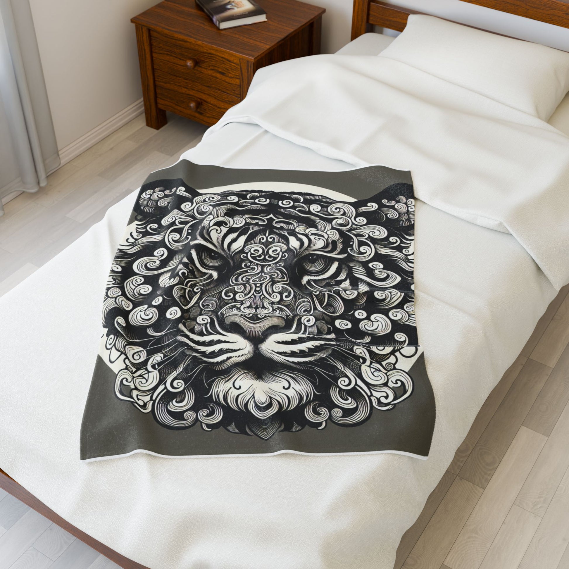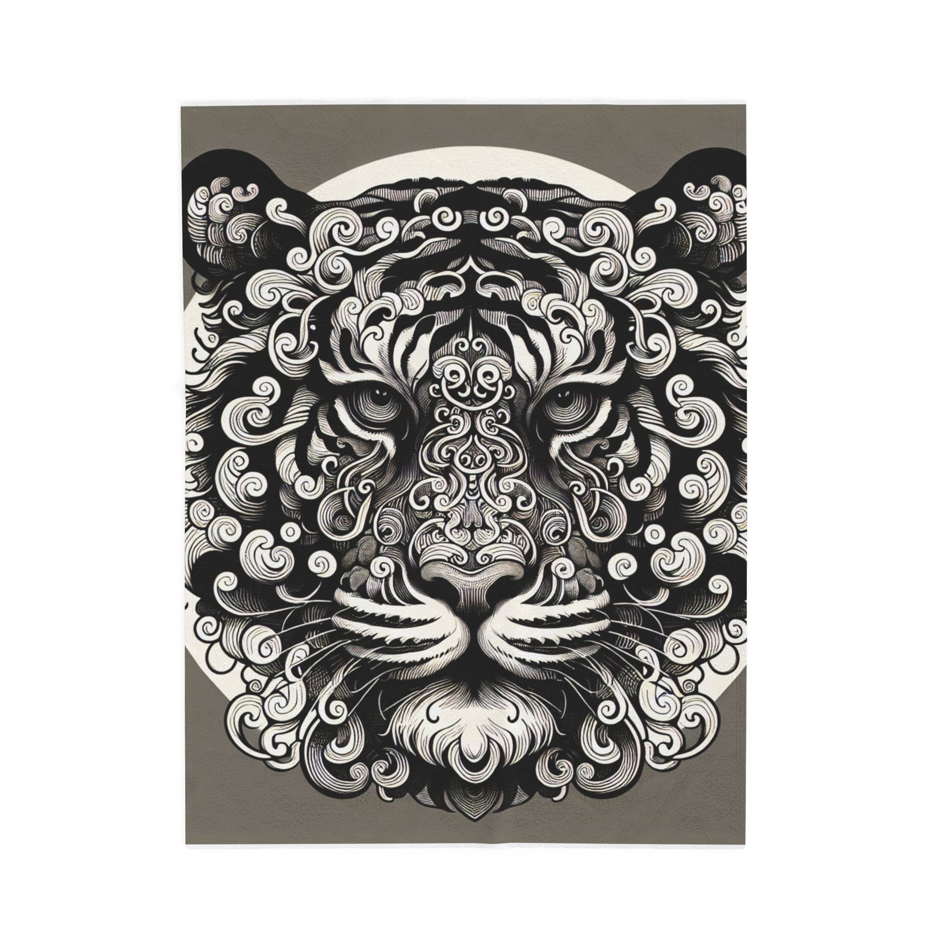 This illustration features an intricately designed tiger face composed of swirling, ornate patterns. Bold black and white lines create a vibrant contrast, adding depth and dimension. The artistic harmony of curves and symmetry evokes a sense of mystique and elegance in the composition. Create a cozy and warm atmosphere at home with this plush velveteen blanket. It is soft to touch and perfect for any home. Customize with a one-sided print to add your personal touch or create a gift for your friends and family. Available in three sizes: 30x40", 50x60", 60x80".