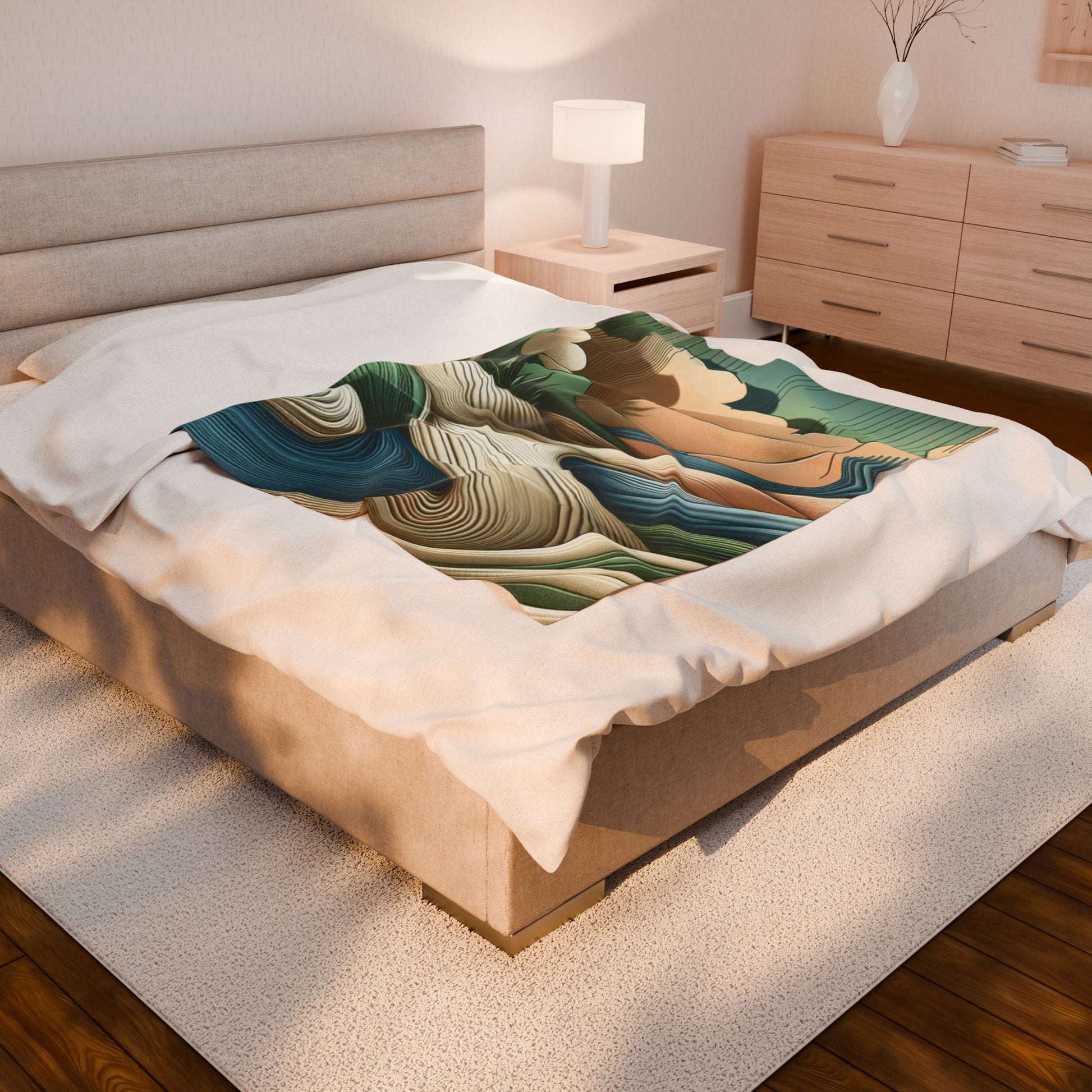 This image features fluid, layered landscapes in soothing pastel hues, blending waves and clouds seamlessly. It evokes a sense of serenity with its captivating, rhythmic patterns and textures, creating a dreamy, surreal atmosphere. Create a cozy and warm atmosphere at home with this plush velveteen blanket. It is soft to touch and perfect for any home. Customize with a one-sided print to add your personal touch or create a gift for your friends and family. Available in three sizes: 30x40", 50x60", 60x80".