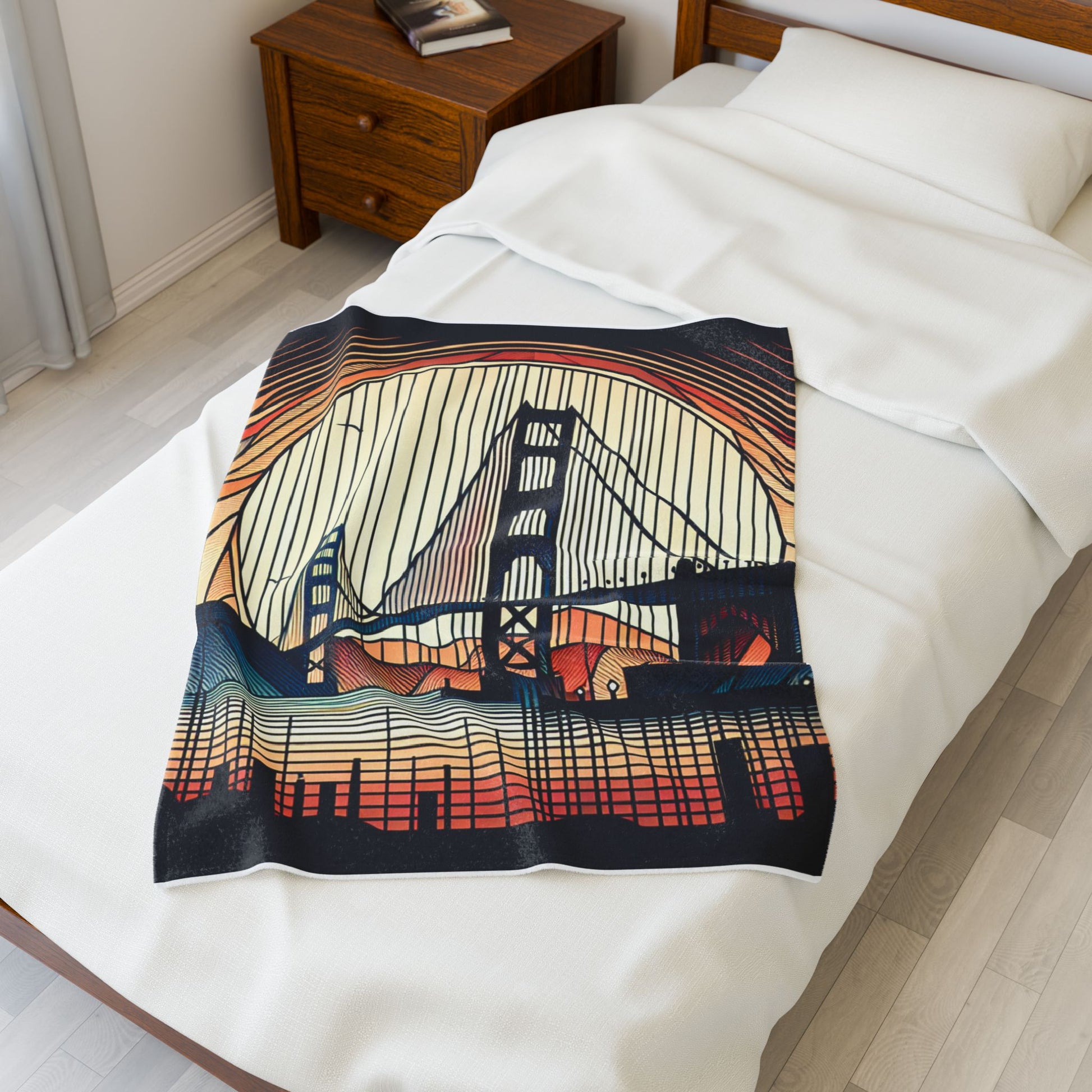 Stylized graphic of a bridge, portrayed with bold lines and a vivid sunset palette. The use of geometric patterns adds a modern twist to the iconic structure. Create a cozy and warm atmosphere at home with this plush velveteen blanket. It is soft to touch and perfect for any home. Customize with a one-sided print to add your personal touch or create a gift for your friends and family. Available in three sizes: 30x40", 50x60", 60x80".