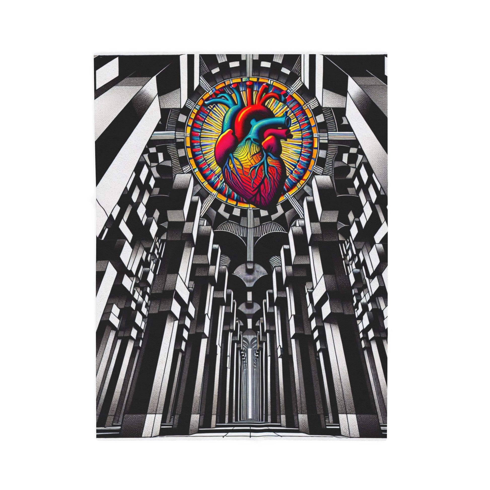 A surreal fusion of a black-and-white geometric cathedral with a vibrant stained-glass heart at its center, blending organic vitality with architectural precision, creating a striking contrast that mesmerizes and evokes introspection. Create a cozy and warm atmosphere at home with this plush velveteen blanket. It is soft to touch and perfect for any home. Customize with a one-sided print to add your personal touch or create a gift for your friends and family. Available in three sizes: 30x40", 50x60", 60x80".