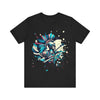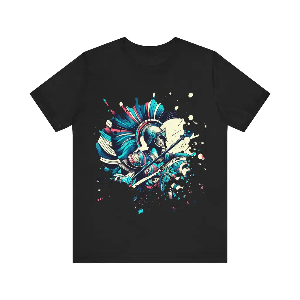 A dynamic, splatter art piece portrays a warrior in stylized armor. Vibrant blues and pinks blend with bold lines, creating a sense of motion and energy. The image bursts with creativity, merging classical heroism with contemporary graphic flair.. This classic unisex jersey short sleeve tee fits like a well-loved favorite. Soft cotton and quality print make users fall in love with it over and over again. These t-shirts have-ribbed knit collars to bolster shaping. The shoulders are tapered for a better fit over time. Dual side seams hold the garment's shape for longer.
