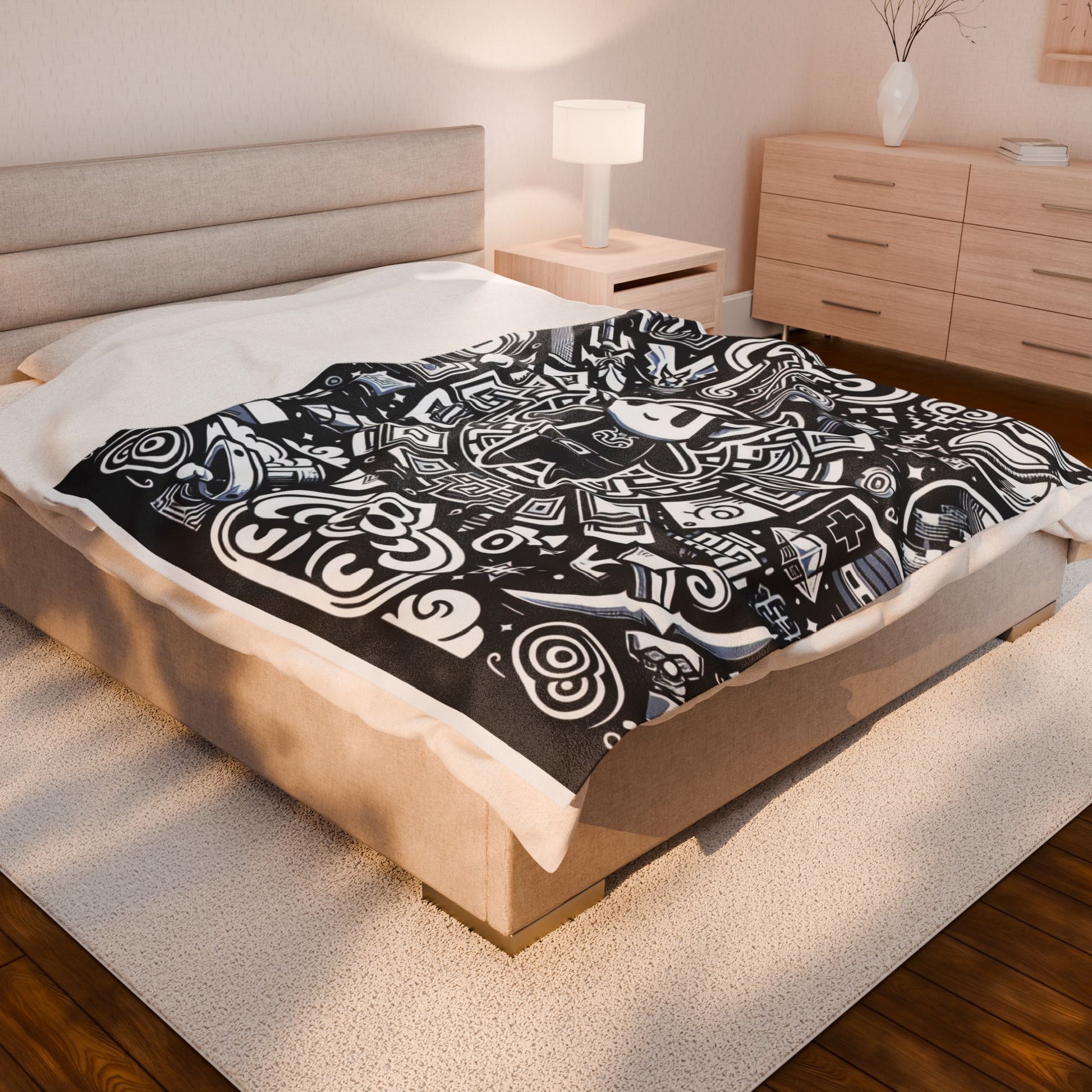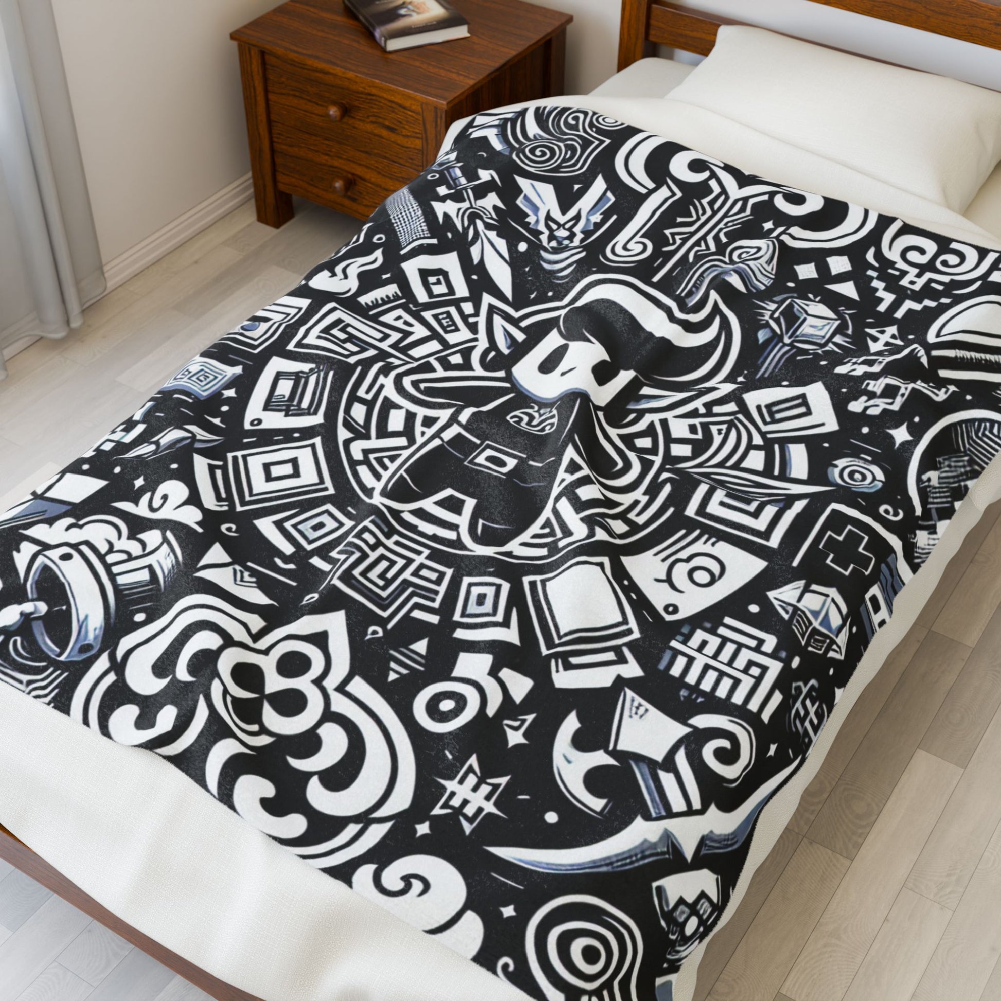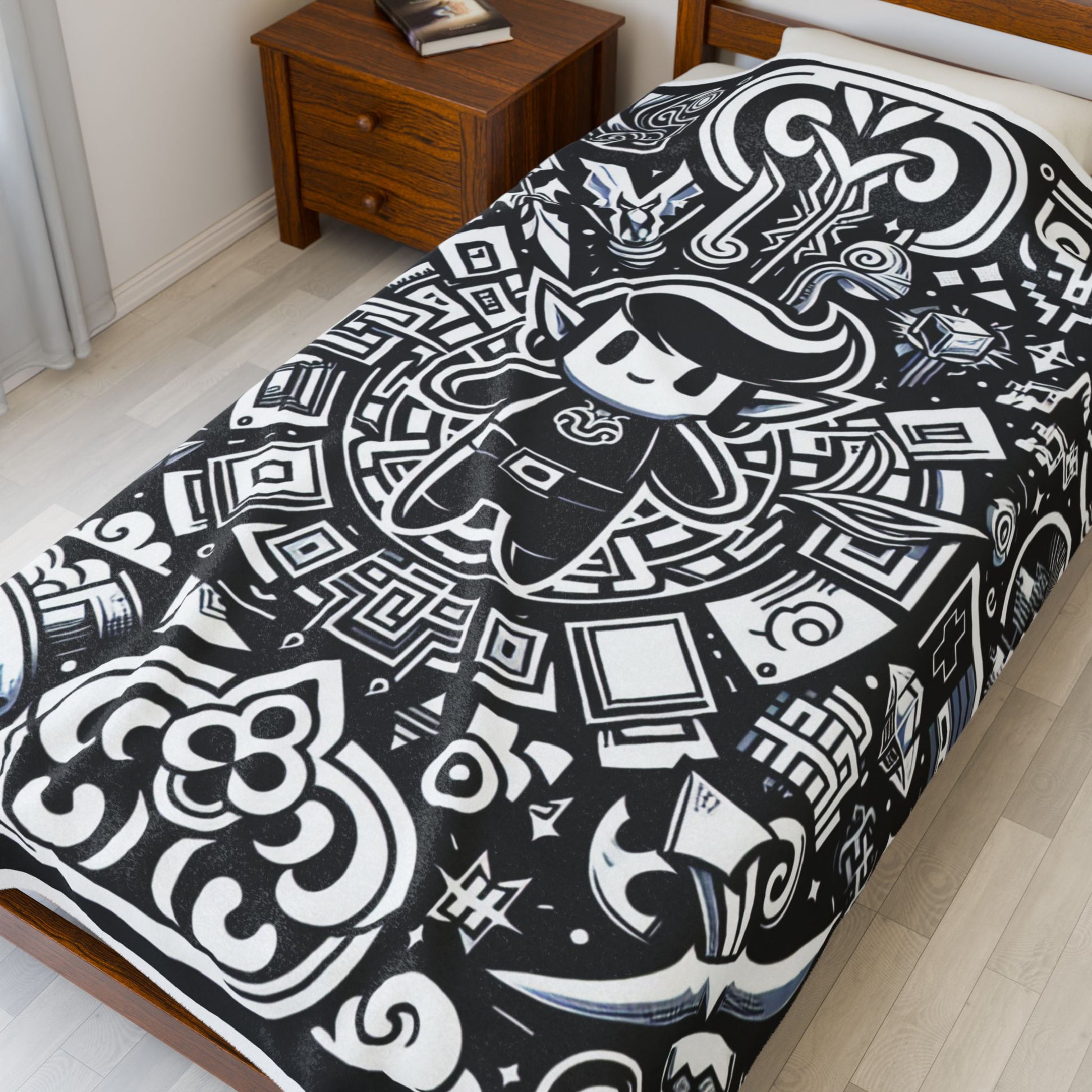 A whimsical black-and-white illustration features a central character surrounded by intricate, retro gaming motifs and geometric patterns. The design blends classic gaming imagery with modern graphic art, creating a nostalgic yet innovative visual tapestry that captivates with its detailed, symmetrical composition. Create a cozy and warm atmosphere at home with this plush velveteen blanket. It is soft to touch and perfect for any home. Customize with a one-sided print to add your personal touch or create a gift for your friends and family. Available in three sizes: 30x40", 50x60", 60x80".