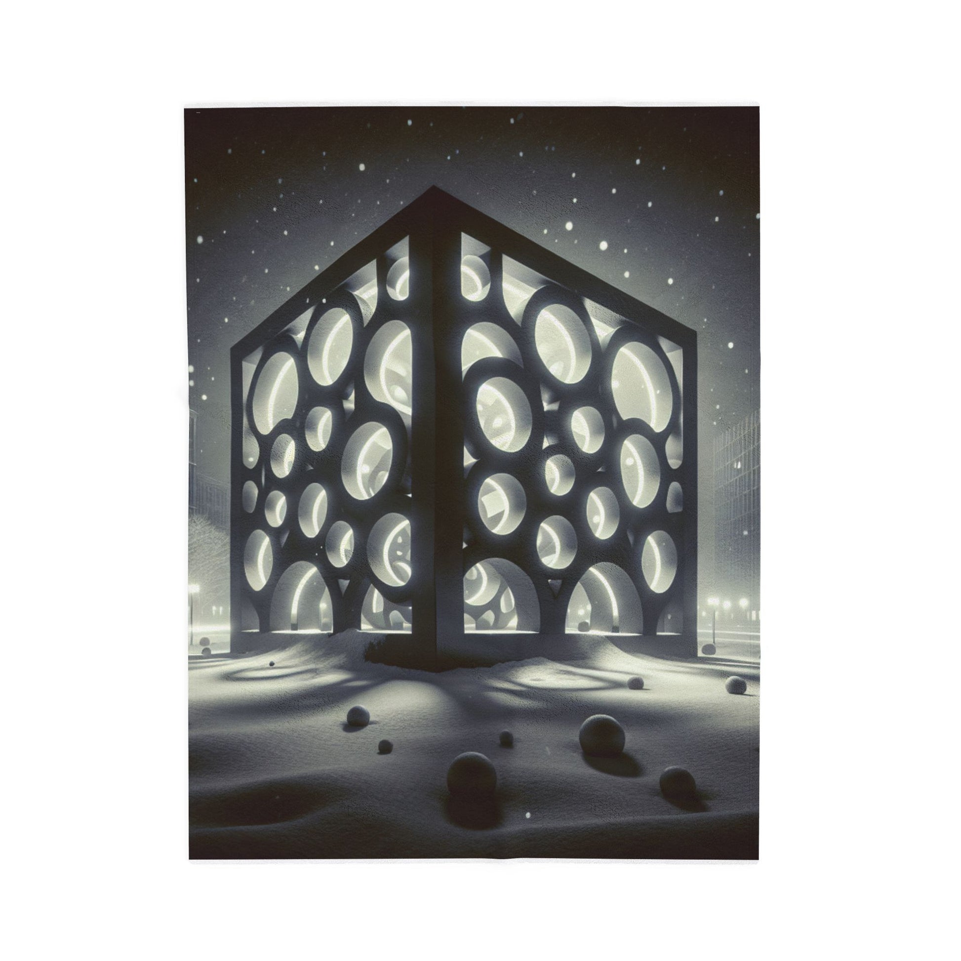 A luminous cube with circular cutouts stands amid a snowy urban nightscape, radiating ethereal light. Snowflakes gently fall, accentuating the modern design and reflective surfaces, creating a serene, futuristic ambience. Create a cozy and warm atmosphere at home with this plush velveteen blanket. It is soft to touch and perfect for any home. Customize with a one-sided print to add your personal touch or create a gift for your friends and family. Available in three sizes: 30x40", 50x60", 60x80".