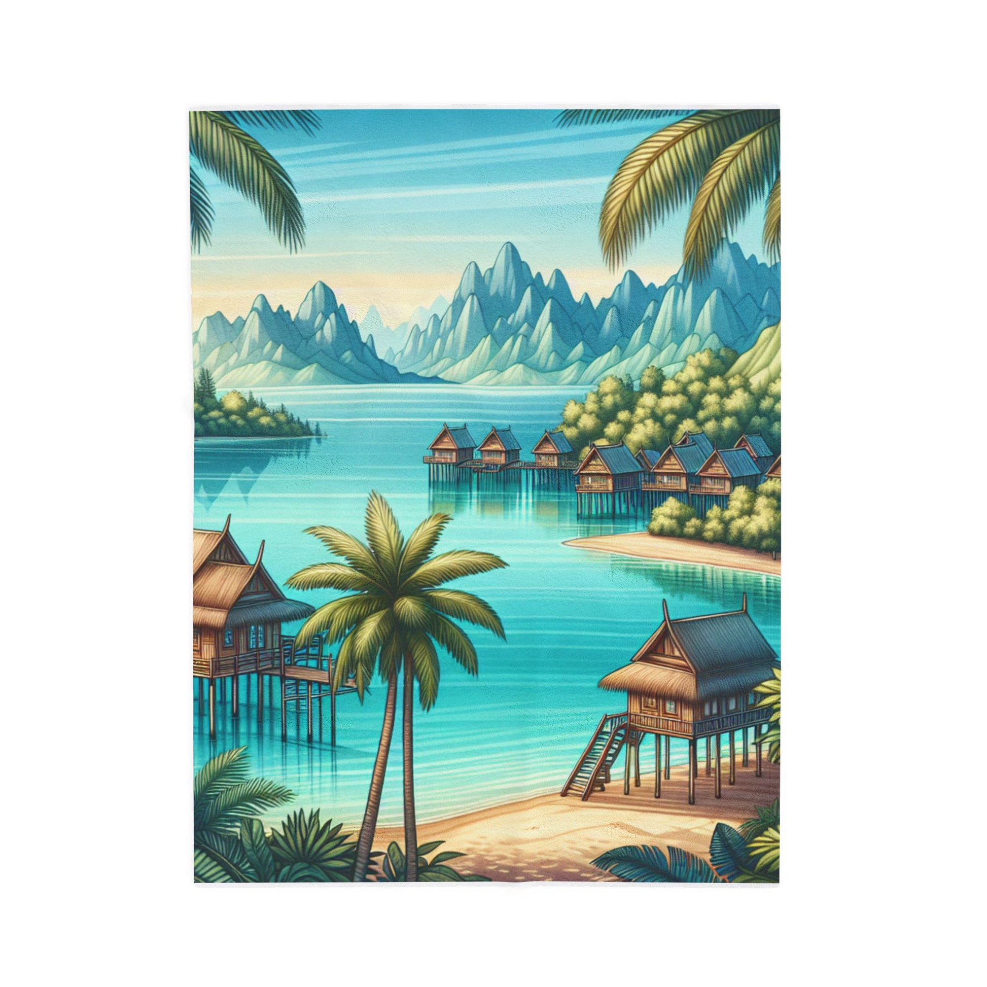 Tropical idyll with vibrant turquoise waters, overwater bungalows, and lush green palms. The serene, mountainous backdrop adds depth, creating a harmonious blend of nature and architecture, inviting tranquility and adventure. Create a cozy and warm atmosphere at home with this plush velveteen blanket. It is soft to touch and perfect for any home. Customize with a one-sided print to add your personal touch or create a gift for your friends and family. Available in three sizes: 30x40", 50x60", 60x80".