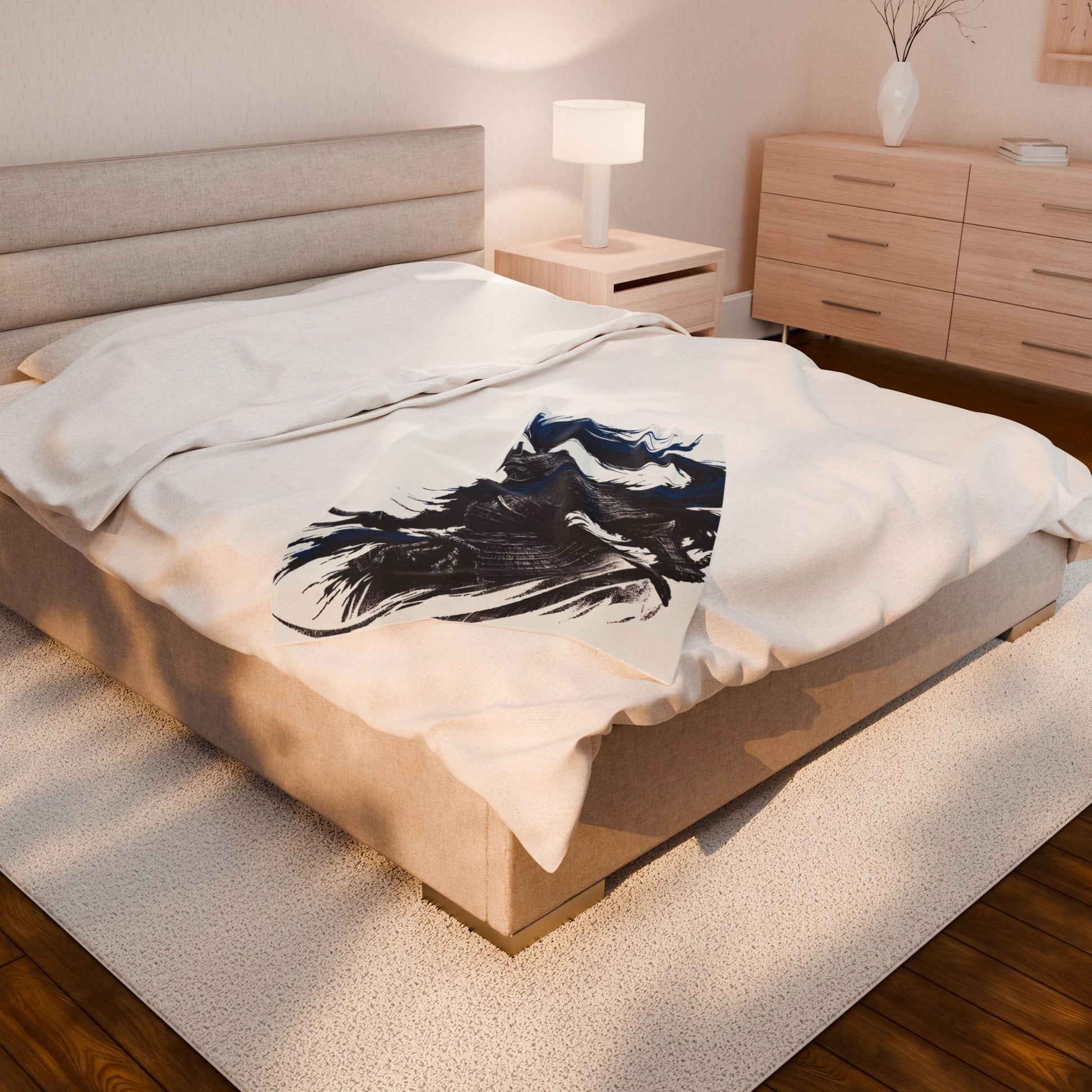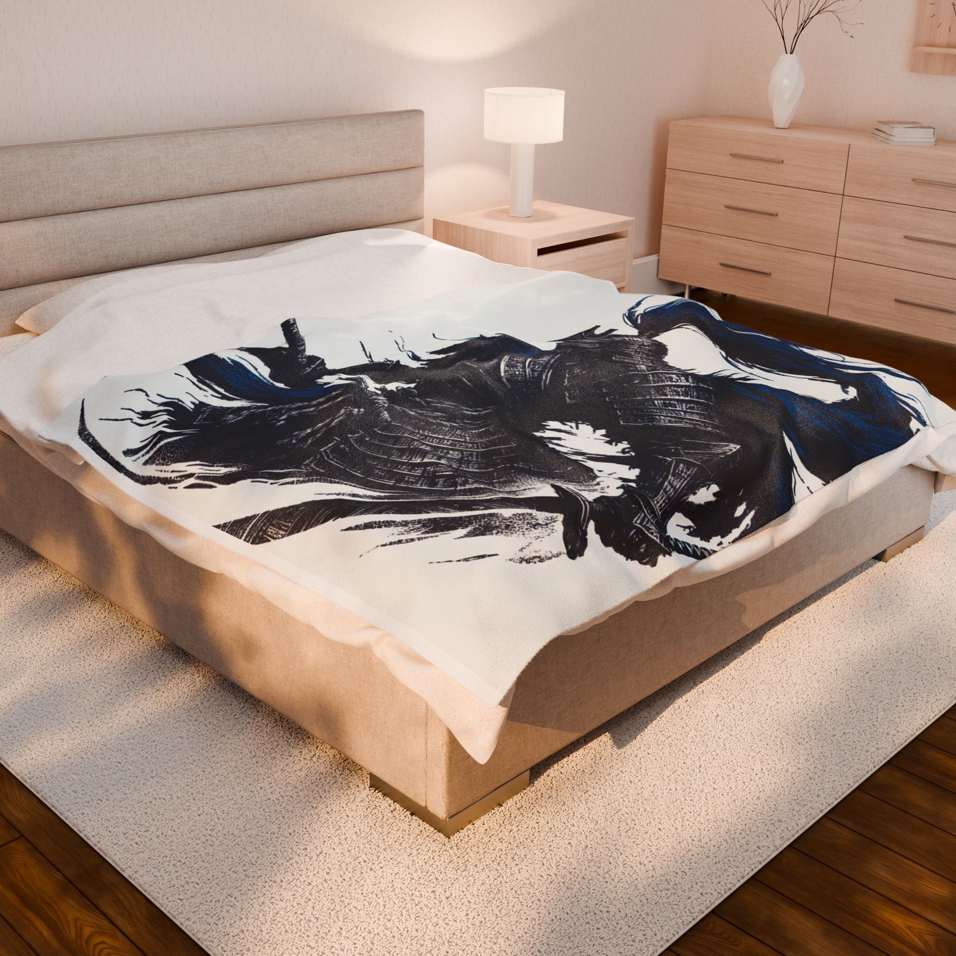 A dynamic portrayal of a samurai, richly detailed armor contrasts with flowing indigo accents, creating a sense of motion and intensity. The dramatic brushstrokes add depth and energy, enhancing the mythical warrior's commanding presence. Create a cozy and warm atmosphere at home with this plush velveteen blanket. It is soft to touch and perfect for any home. Customize with a one-sided print to add your personal touch or create a gift for your friends and family. Available in three sizes: 30x40", 50x60", 60x80".