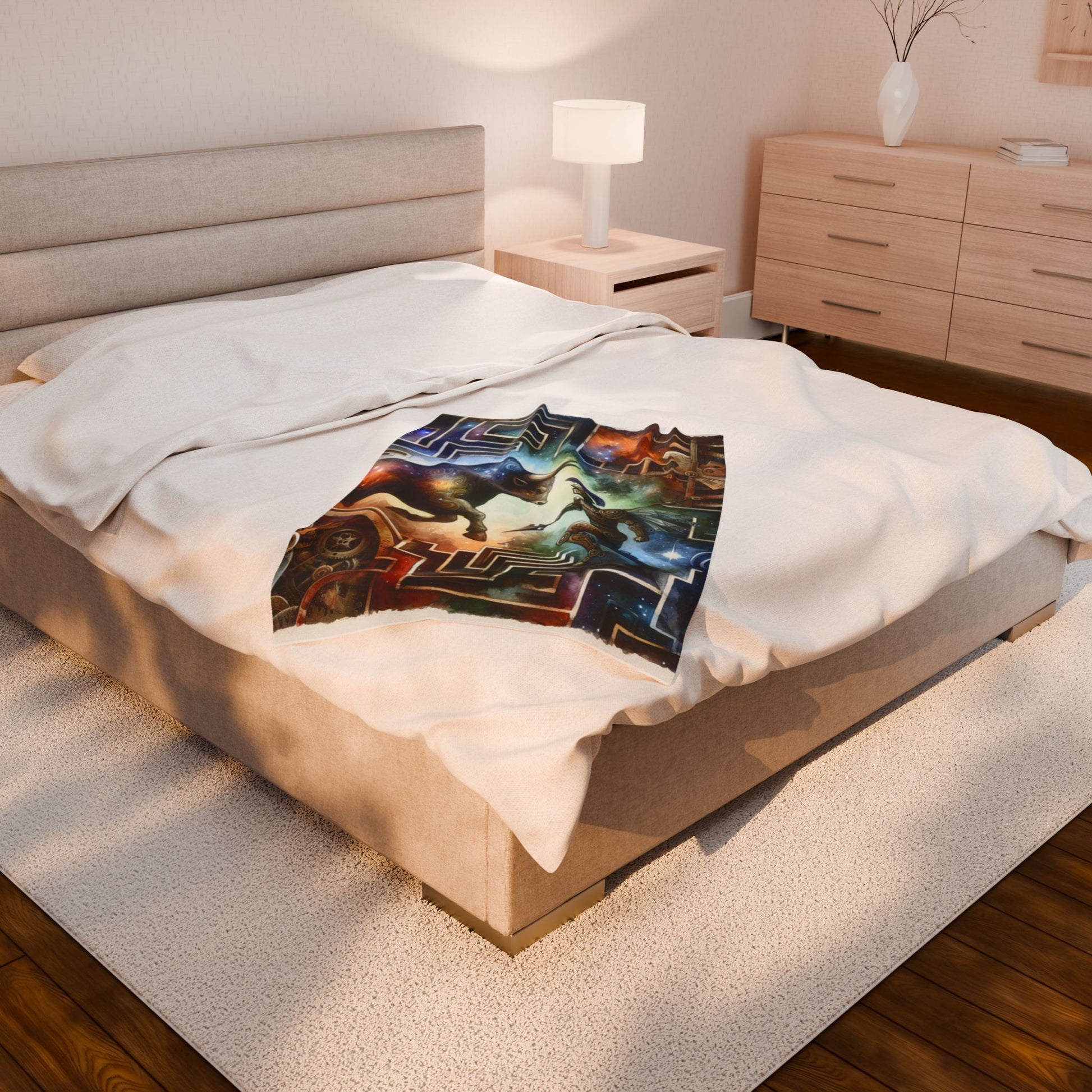 A mythic fusion of cosmic swirls and steampunk gears, featuring a celestial bull and armored warrior entwined in a labyrinthine dance of time and space, symbolizing an eternal clash between nature and technology. Create a cozy and warm atmosphere at home with this plush velveteen blanket. It is soft to touch and perfect for any home. Customize with a one-sided print to add your personal touch or create a gift for your friends and family. Available in three sizes: 30x40", 50x60", 60x80".
