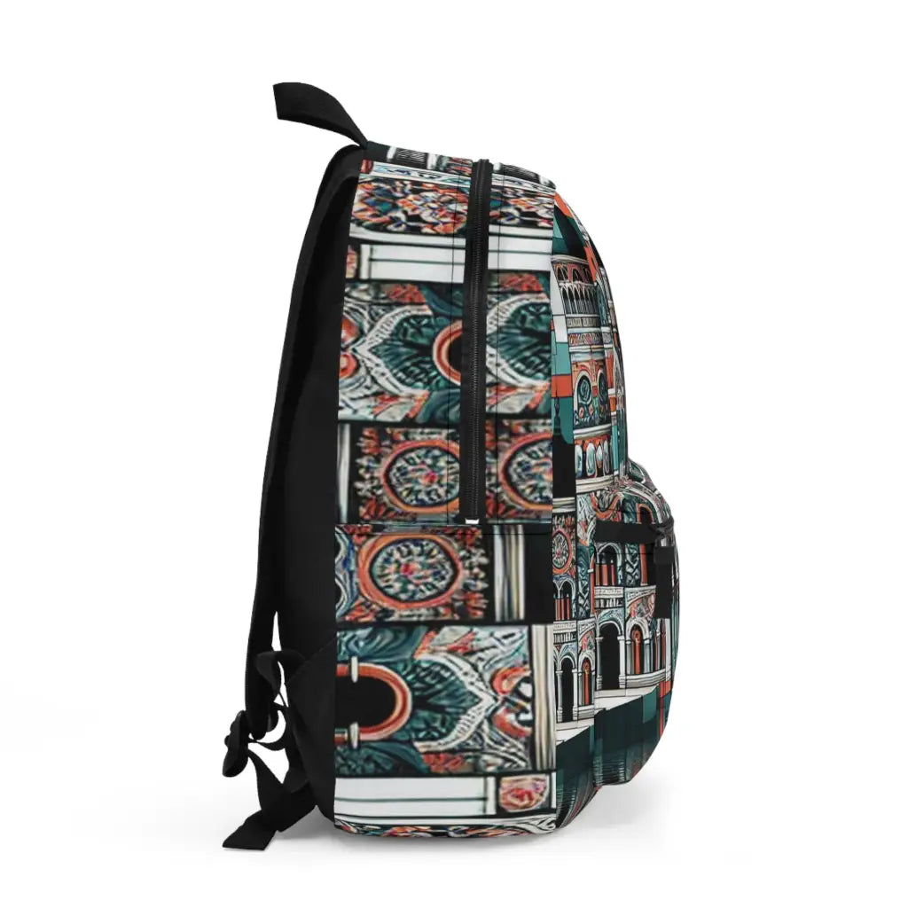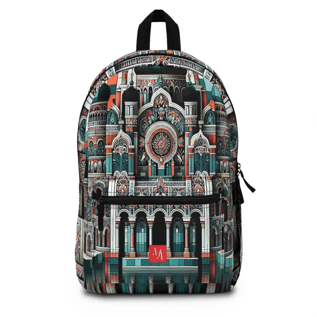 This intricate illustration showcases a fantastical structure blending Middle Eastern and Eastern European architectural influences. Vibrant teal, coral, and black mosaics adorn domes and arches, while birds and reflections on a surreal water surface evoke a dreamlike atmosphere. Introducing the ultimate backpack for fashion-forward adventurers! Our backpack boasts a striking textile design that will make a statement wherever you go. With its durable construction and spacious compartments, it is perfect for carrying all your essentials. Get ready to turn heads and stay organized with our backpack. #textiledesign #backpack #fashionforward #adventure #durable #spacious #statementpiece #organized #essentials #travel #explore