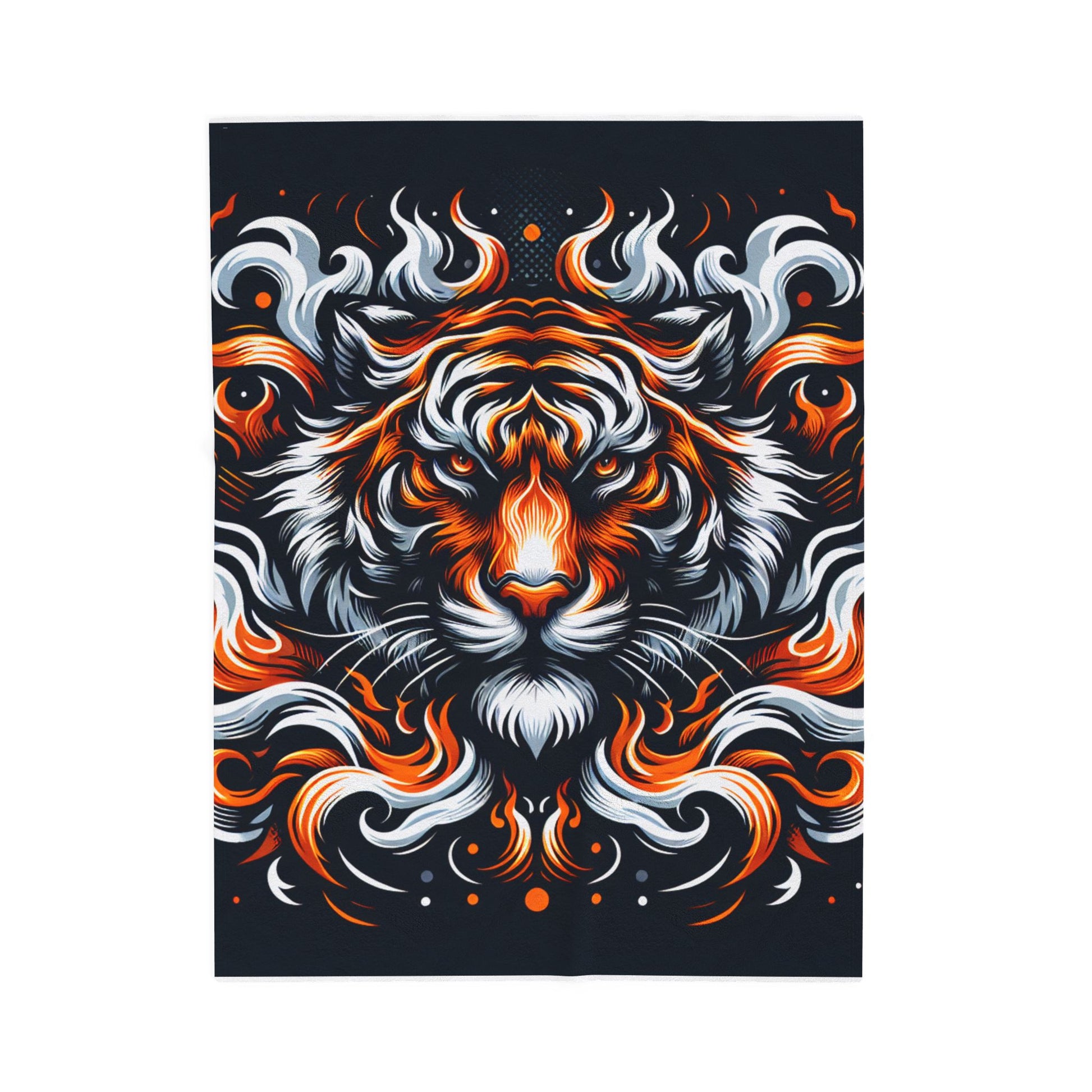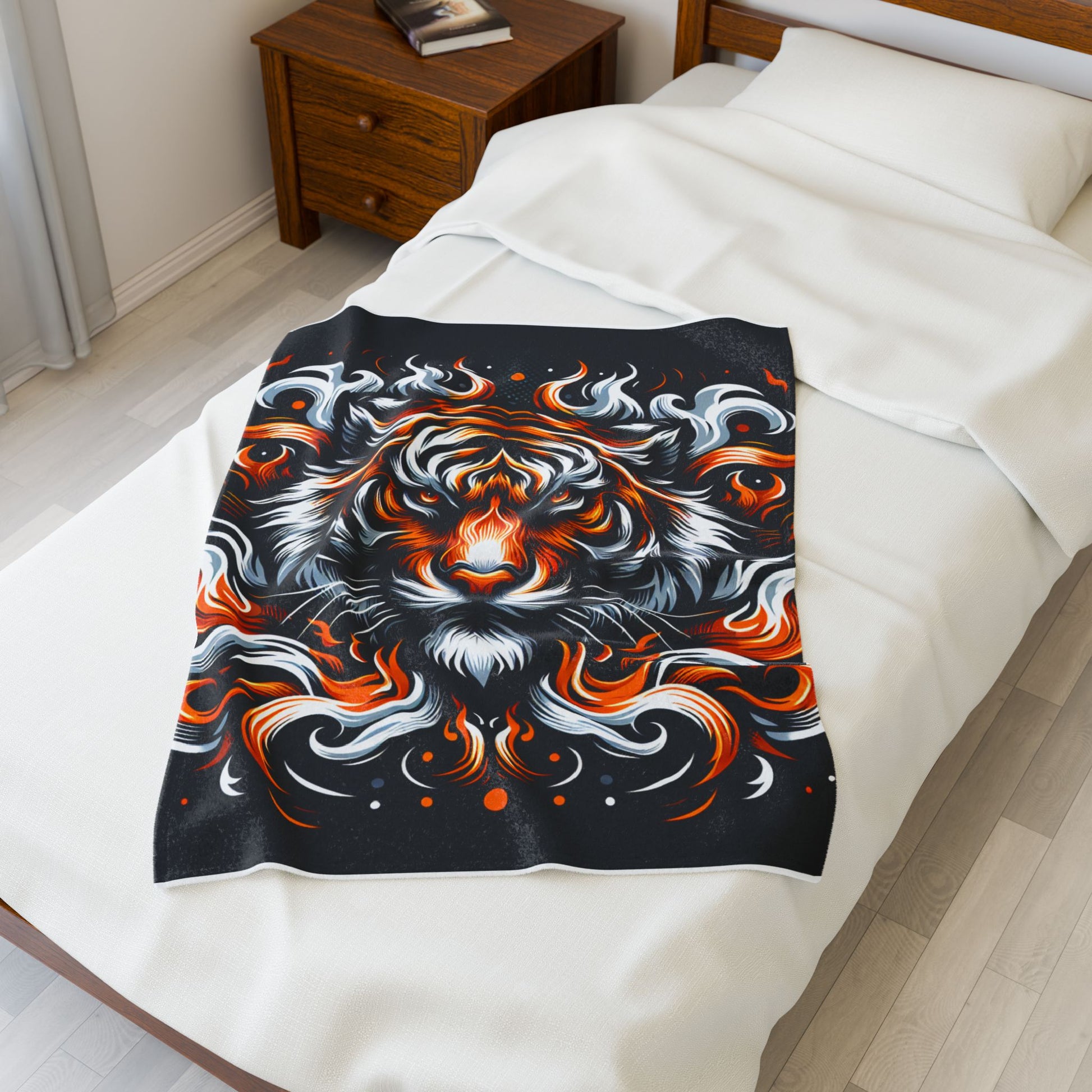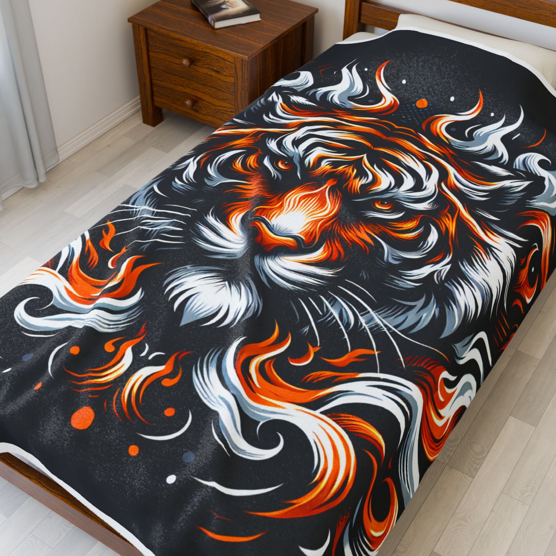 In this vibrant artwork, a tiger's fierce visage emerges from swirling, flame-like patterns. Bold strokes of orange and white highlight its majestic presence against a dark backdrop, creating a mesmerizing fusion of form and energy. Create a cozy and warm atmosphere at home with this plush velveteen blanket. It is soft to touch and perfect for any home. Customize with a one-sided print to add your personal touch or create a gift for your friends and family. Available in three sizes: 30x40", 50x60", 60x80".