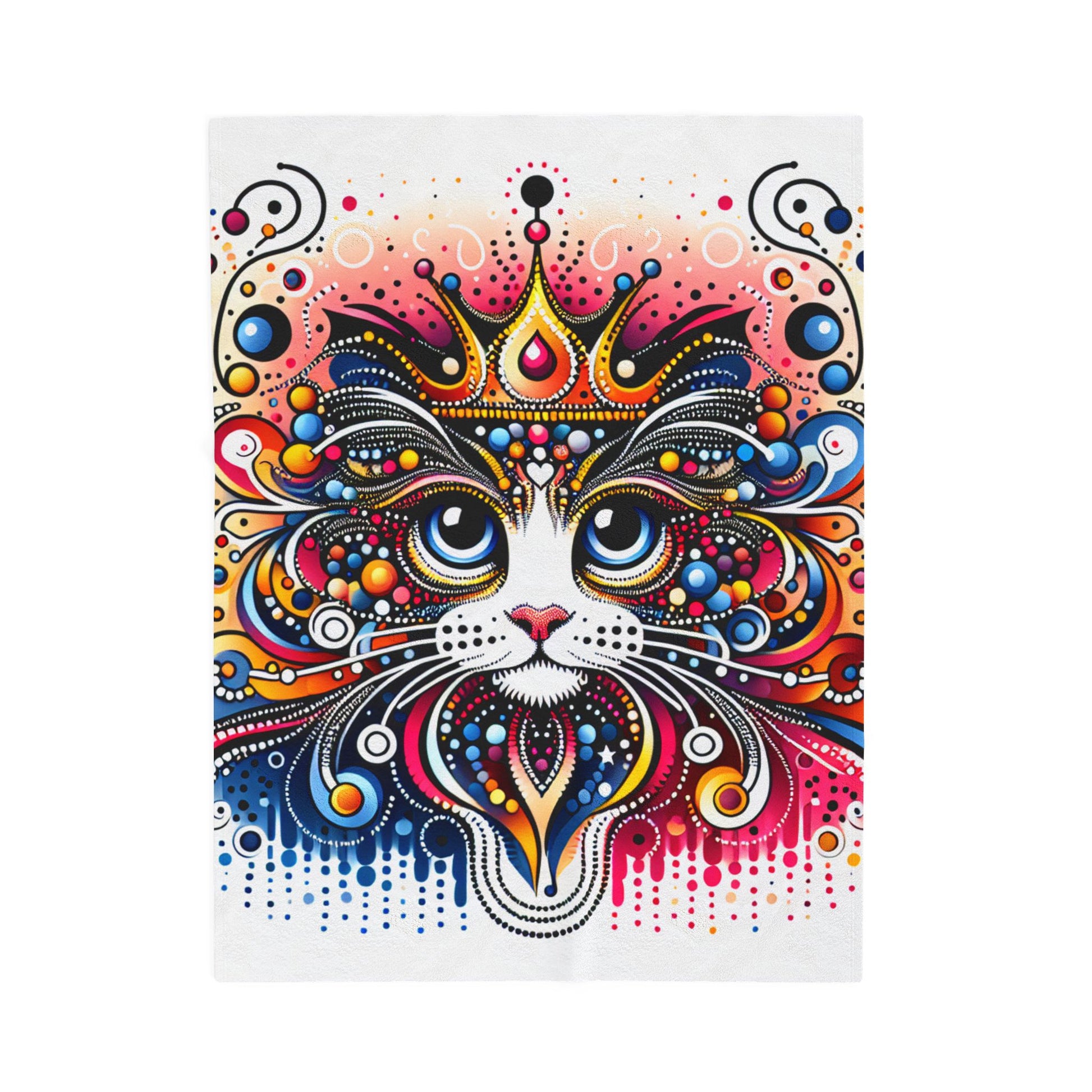 This vibrant artwork showcases a whimsical cat adorned with intricate patterns, swirling colors, and a regal crown. Its big eyes and symmetrical style create a kaleidoscopic effect, blending fantasy with pop art, capturing both majesty and playfulness in a dazzling visual feast. Create a cozy and warm atmosphere at home with this plush velveteen blanket. It is soft to touch and perfect for any home. Customize with a one-sided print to add your personal touch or create a gift for your friends and family. Available in three sizes: 30x40", 50x60", 60x80".