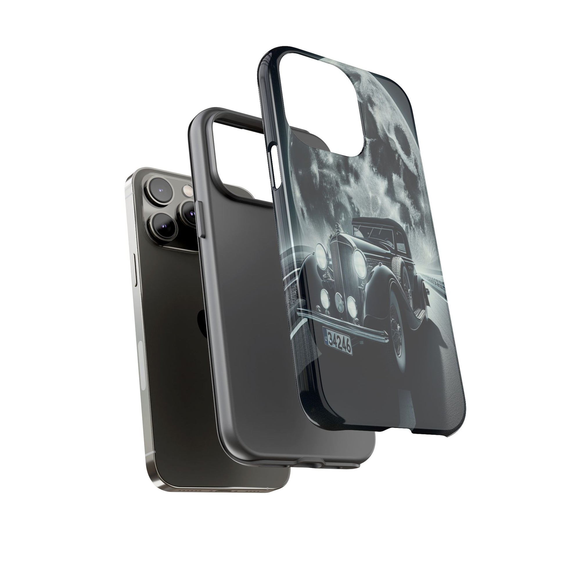 A vintage car drives down an endless road with a colossal, detailed full moon as the backdrop, creating a surreal blend of nostalgia and cosmic wonder. iPhone, Samsung Galaxy, and Google Pixel devices with premium-quality custom protective phone cases. Every case has double layers for extra durability and protection while the clear, open ports stay out of your way when it comes to charging. The outer polycarbonate shell will resist daily impacts. Choose between matte or glossy finish and enjoy adding a unique touch to your phone with our custom protective phone cases sourced from Korea.