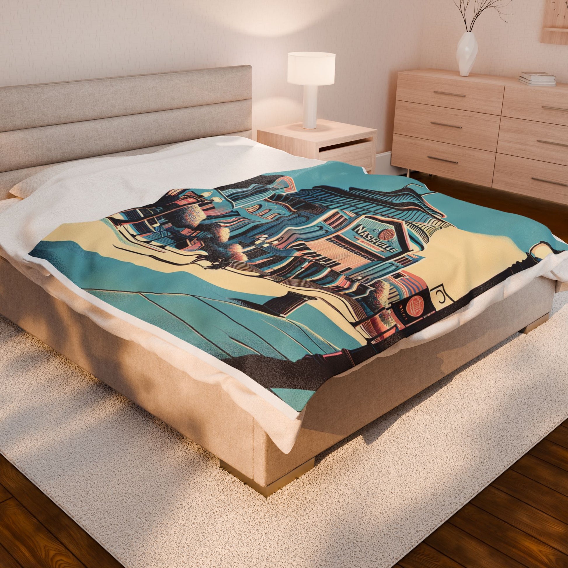 This stylized illustration captures a vibrant urban scene with art deco influences. It features prominent architecture and signage, boasting a retro-futuristic vibe with a limited but bold color palette. Shadows and light play on the buildings and street, enhancing the sense of a clear, bright day. Create a cozy and warm atmosphere at home with this plush velveteen blanket. It is soft to touch and perfect for any home. Customize with a one-sided print to add your personal touch or create a gift for your friends and family. Available in three sizes: 30x40", 50x60", 60x80".