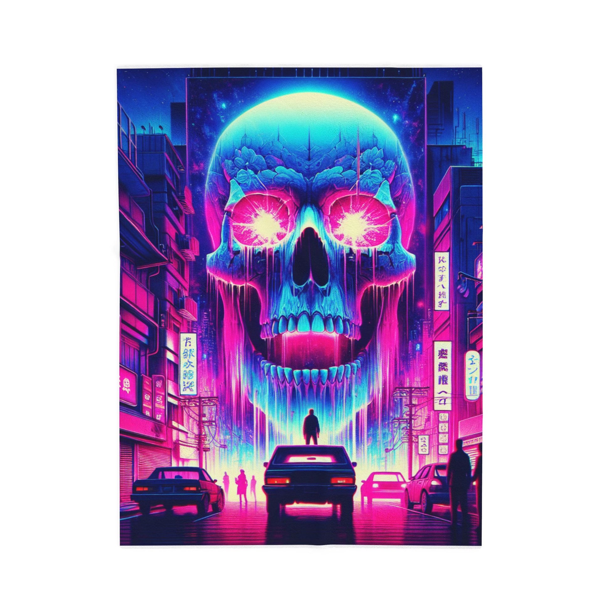 A colossal, luminous skull dominates a vibrant, neon-soaked cityscape, evoking a surreal fusion of cyberpunk and mysticism. The glowing pink and blue hues create a mesmerizing contrast, while shadowy figures and sleek cars add dynamic tension, crafting a futuristic, otherworldly atmosphere. Create a cozy and warm atmosphere at home with this plush velveteen blanket. It is soft to touch and perfect for any home. Customize with a one-sided print to add your personal touch or create a gift for your friends and family. Available in three sizes: 30x40", 50x60", 60x80".