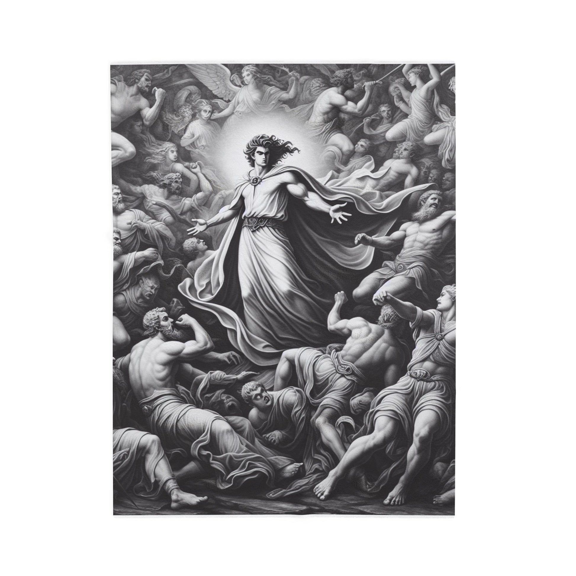 The image depicts a monochromatic scene brimming with dynamic figures, dominated by a central character radiant with light, suggesting divine or mythological narratives. The artwork is rich in texture and movement, capturing a moment of intense drama. Create a cozy and warm atmosphere at home with this plush velveteen blanket. It is soft to touch and perfect for any home. Customize with a one-sided print to add your personal touch or create a gift for your friends and family. Available in three sizes: 30x40", 50x60", 60x80".