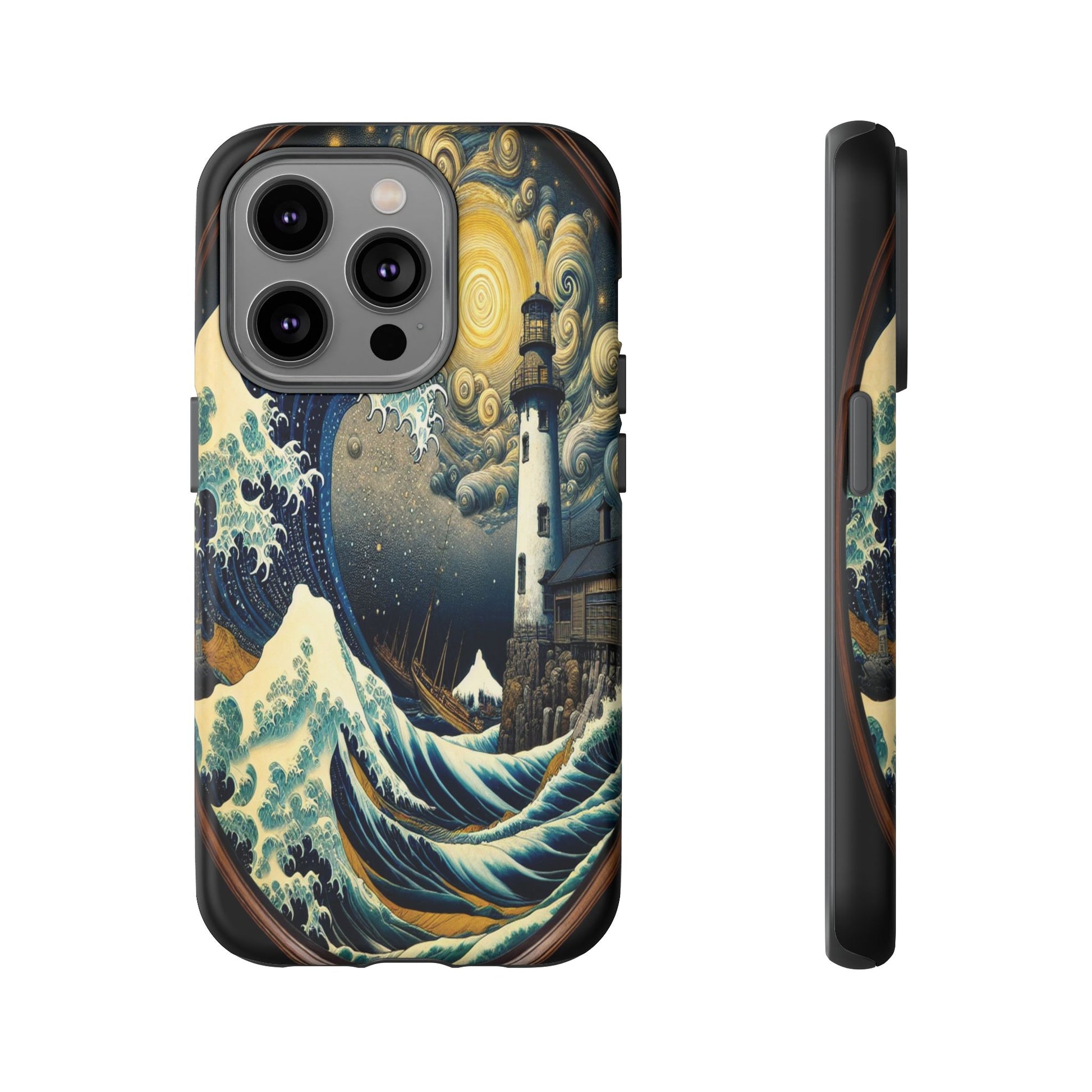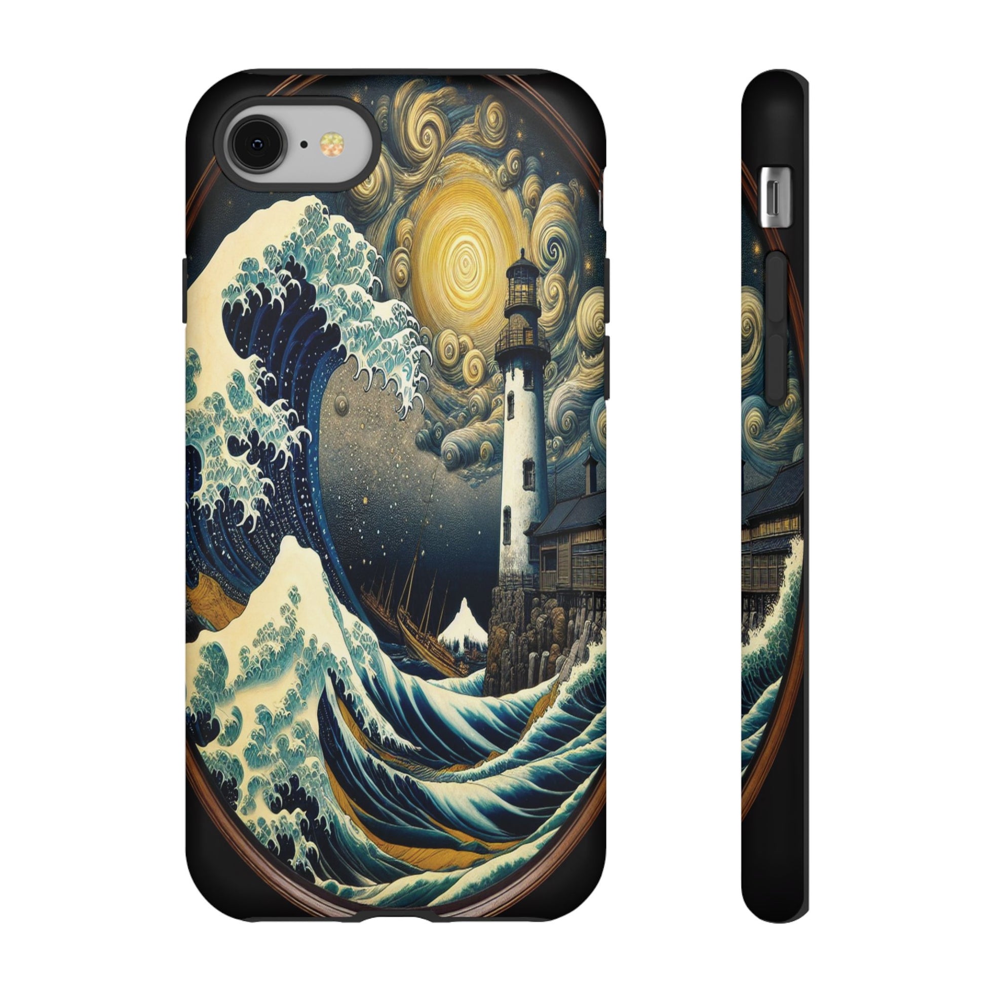 This imaginative artwork blends Van Gogh's swirling skies with Hokusai's dramatic waves, featuring a radiant sun, ships battling the sea, and a steadfast lighthouse. The circular frame enhances its celestial, dreamlike quality. Protect your phone in style with our premium-quality custom protective phone cases, designed to fit iPhones from the latest iPhone 16 to earlier models like iPhone XR, XS, and X. Each case features double-layer protection with a durable polycarbonate outer shell and a soft TPU lining for extra impact resistance, making it ideal for daily use.