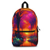 A mystical forest scene bathed in vibrant hues of magenta and orange. Lush, glowing foliage illuminates the tranquil stream, casting ethereal reflections. The interplay of light and shadow creates a dreamlike atmosphere, inviting a sense of wonder and enchantment in this surreal, otherworldly landscape. Introducing the ultimate backpack for fashion-forward adventurers! Our backpack boasts a striking textile design that will make a statement wherever you go. With its durable construction and spacious compartments, it is perfect for carrying all your essentials. Get ready to turn heads and stay organized with our backpack. #textiledesign #backpack #fashionforward #adventure #durable #spacious #statementpiece #organized #essentials #travel #explore