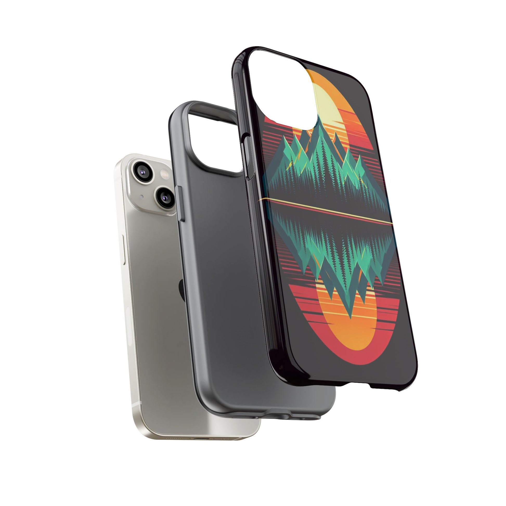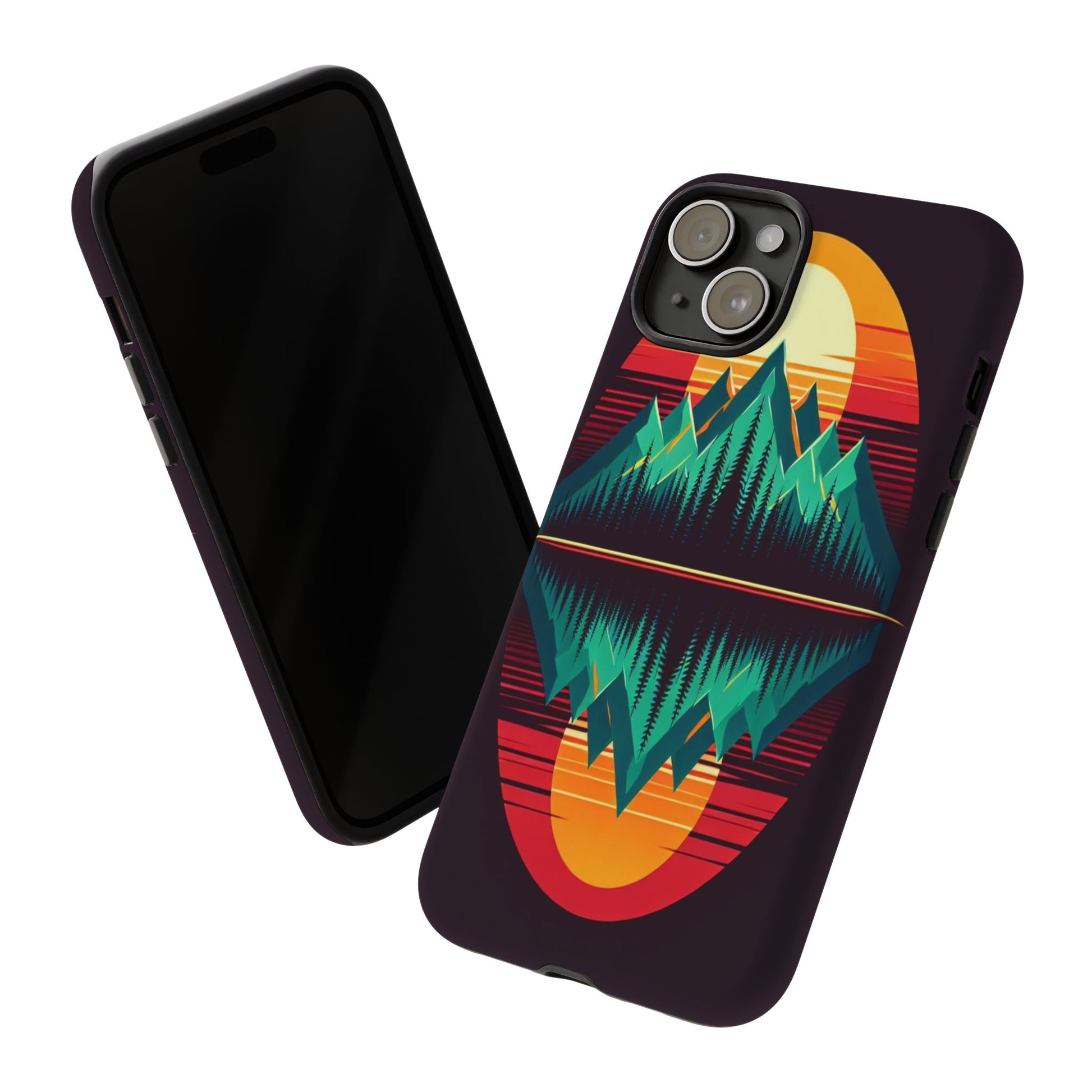 A stunning sunset scene with abstract mountains and pine trees, mirrored perfectly on a serene lake. Vivid orange and teal tones create a striking contrast, encapsulating the tranquility and grandeur of nature in a modern, geometric style. iPhone, Samsung Galaxy, and Google Pixel devices with premium-quality custom protective phone cases. Every case has double layers for extra durability and protection while the clear, open ports stay out of your way when it comes to charging. The outer polycarbonate shell will resist daily impacts. Choose between matte or glossy finish and enjoy adding a unique touch to your phone with our custom protective phone cases sourced from Korea.