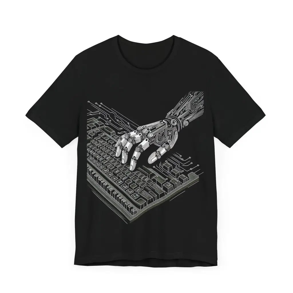 Futuristic and intricate, this image features a robotic hand with circuit-inspired patterns typing on a keyboard. The monochromatic design emphasizes the blend of technology and art, with detailed circuitry lines extending into the background, creating an engaging visual of digital innovation.. This classic unisex jersey short sleeve tee fits like a well-loved favorite. Soft cotton and quality print make users fall in love with it over and over again. These t-shirts have-ribbed knit collars to bolster shaping. The shoulders are tapered for a better fit over time. Dual side seams hold the garment's shape for longer.
