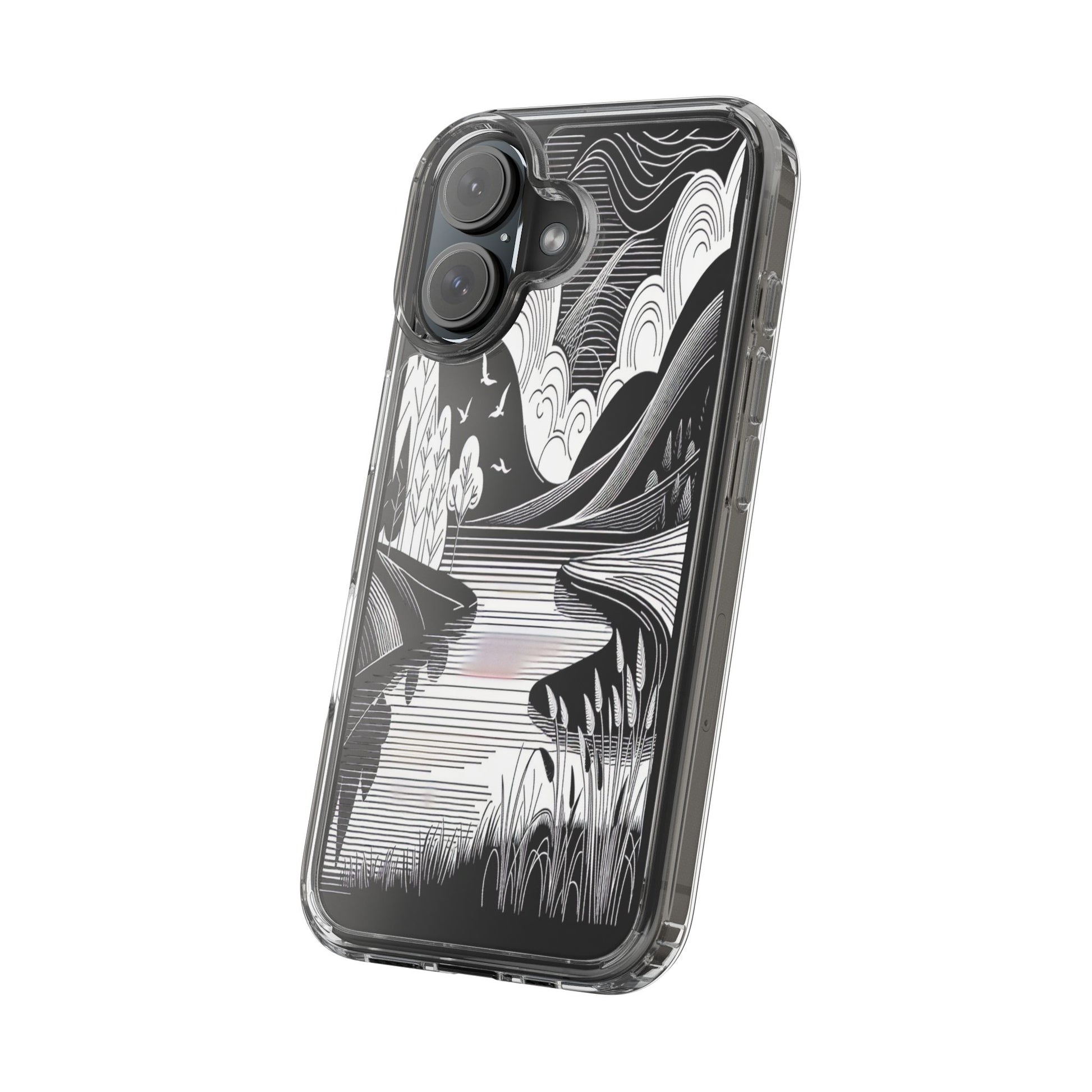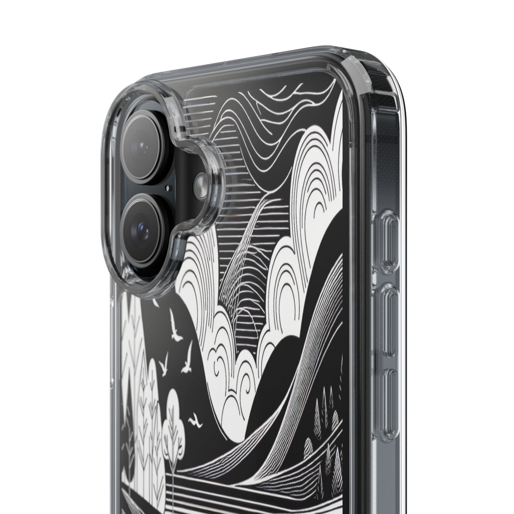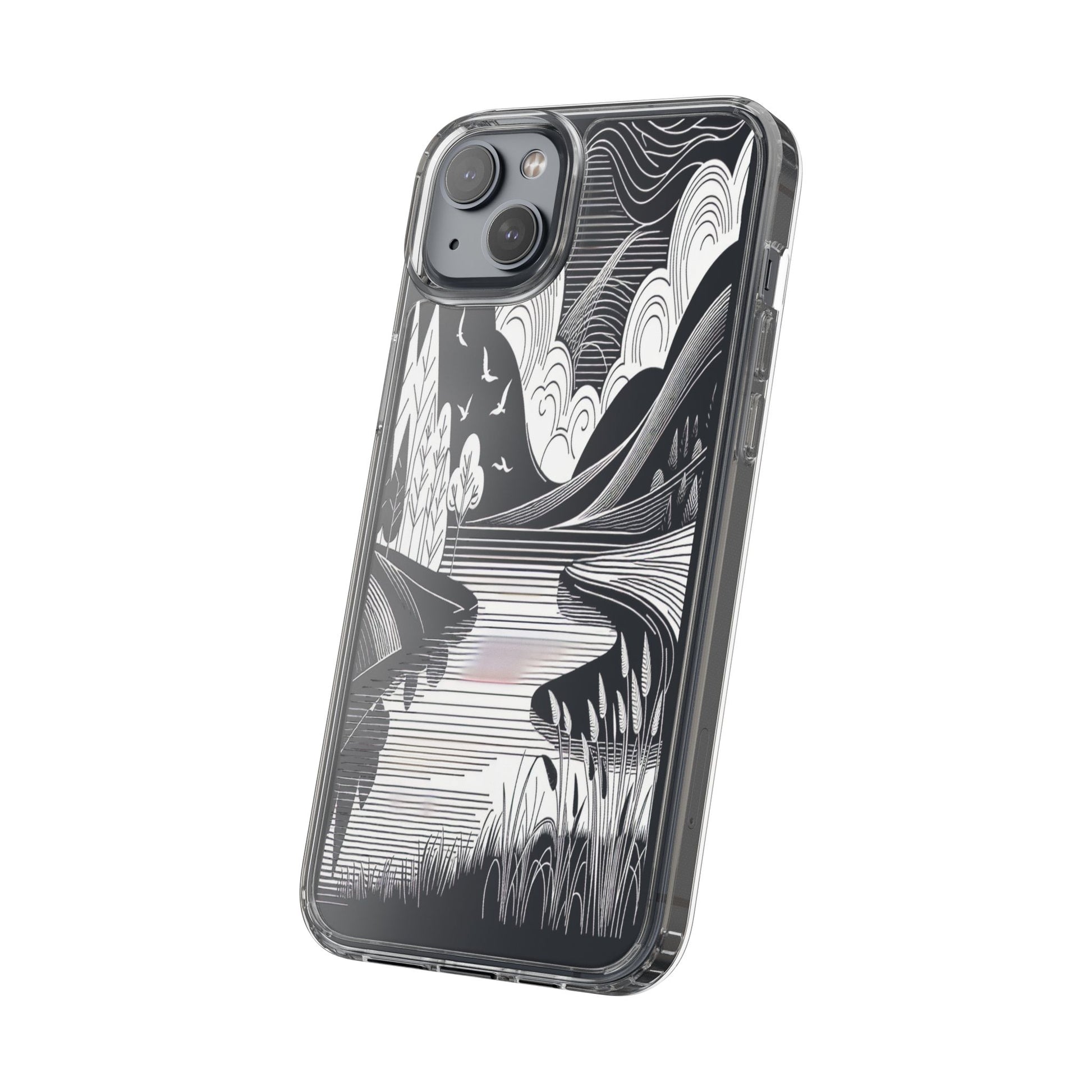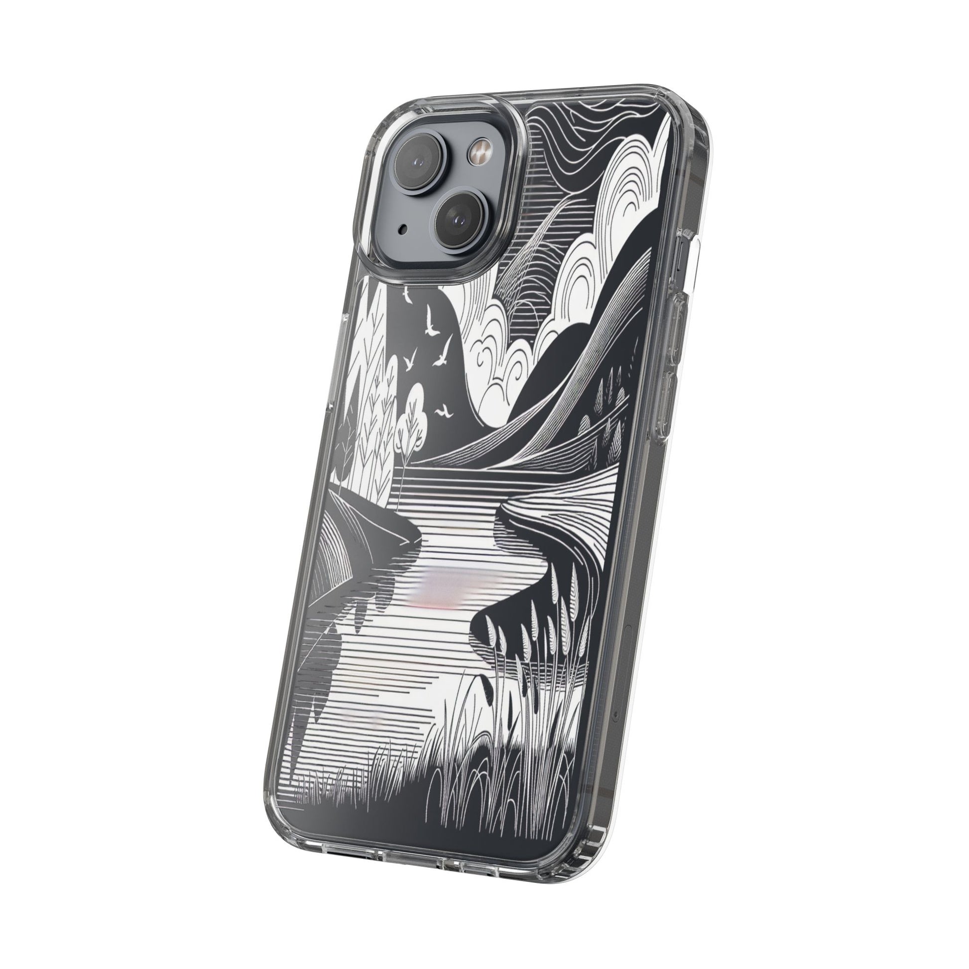 Stylized black and white landscape with sweeping lines and bold contrasts. Birds soar over abstract hills, and dynamic clouds swirl above a reflective lake, creating a harmonious blend of nature and geometry. Protect your phone while showcasing its sleek design with our customizable clear phone case, designed to fit iPhones from the latest iPhone 16 to earlier models like iPhone XR, XS, and X. This slim and lightweight case is perfect for guarding against daily wear and tear, offering shock-absorbing and scratch-resistant protection.