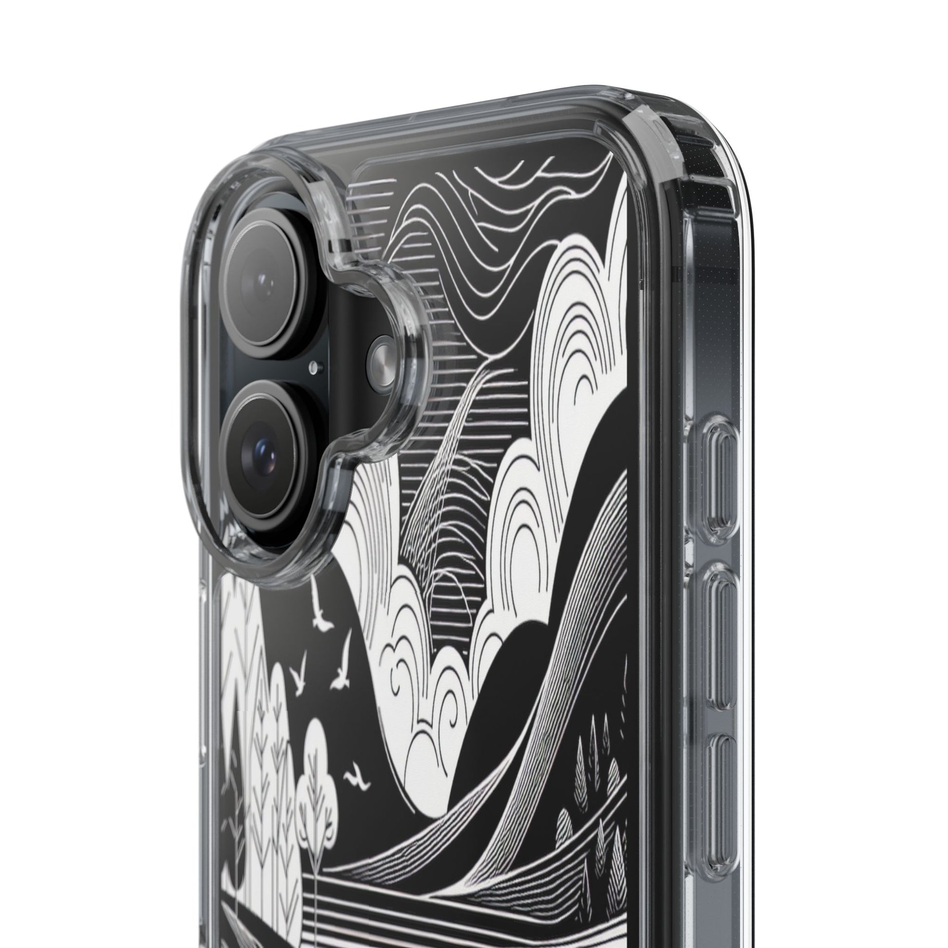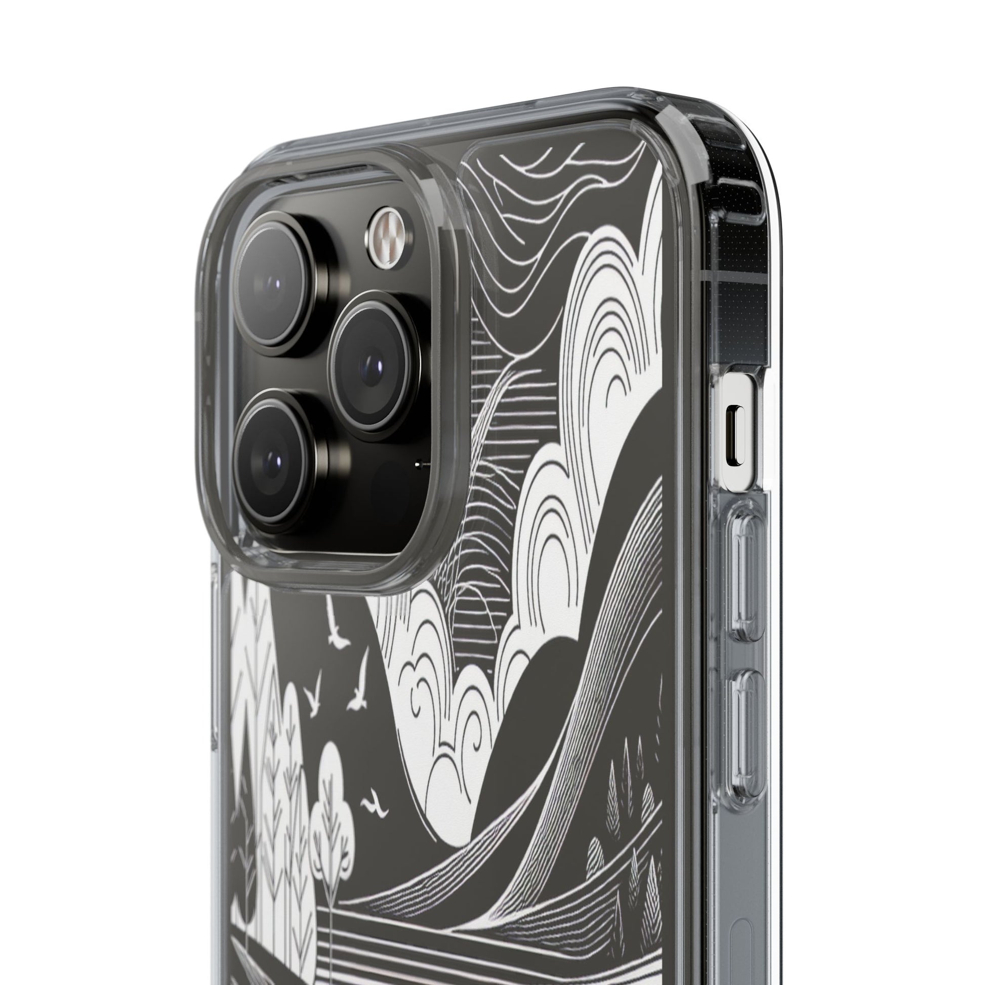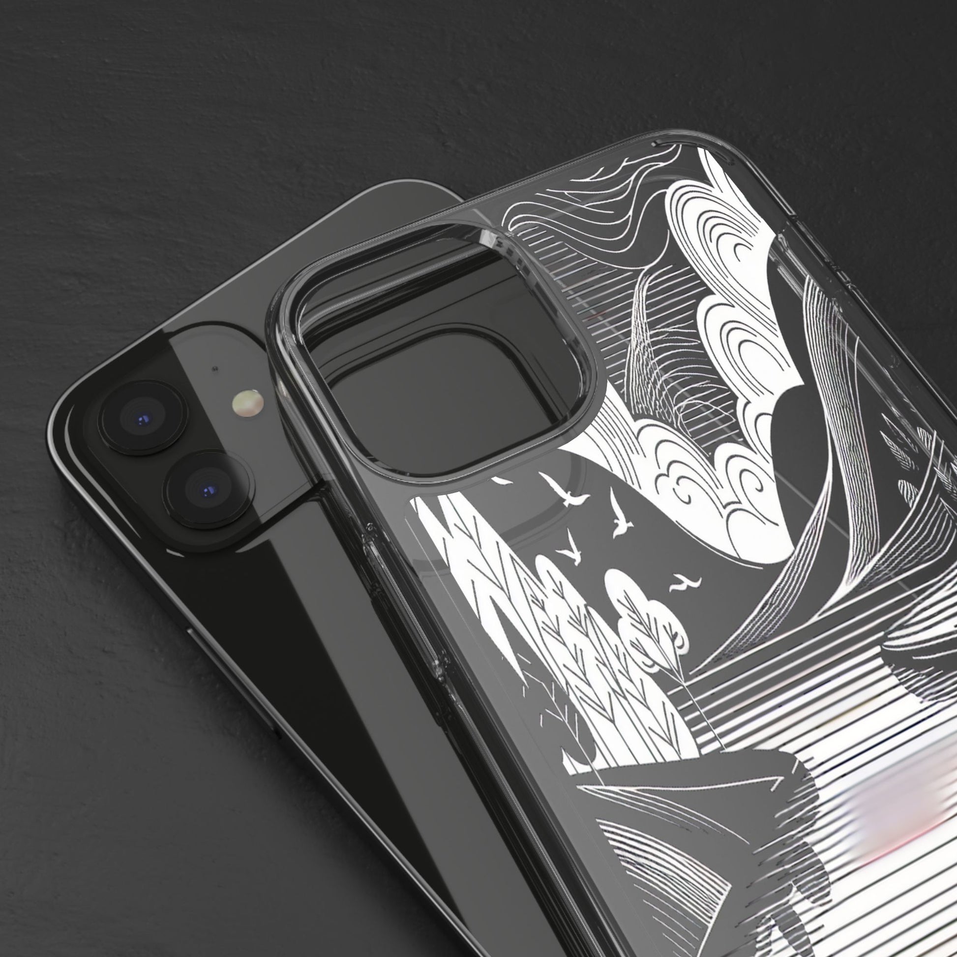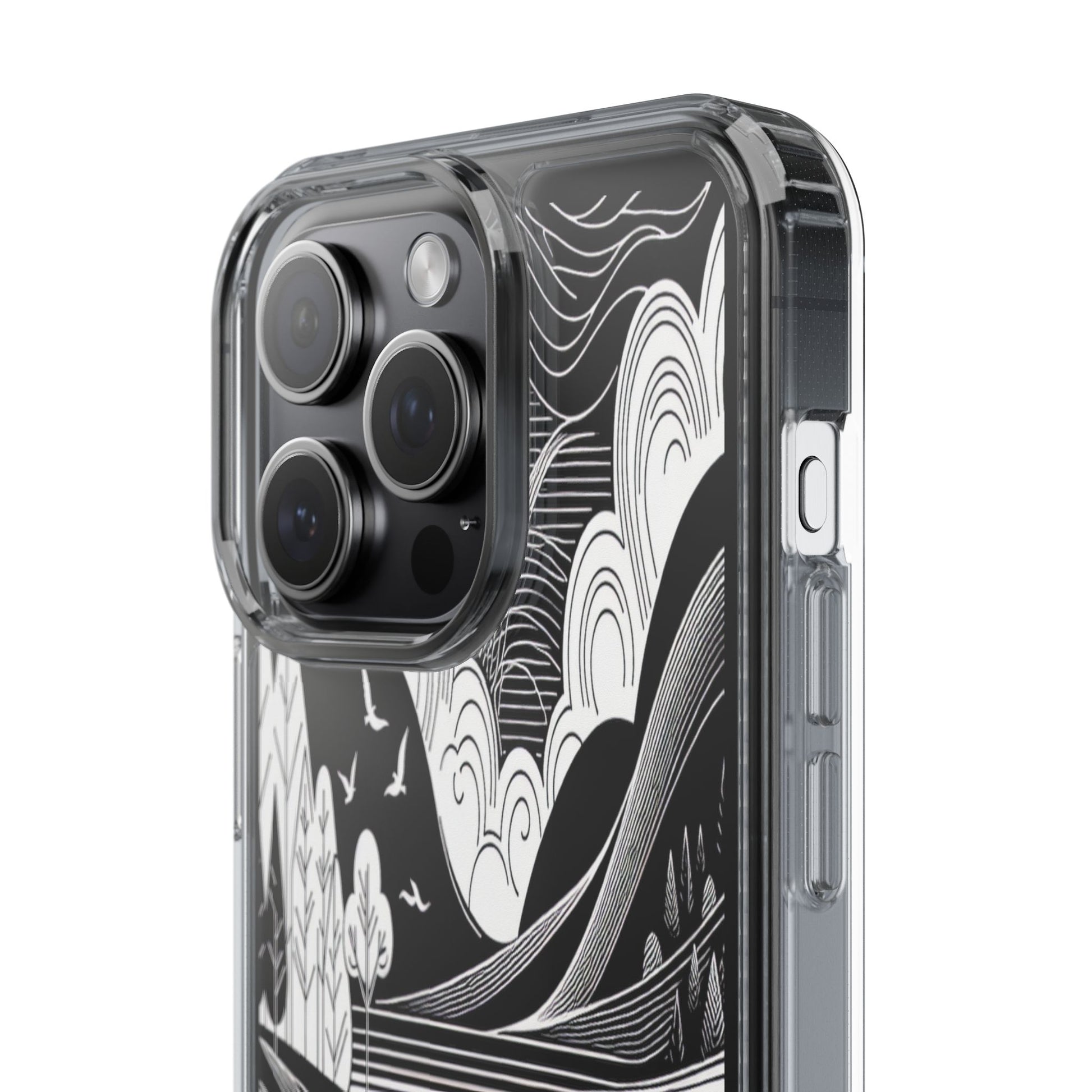 Stylized black and white landscape with sweeping lines and bold contrasts. Birds soar over abstract hills, and dynamic clouds swirl above a reflective lake, creating a harmonious blend of nature and geometry. Protect your phone while showcasing its sleek design with our customizable clear phone case, designed to fit iPhones from the latest iPhone 16 to earlier models like iPhone XR, XS, and X. This slim and lightweight case is perfect for guarding against daily wear and tear, offering shock-absorbing and scratch-resistant protection.
