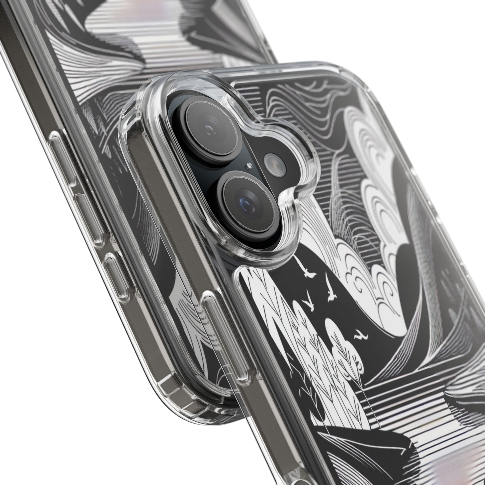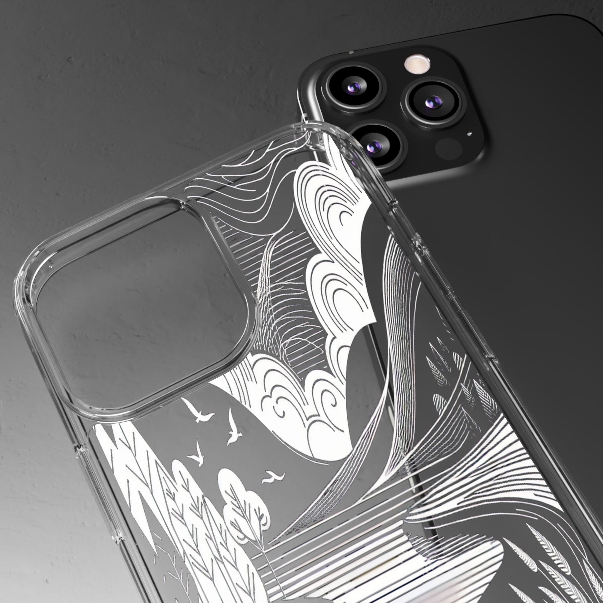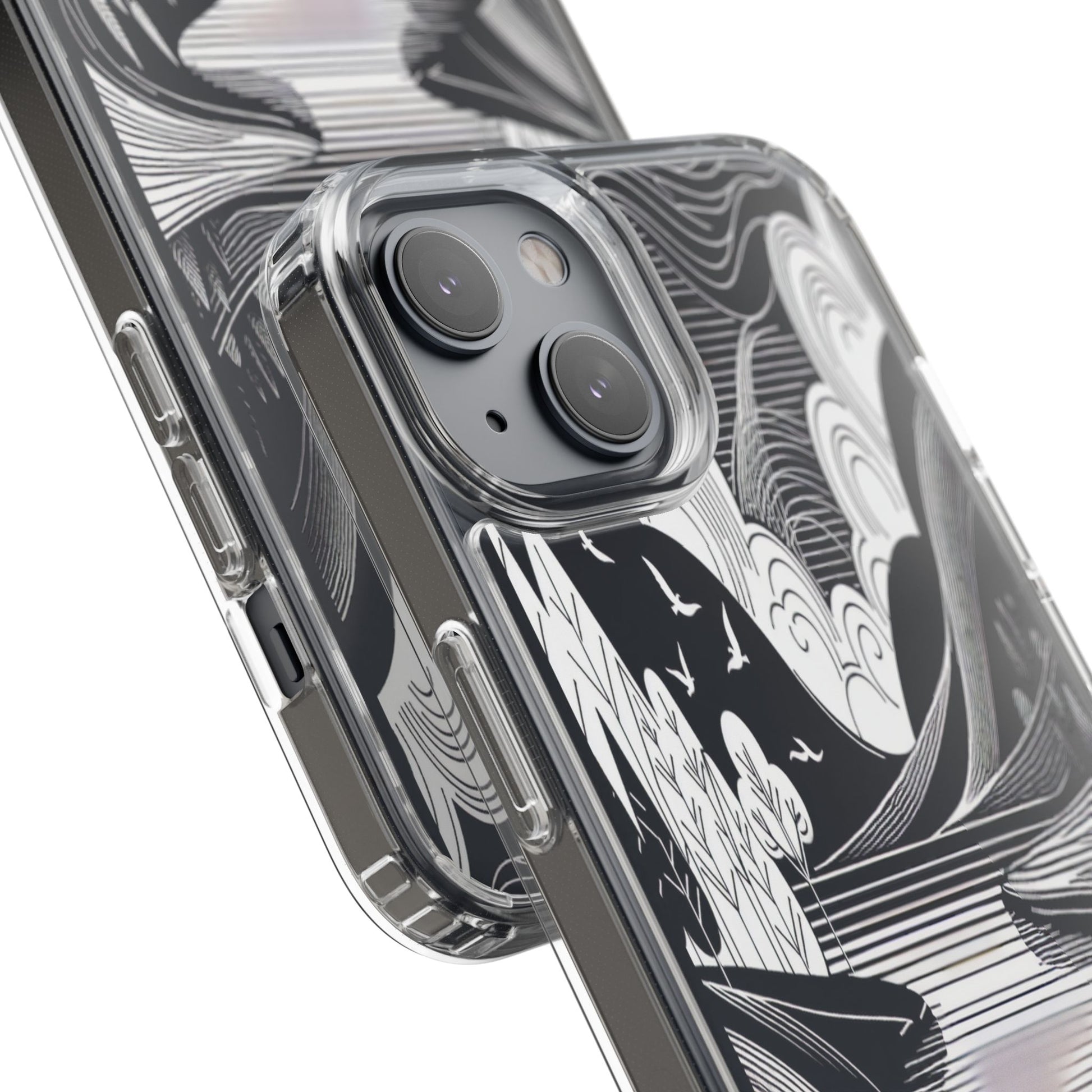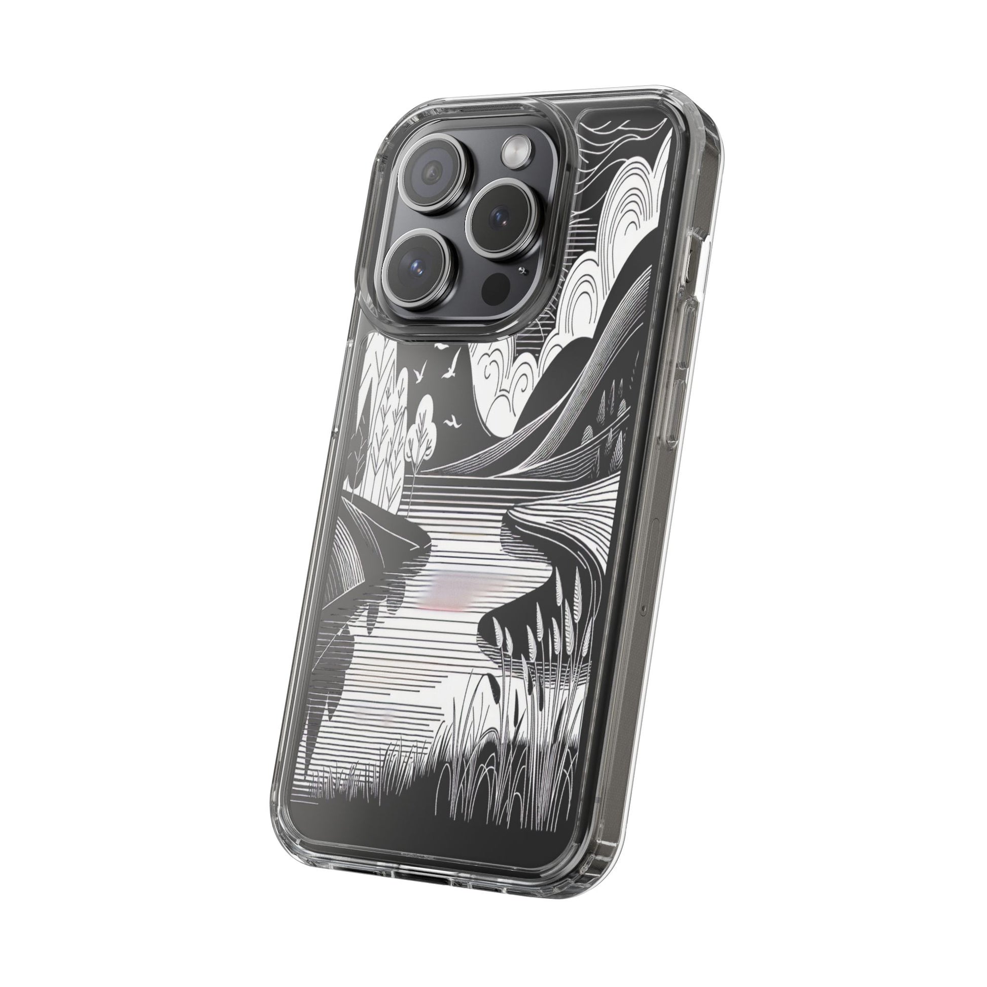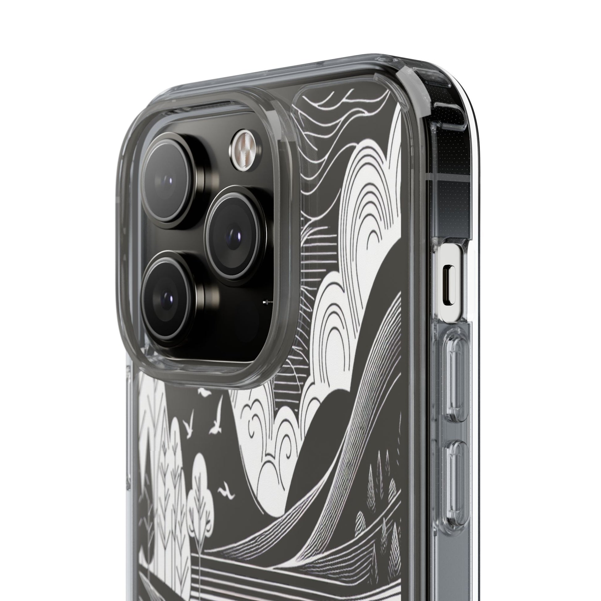 Stylized black and white landscape with sweeping lines and bold contrasts. Birds soar over abstract hills, and dynamic clouds swirl above a reflective lake, creating a harmonious blend of nature and geometry. Protect your phone while showcasing its sleek design with our customizable clear phone case, designed to fit iPhones from the latest iPhone 16 to earlier models like iPhone XR, XS, and X. This slim and lightweight case is perfect for guarding against daily wear and tear, offering shock-absorbing and scratch-resistant protection.