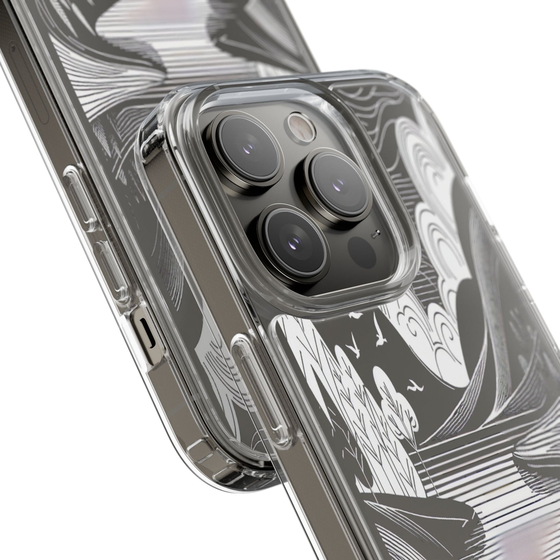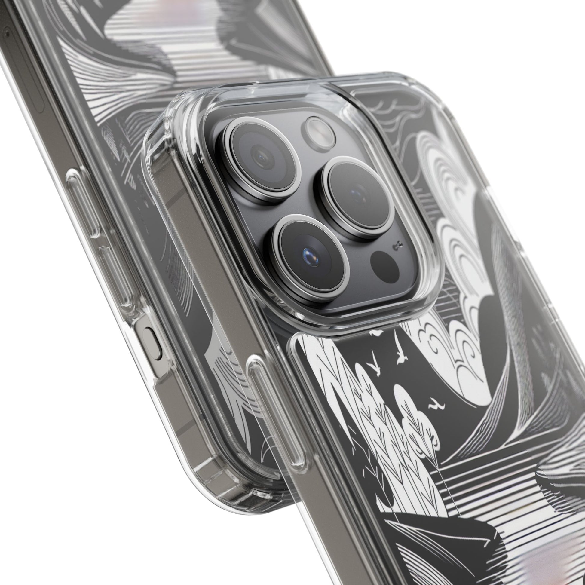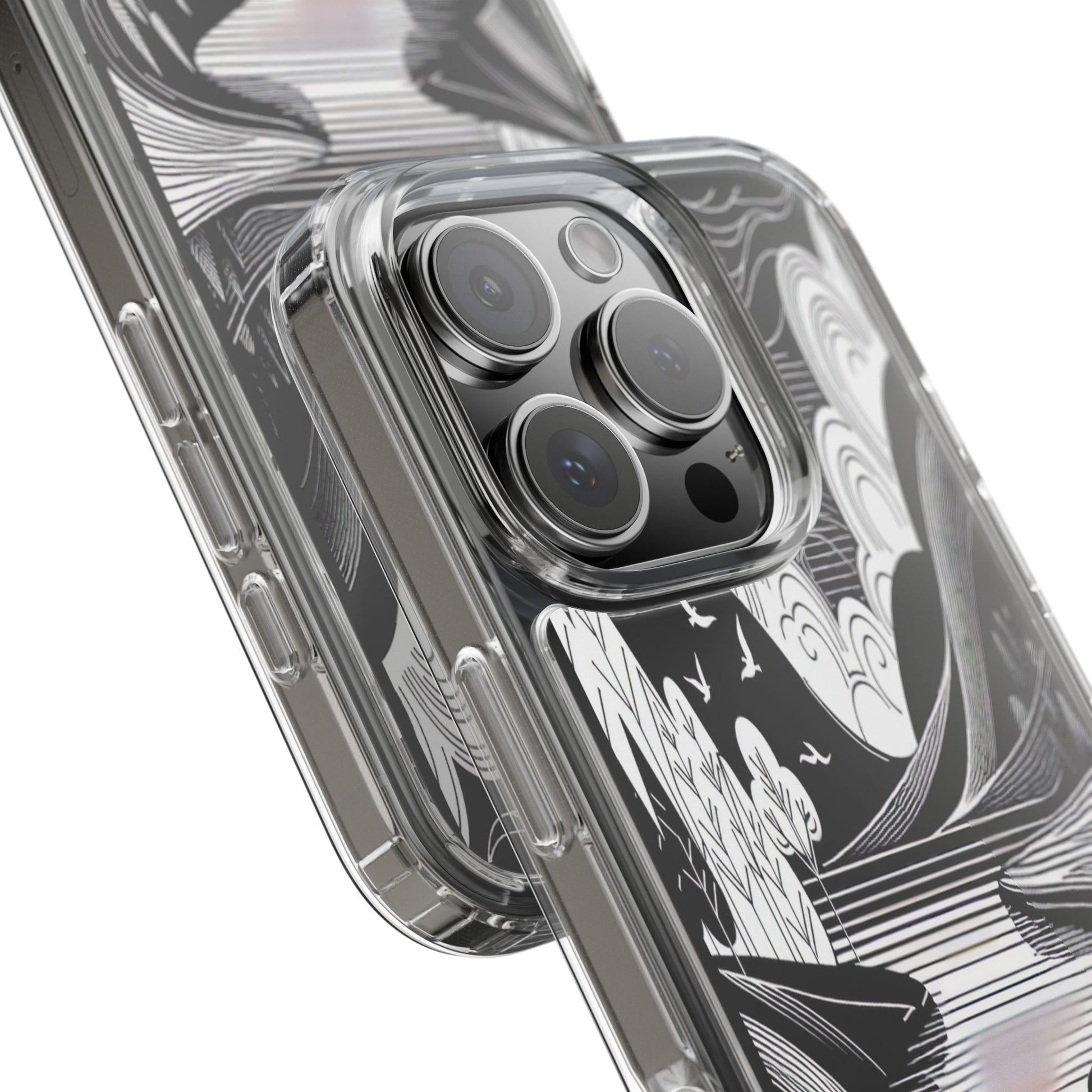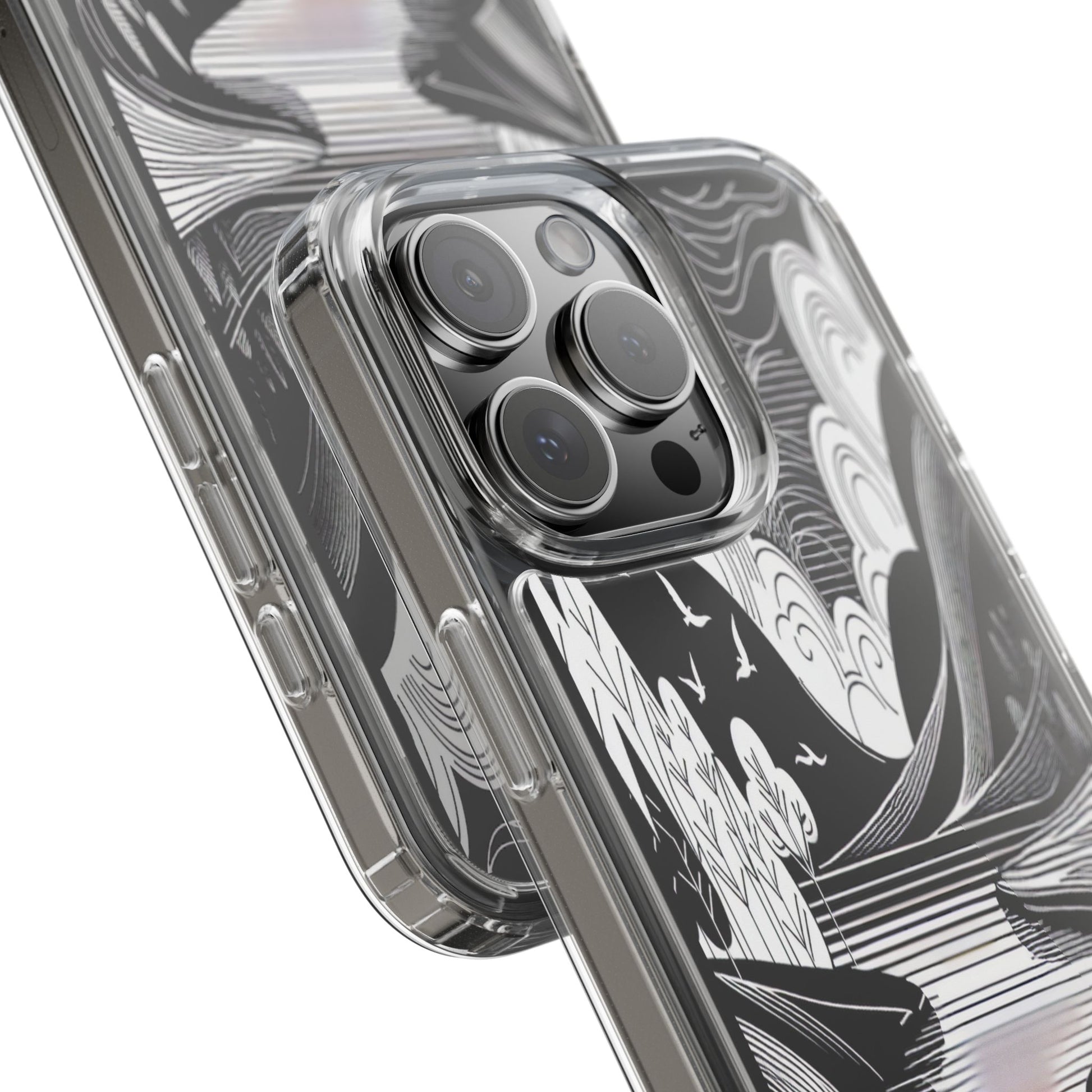 Stylized black and white landscape with sweeping lines and bold contrasts. Birds soar over abstract hills, and dynamic clouds swirl above a reflective lake, creating a harmonious blend of nature and geometry. Protect your phone while showcasing its sleek design with our customizable clear phone case, designed to fit iPhones from the latest iPhone 16 to earlier models like iPhone XR, XS, and X. This slim and lightweight case is perfect for guarding against daily wear and tear, offering shock-absorbing and scratch-resistant protection.