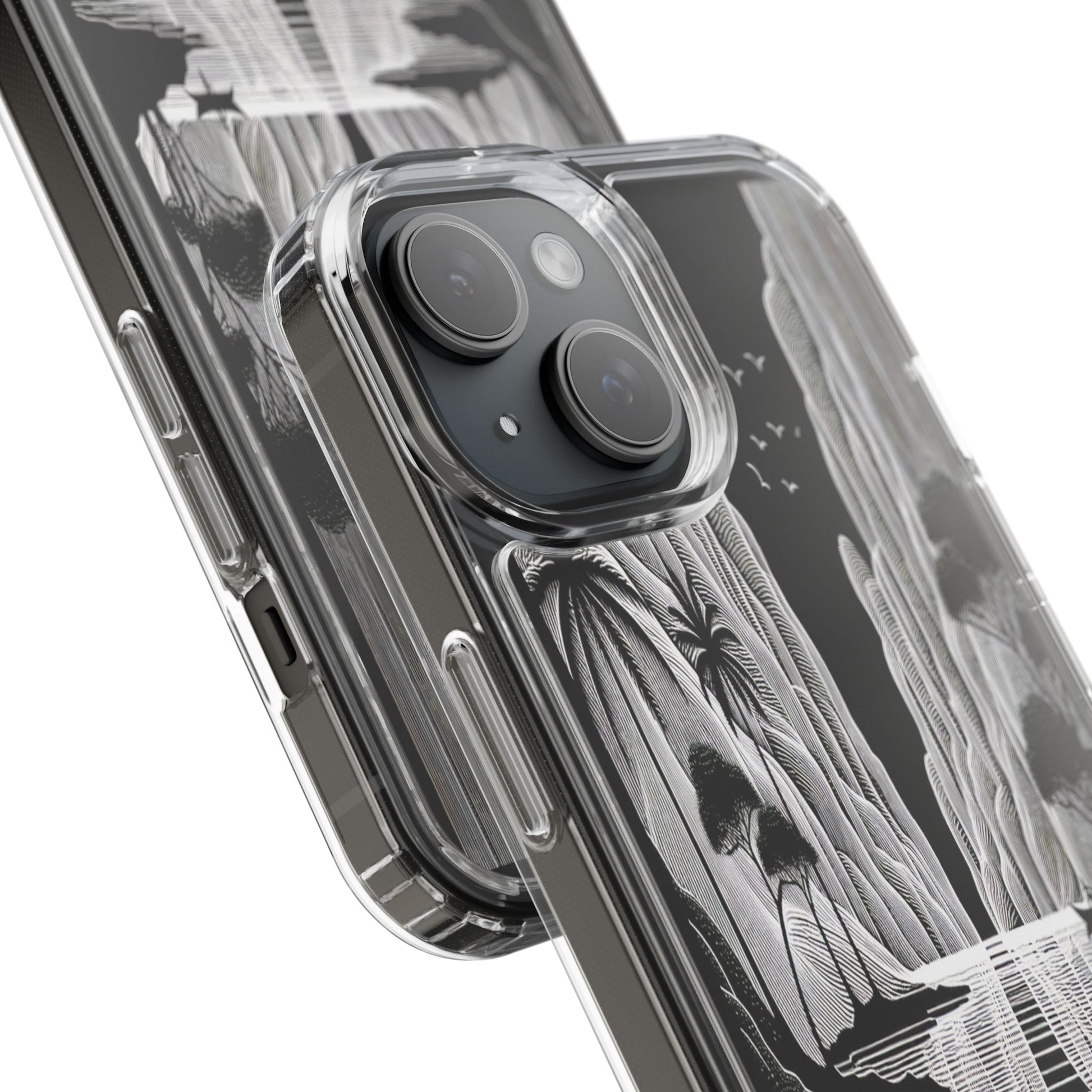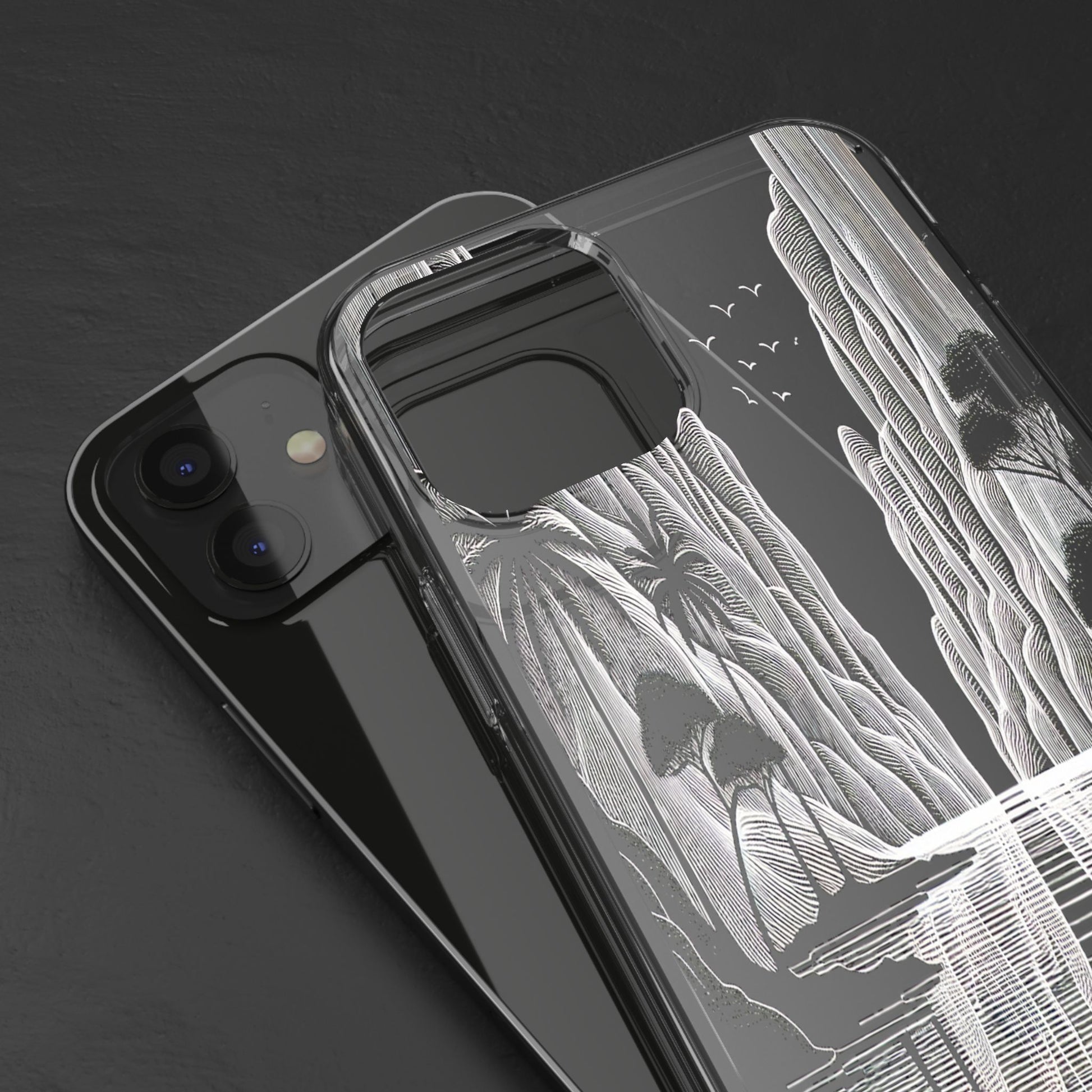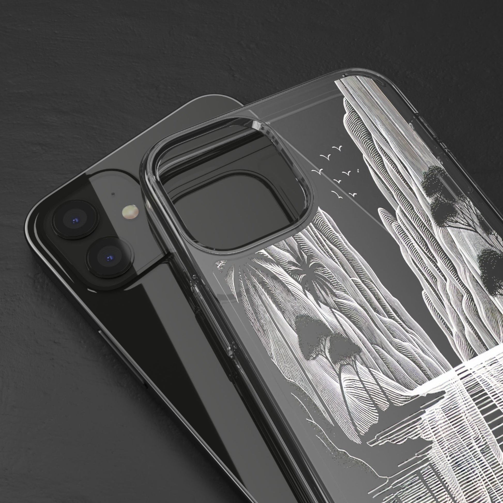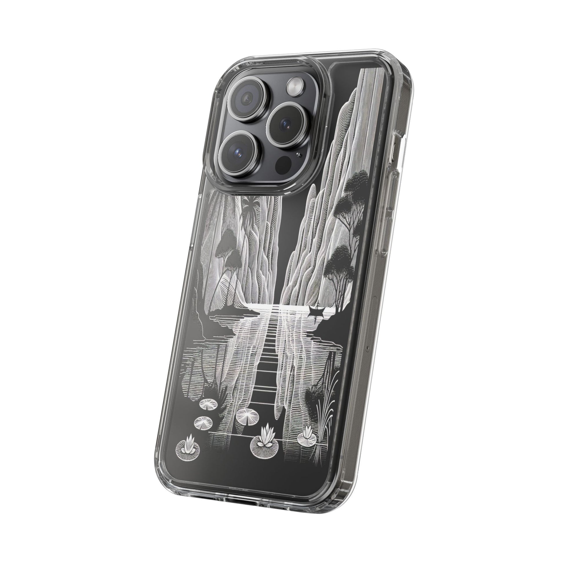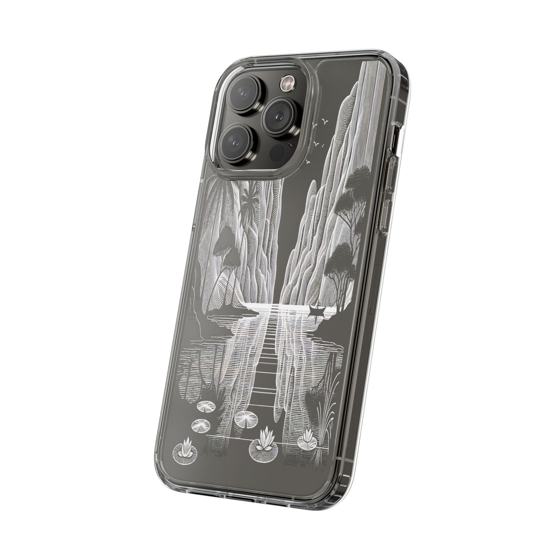 A surreal monochrome landscape composed of intricate line art, featuring towering cliffs, serene water lilies, and graceful birds. The scene's reflective water and stylized textures create a tranquil, dreamlike vista. Protect your phone while showcasing its sleek design with our customizable clear phone case, designed to fit iPhones from the latest iPhone 16 to earlier models like iPhone XR, XS, and X. This slim and lightweight case is perfect for guarding against daily wear and tear, offering shock-absorbing and scratch-resistant protection.