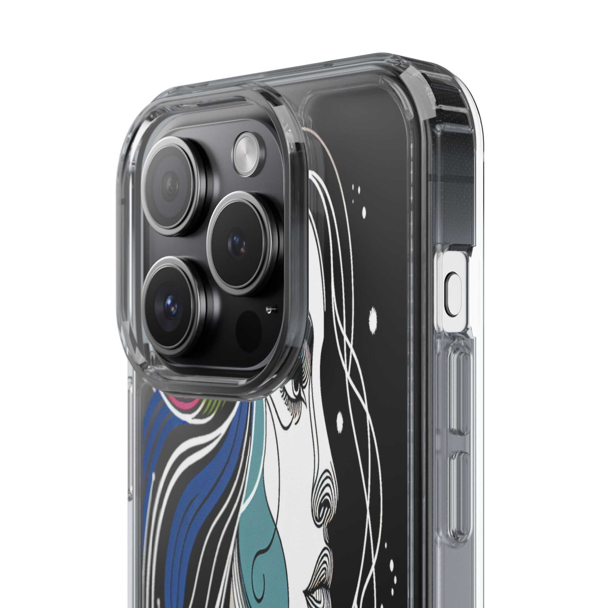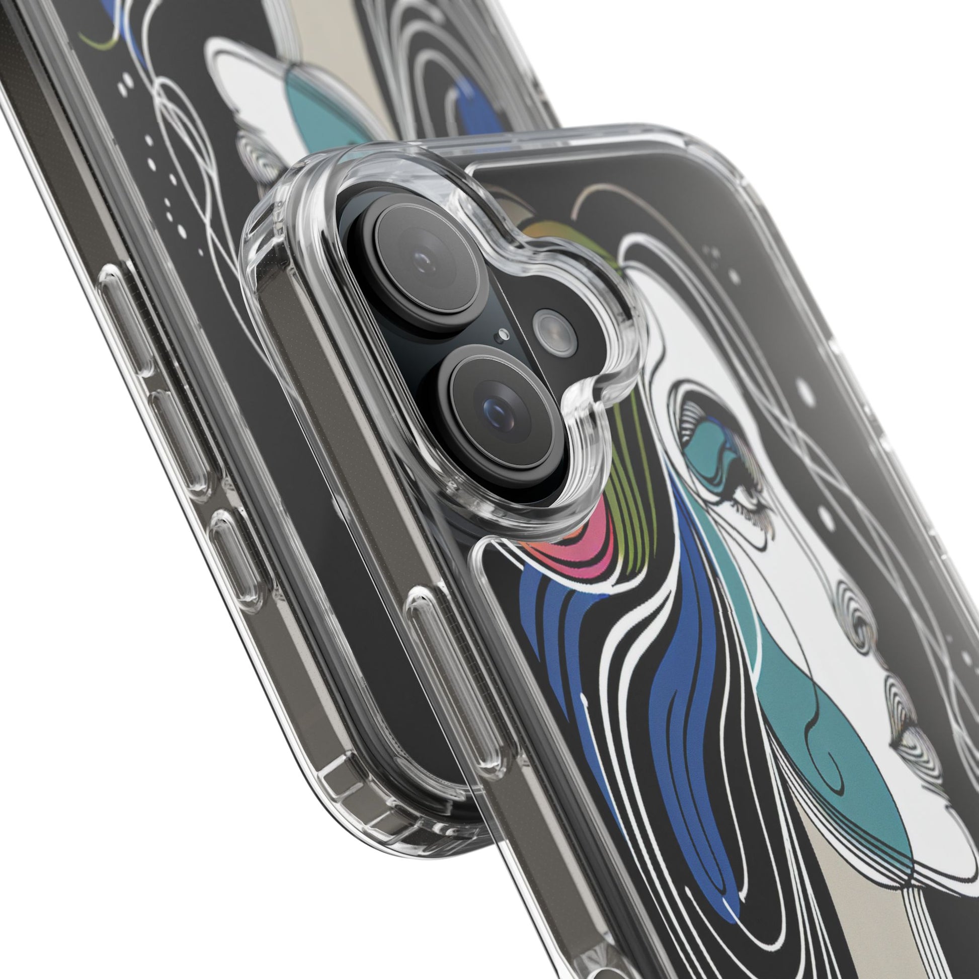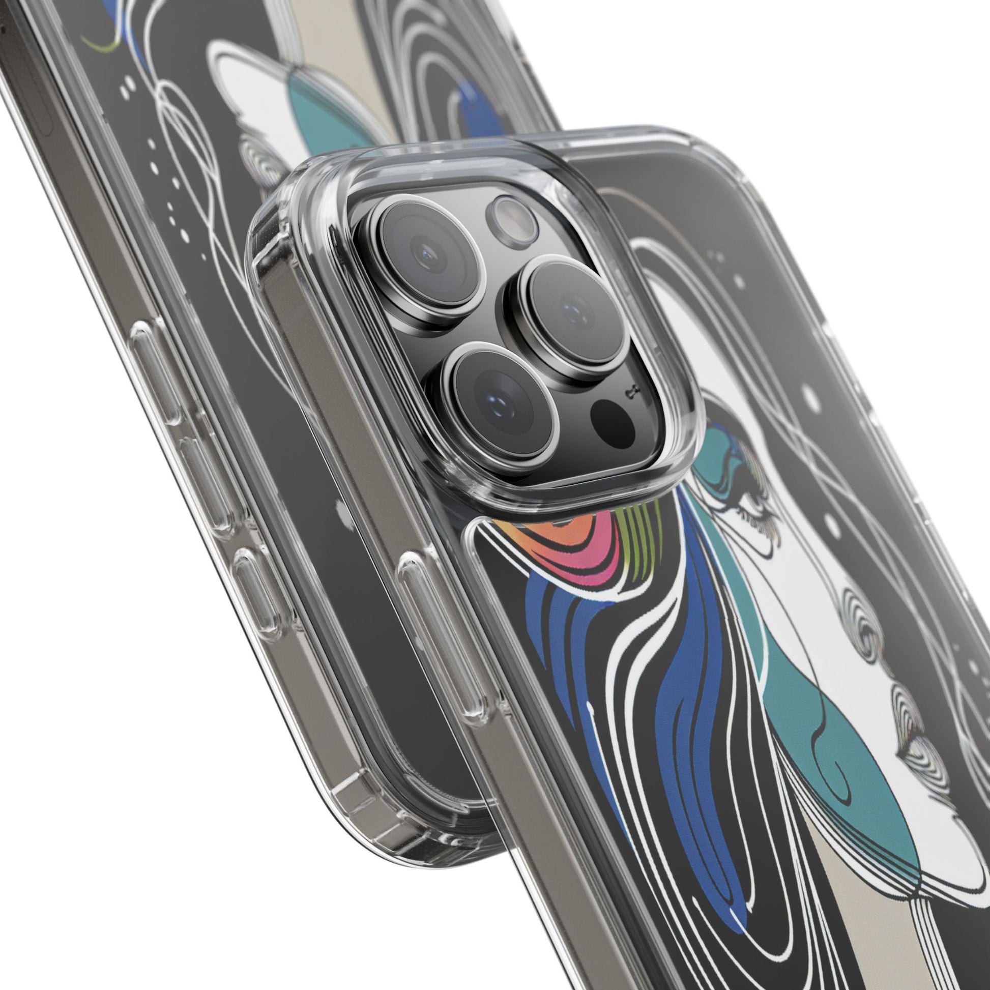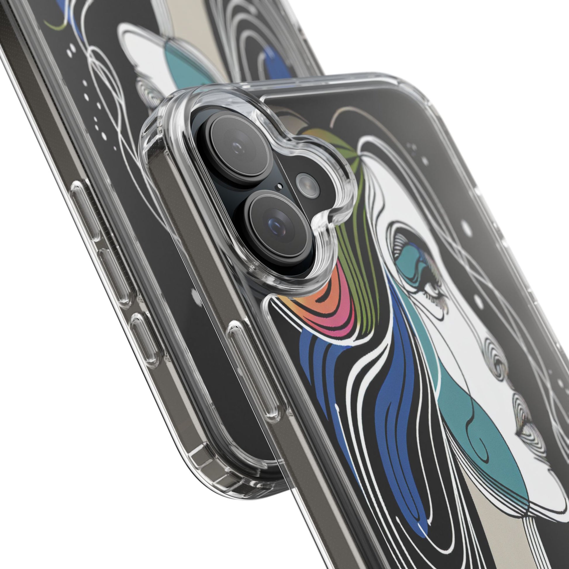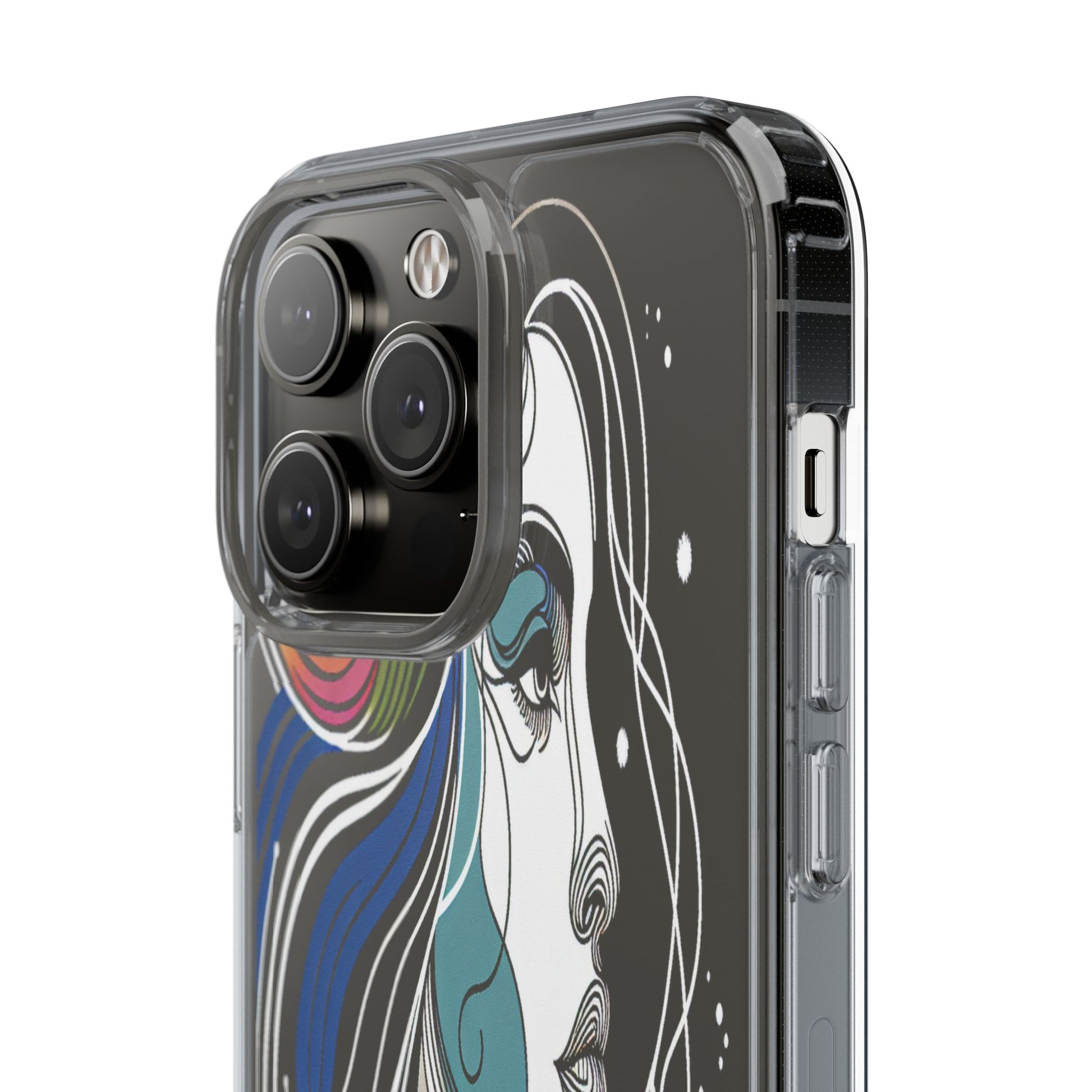 The image showcases an abstract female profile with swirling lines and vibrant colors. Fluid curves blend seamlessly, creating a harmonious flow of blues, greens, and reds. This artistic design exudes dynamic movement and elegance in its intricate detailing and vivid palette. Protect your phone while showcasing its sleek design with our customizable clear phone case, designed to fit iPhones from the latest iPhone 16 to earlier models like iPhone XR, XS, and X. This slim and lightweight case is perfect for guarding against daily wear and tear, offering shock-absorbing and scratch-resistant protection.