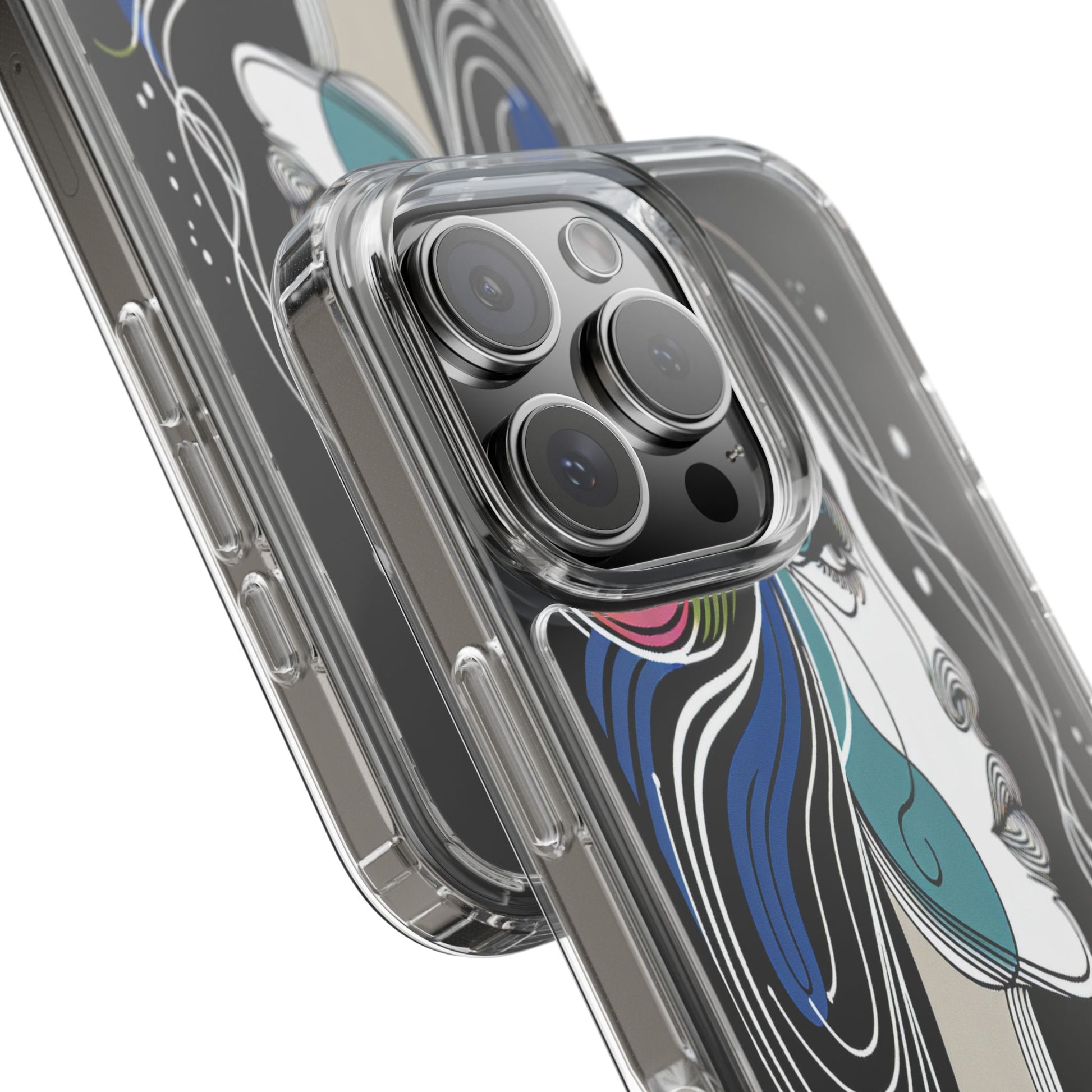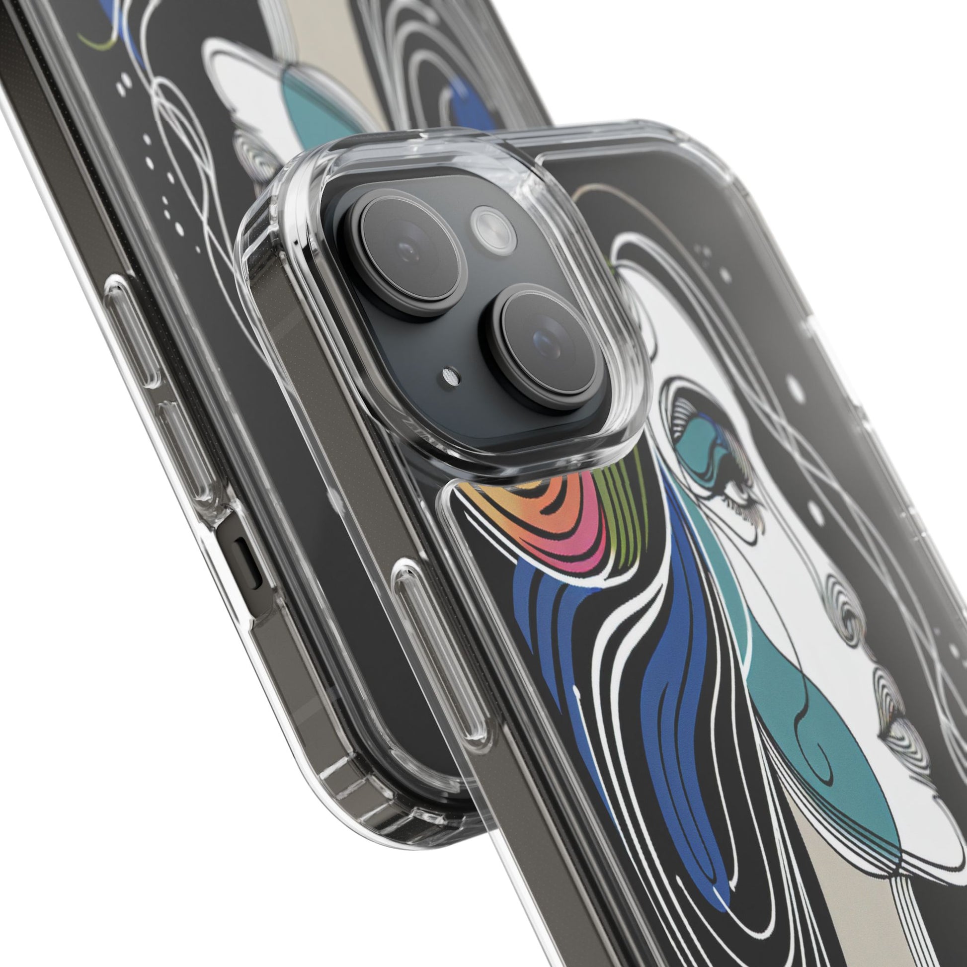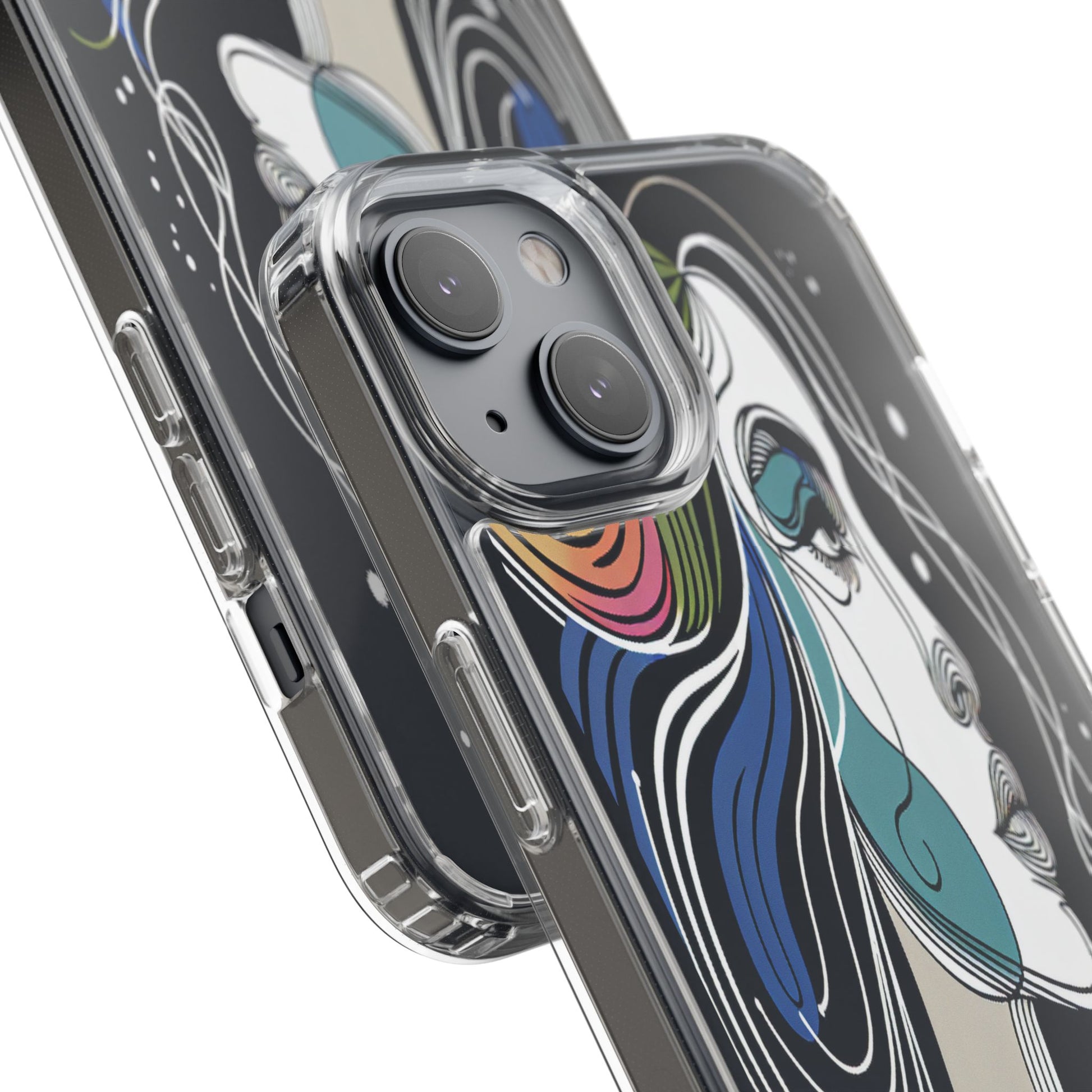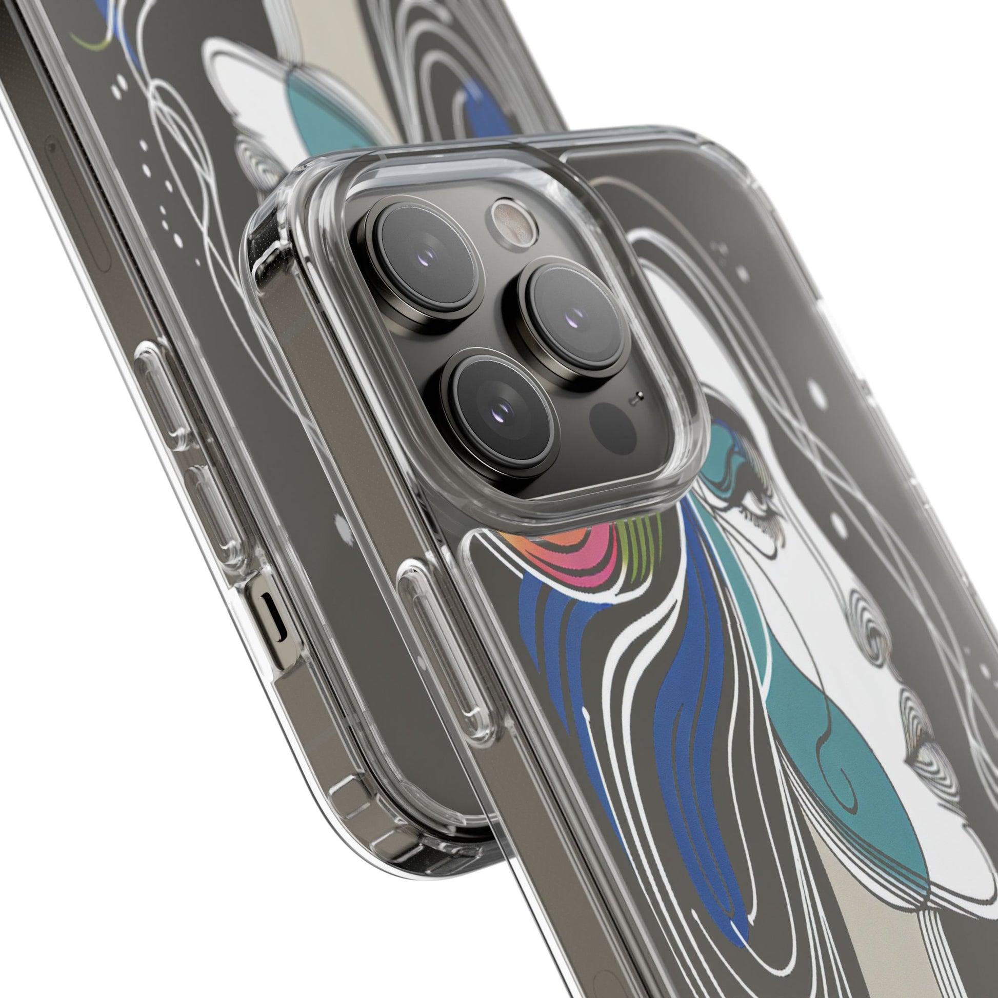 The image showcases an abstract female profile with swirling lines and vibrant colors. Fluid curves blend seamlessly, creating a harmonious flow of blues, greens, and reds. This artistic design exudes dynamic movement and elegance in its intricate detailing and vivid palette. Protect your phone while showcasing its sleek design with our customizable clear phone case, designed to fit iPhones from the latest iPhone 16 to earlier models like iPhone XR, XS, and X. This slim and lightweight case is perfect for guarding against daily wear and tear, offering shock-absorbing and scratch-resistant protection.